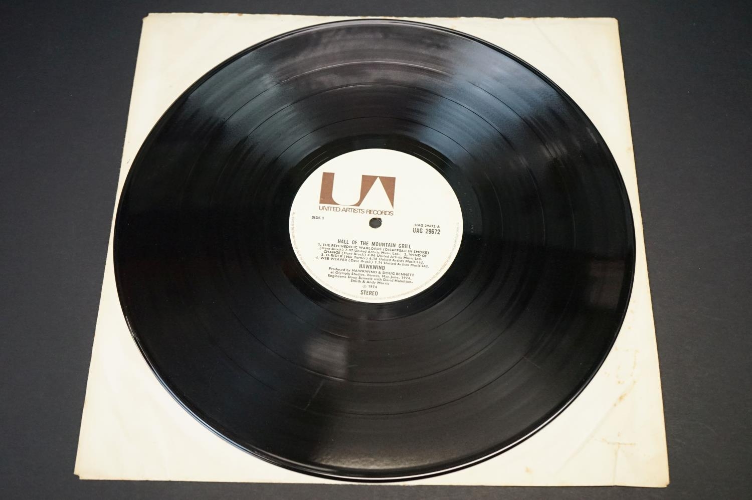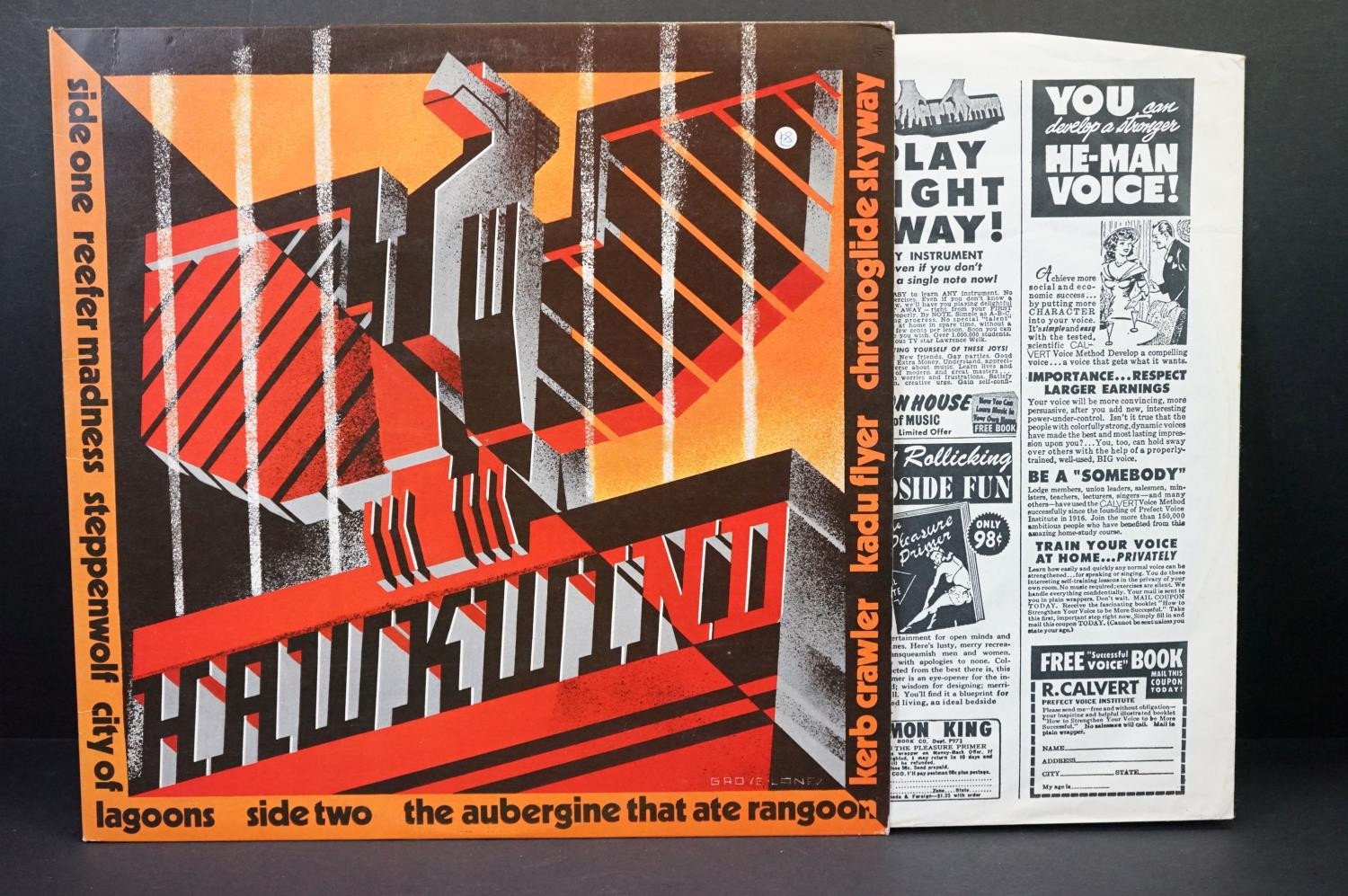 Vinyl – 8 Hawkwind albums to include Doremi Fasol Latido (Original UK with rare poster and printed inner), In Search Of Space (UK with log book), Hall Of The Mountain Grill (UK with Fully Laminated Sleeve), Warrior On The Edge Of Tune (UK with Printed Inners), Roadhawks (UK with Rare Poster), Astounding Sounds, Amazing Music (UK with Mis-Print back to front Picture Sleeve and Printed Inner), Masters Of The Universe (Original UK), Hawkwind (Sunset labels). Condition varies but Vg+ overall