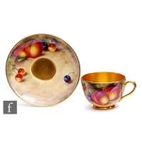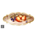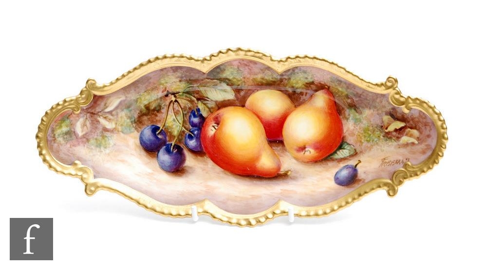 A Royal Worcester Fallen Fruits shaped dish decorated by Freeman with hand painted pears and cherries, signed, black printed mark, length 25.5cm.