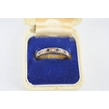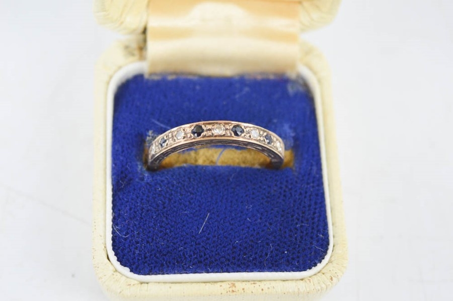 A 9ct gold band set with diamonds and sapphires, size P, 2.6g.