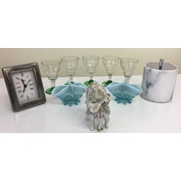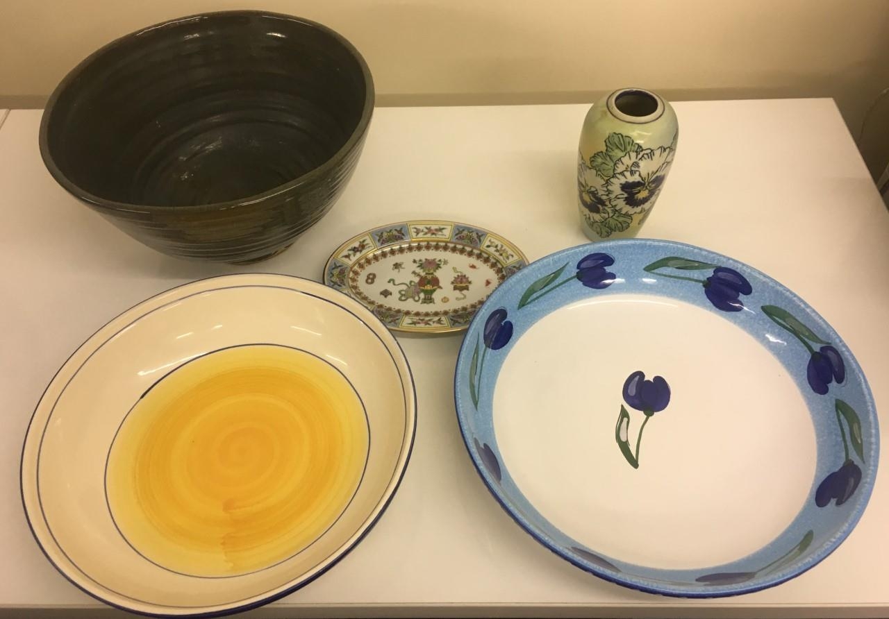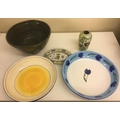 A mixed lot of five ceramic pieces. Includes two large serving bowls, a hand-painted bud vase, an oriental small plate and a green large plant-holder.