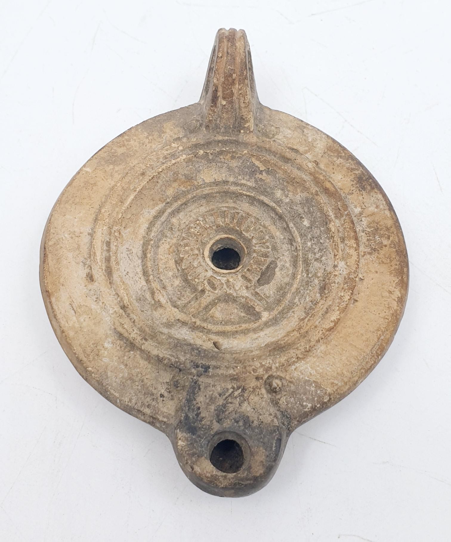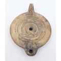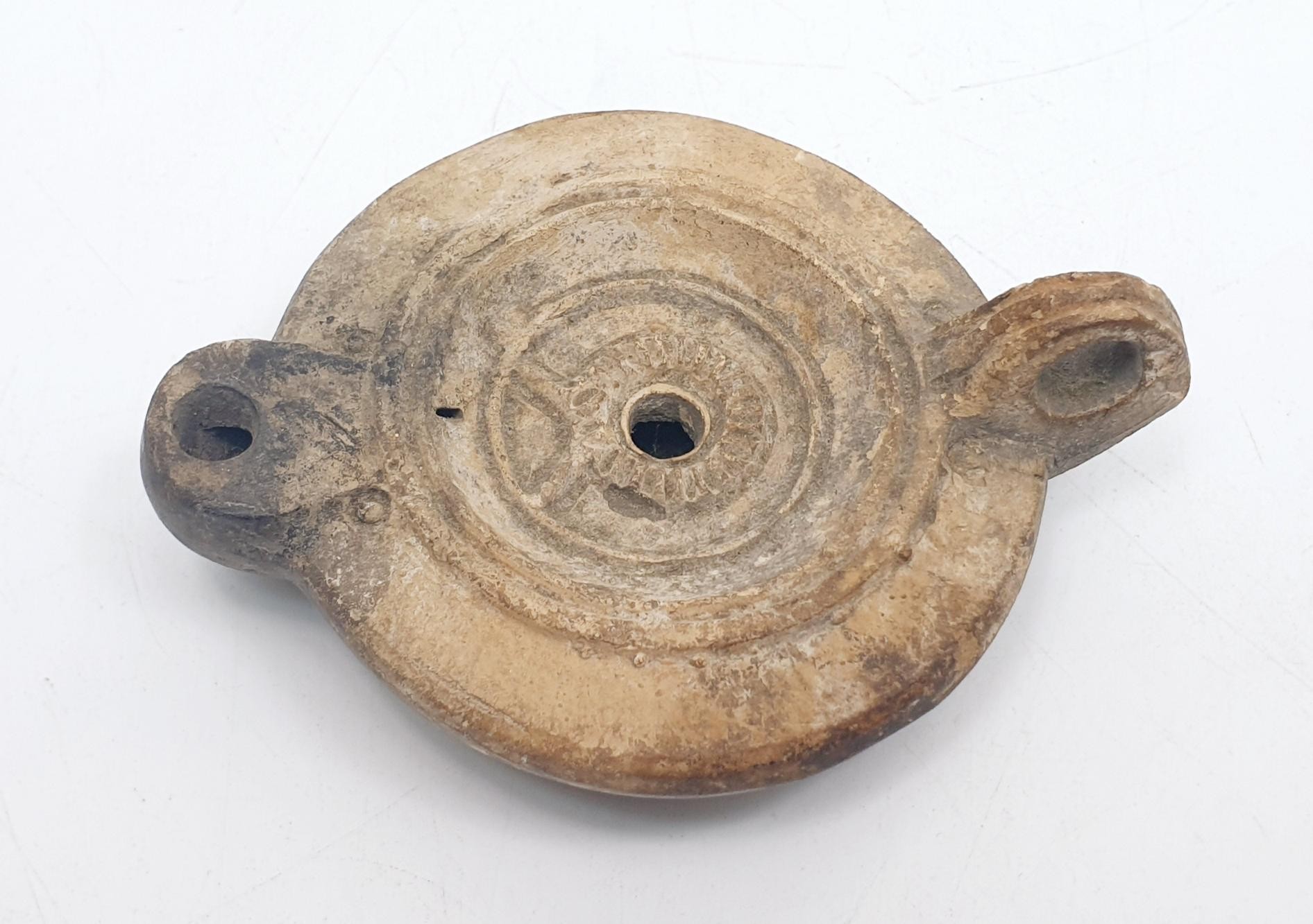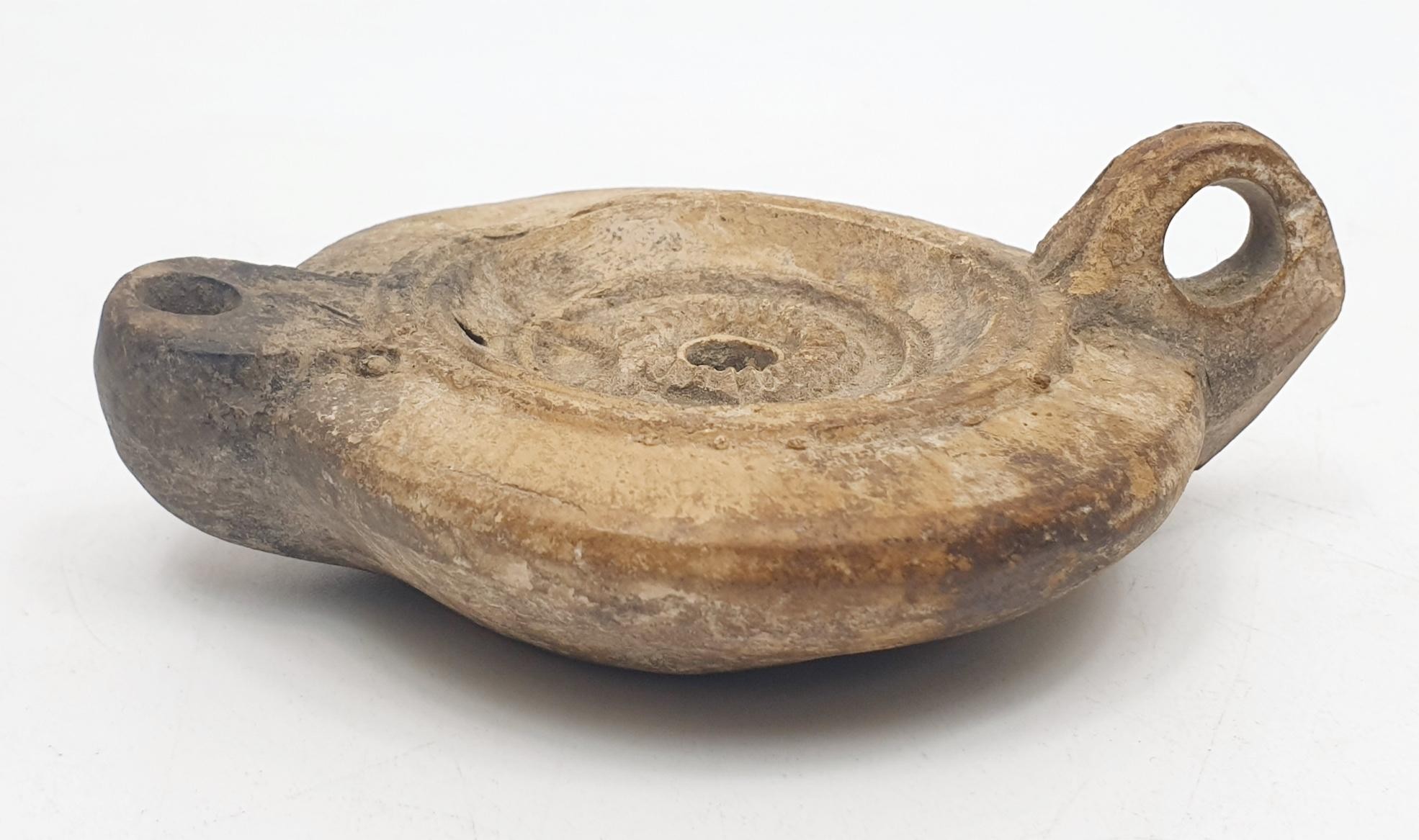 An ancient Roman ceramic oil lamp, width 11cm. No shipping. Arrange collection or your own packer and shipper, please. Electricals are sold as scrap.