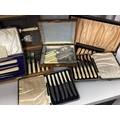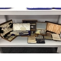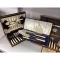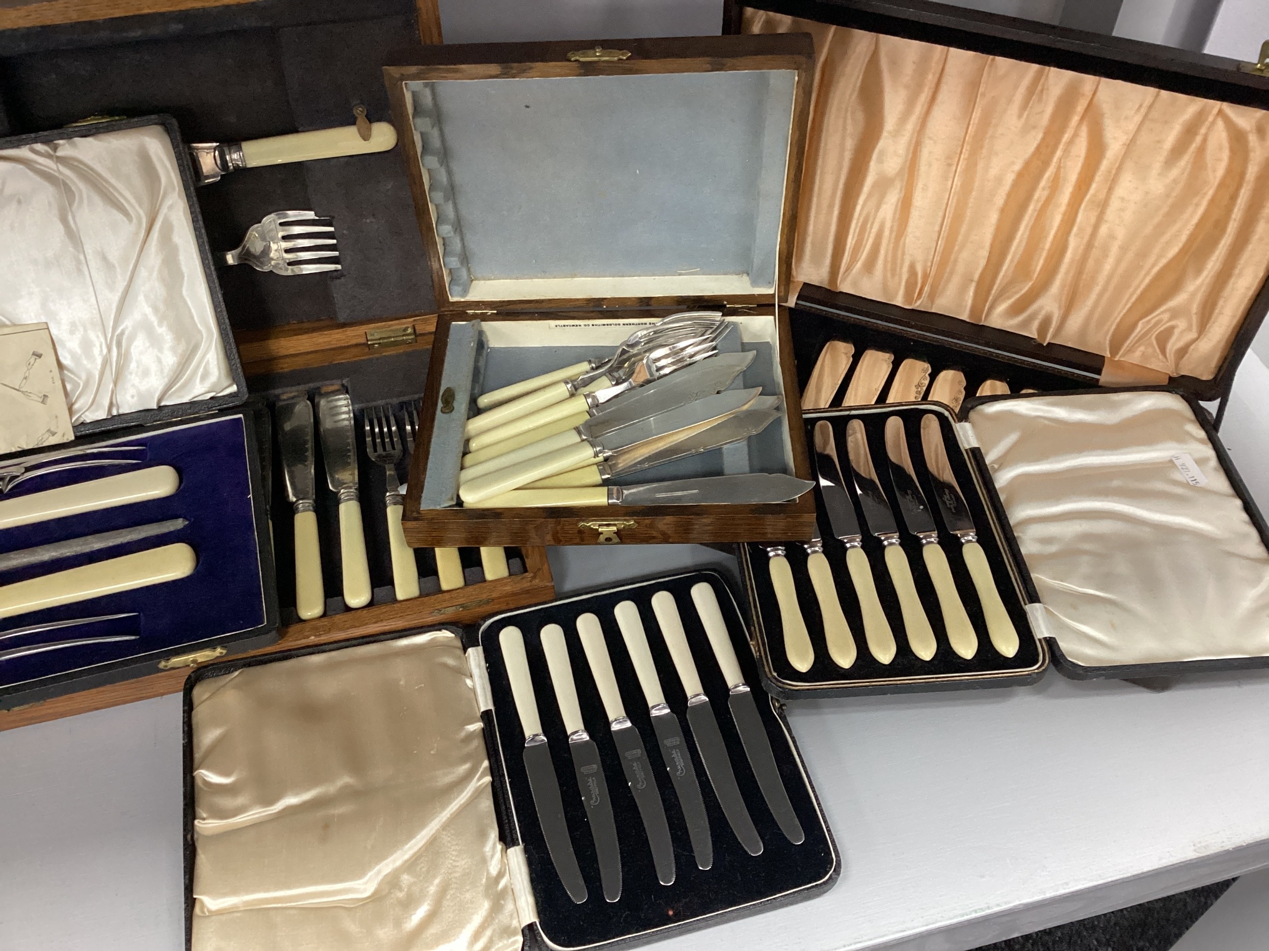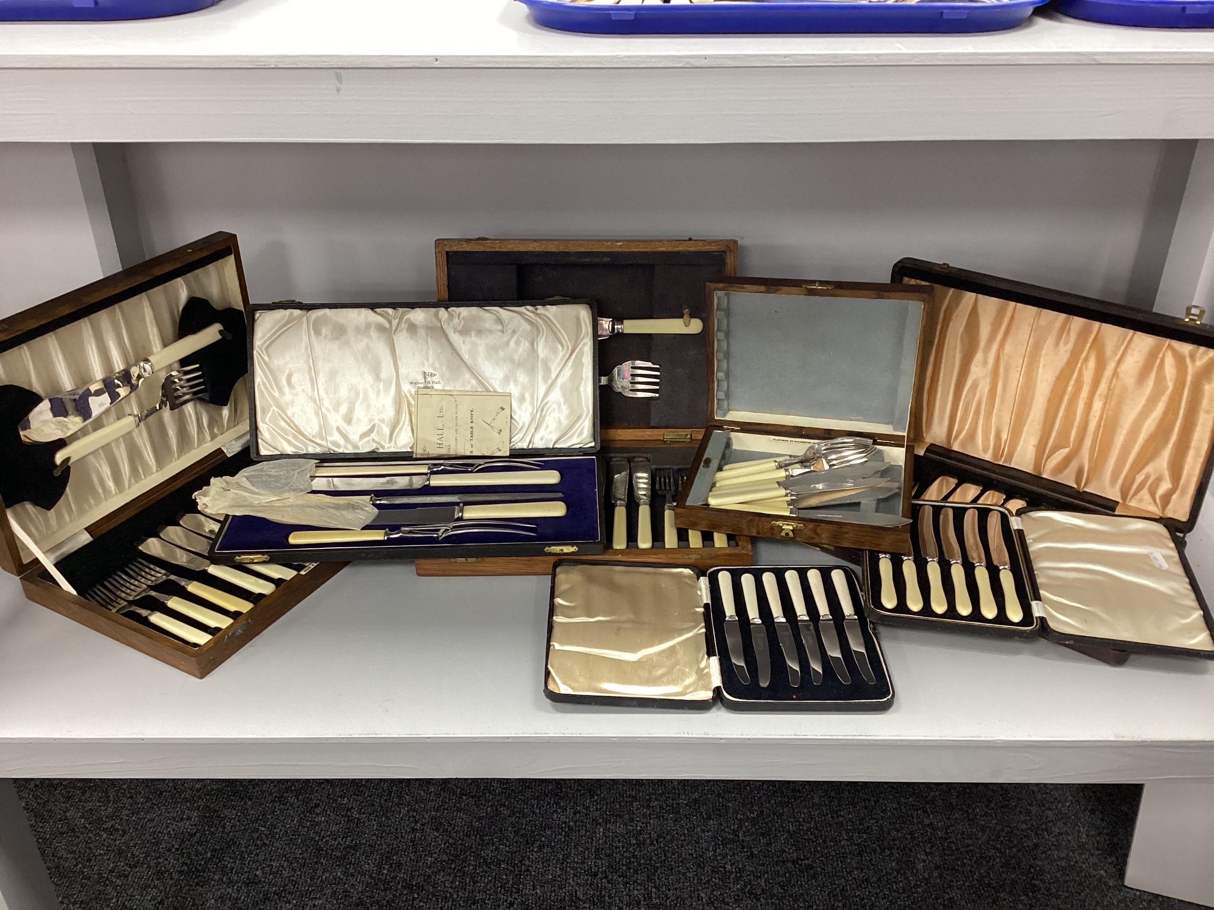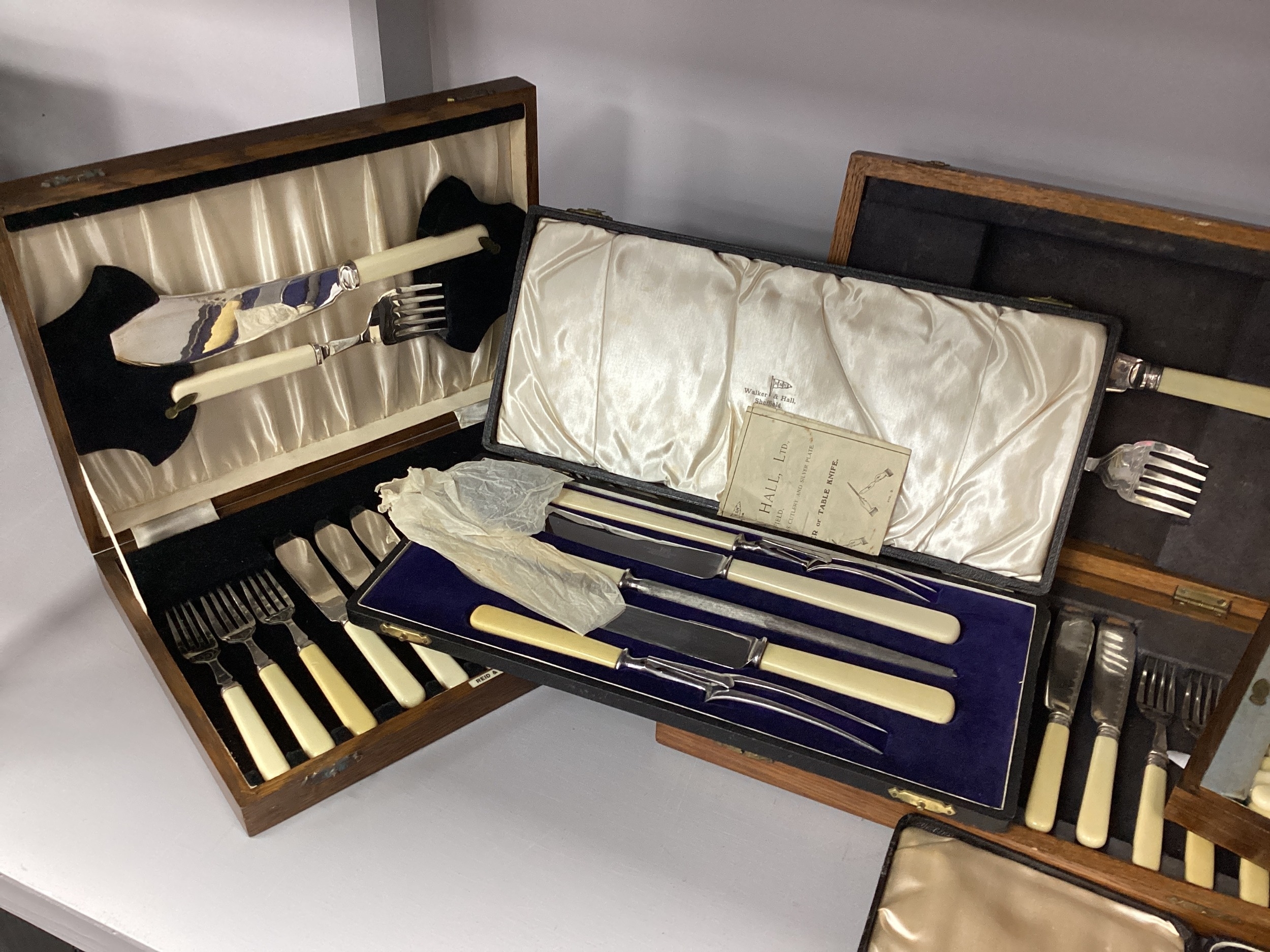Walker & Hall; An Ivorine Handled Cased Carving Set, together with further cased ivorine handled flatware, including fish knives and forks, butter knives, etc.