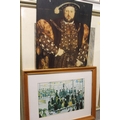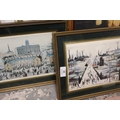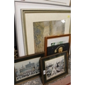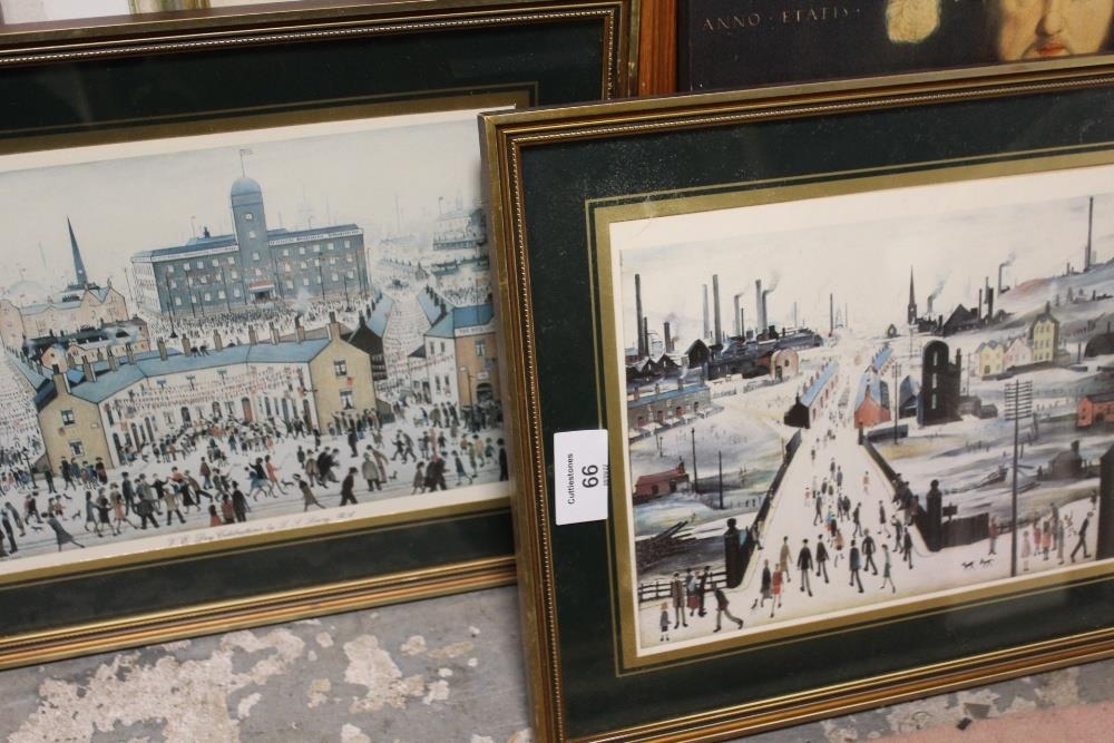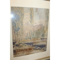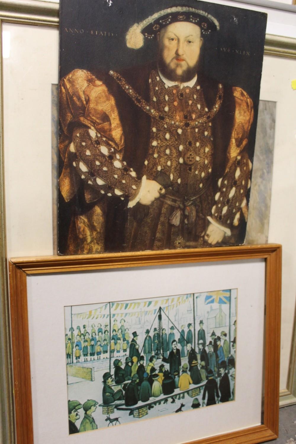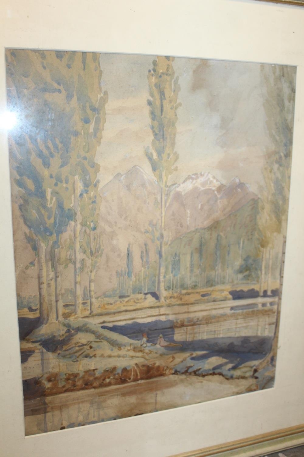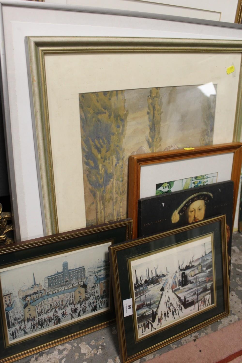 A FRAMED AND GLAZED WATERCOLOUR OF A MOUNTAINOUS RIVER SCENE SIGNED LOWER RIGHT 42CM X 33CM TOGETHER WITH A COLLECTION OF L.S LOWRY PRINTS, PICTURE FRAMES ETC.