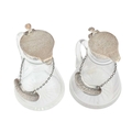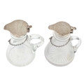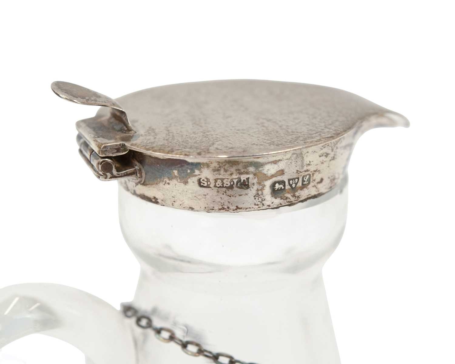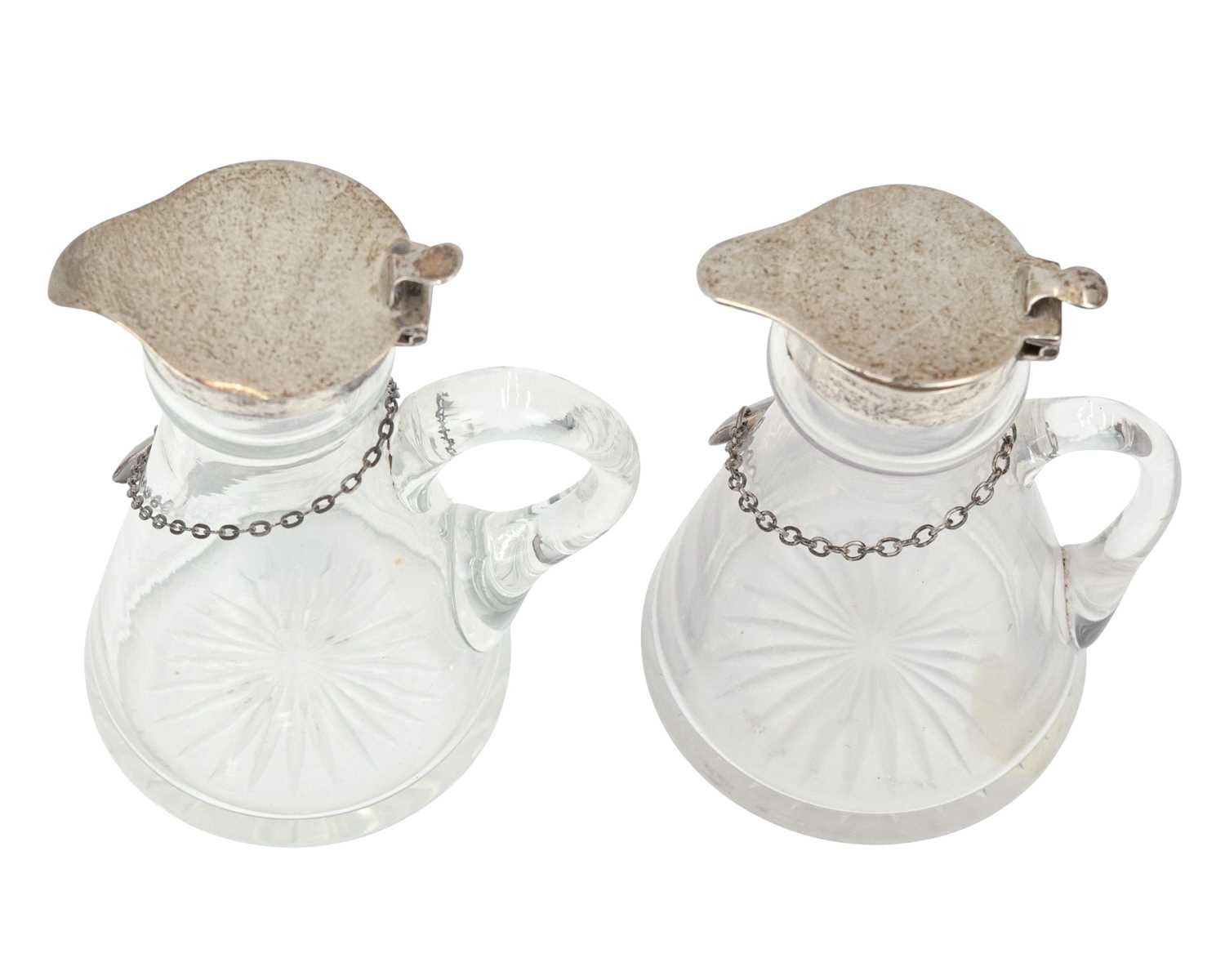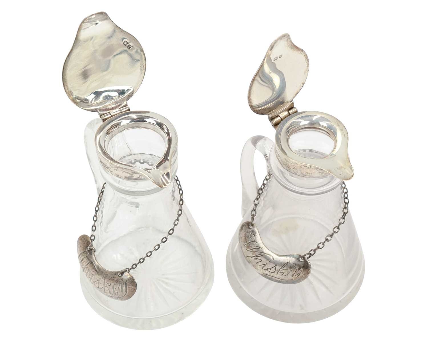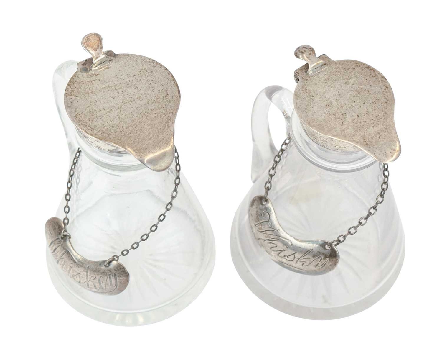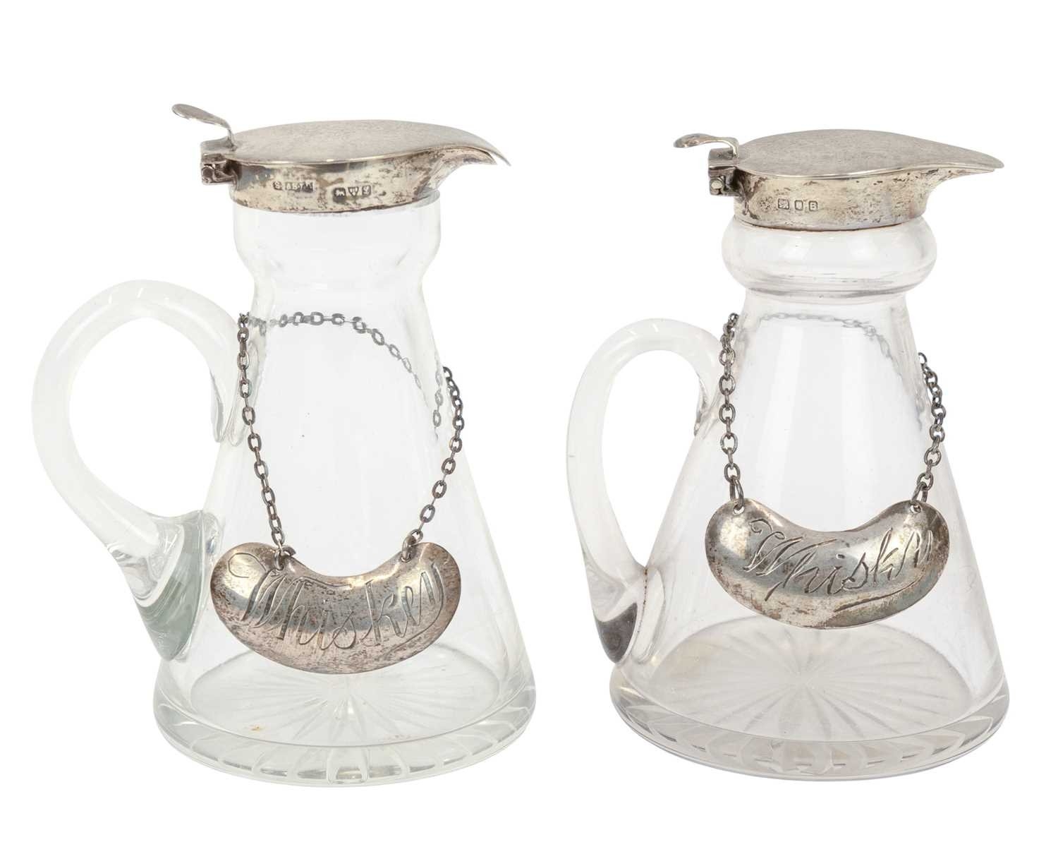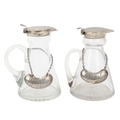Two silver mounted cut glass whisky noggins. The hinged covers marked for Chester, 1911, and London, 1937, height 10cm, each with a silver label (2).
