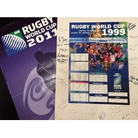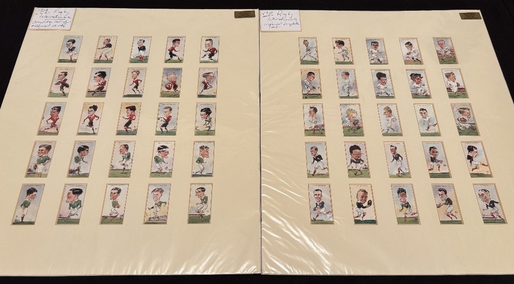 1929 Large mounted set of Wills Rugby Cigarette Cards (2 boards): Great pair of identically sized and shaped cream boards, each featuring crisp machine-cut windows for 25 of the 50-card coloured set from nearly a century ago. Caricatures of famous players from the four home countries, a great chance to frame and display. Excellent