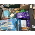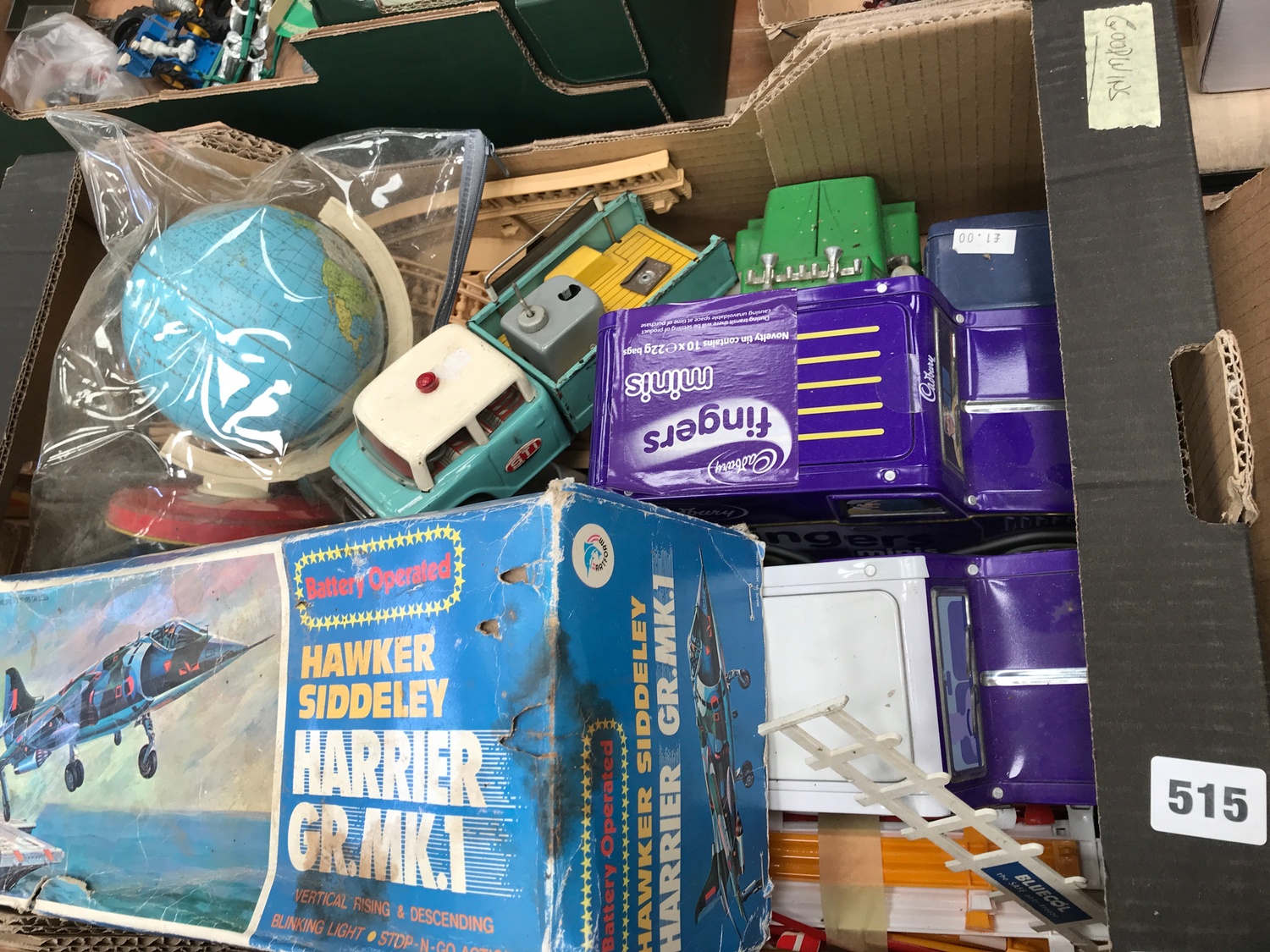 SUNDRY LOT OF MIXED TIN TOYS INCLUDING A CHINESE TIN RECOVERY LORRY SOME SCALEXTRIC EQUIPMENT AND A BOXED BATTERY OPERATED HAWKER SIDLEY HARRIER GR MARK 1 AND A TIN GLOBE