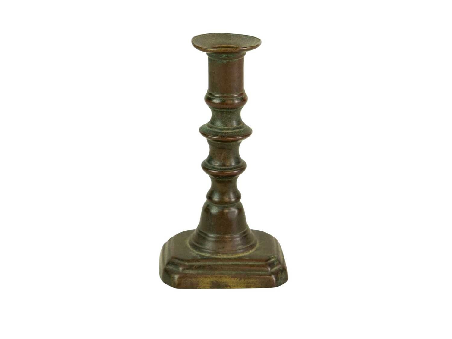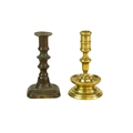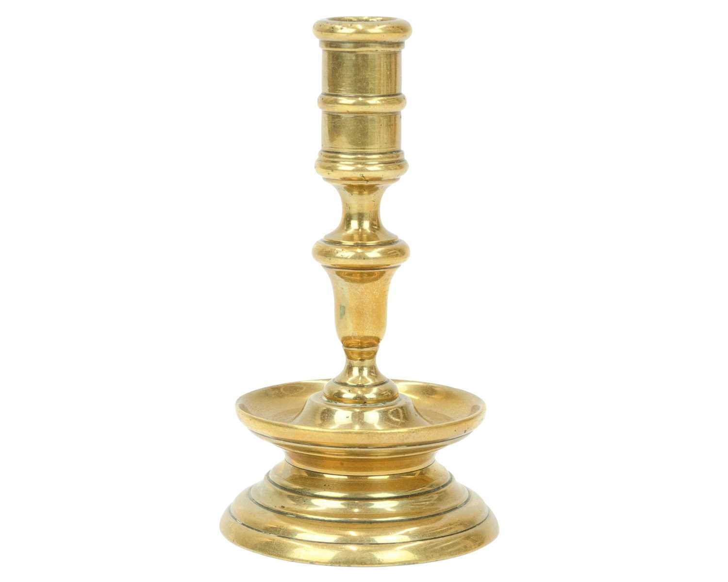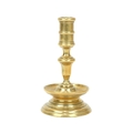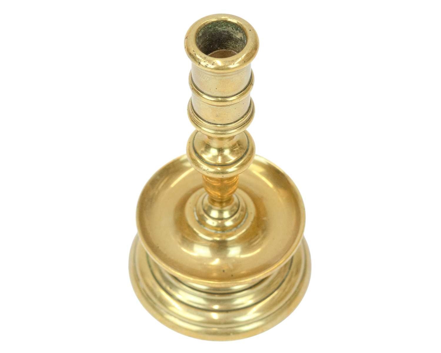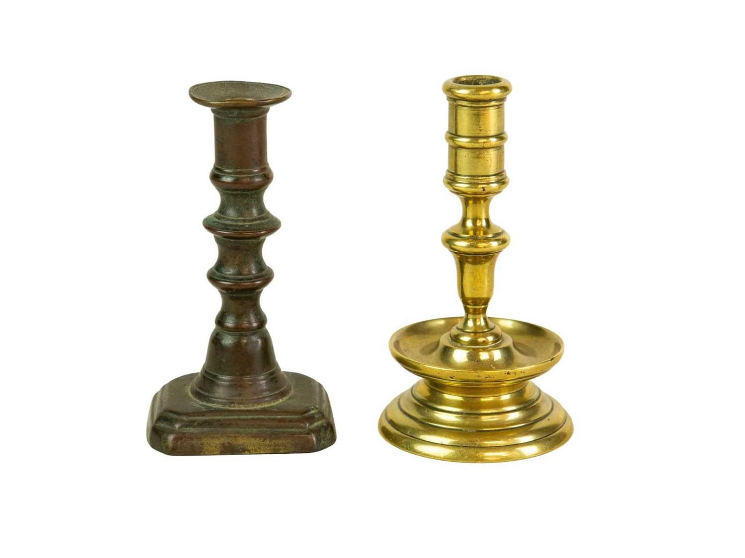A 17th century style Dutch brass taper stick. With a baluster stem, lower drip pan and bell shape base, height 10cm, together with a Victorian brass ejector taper stick (2). Wine bottle pictured for scale only, not included in this lot.