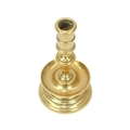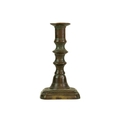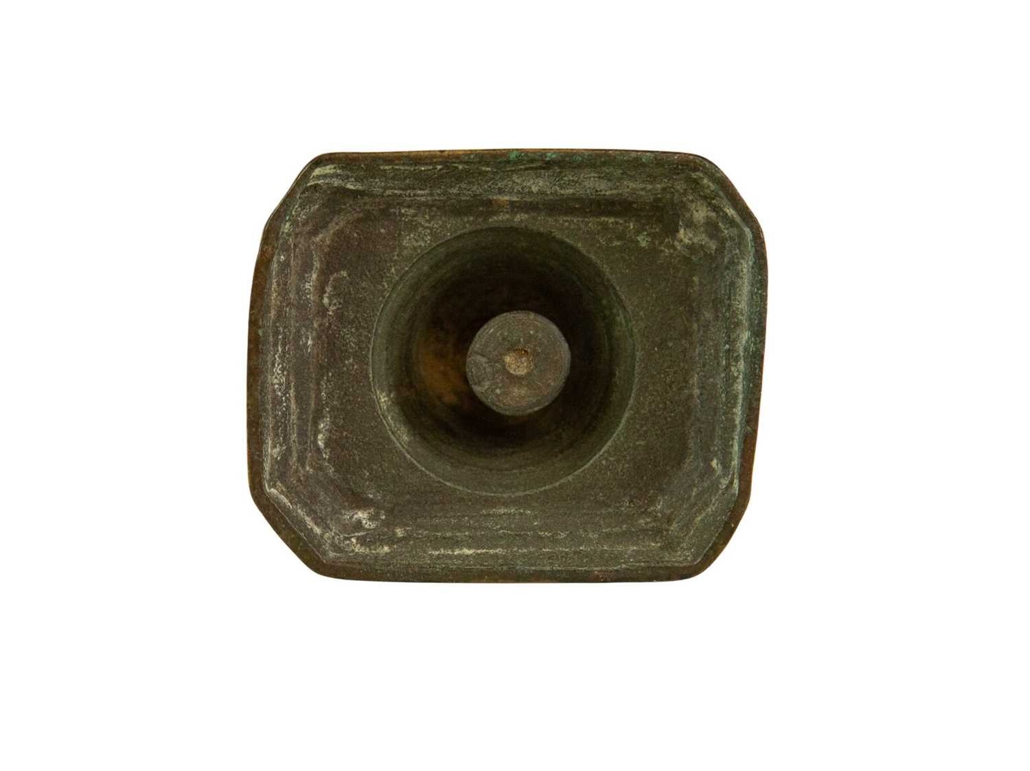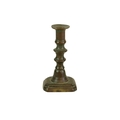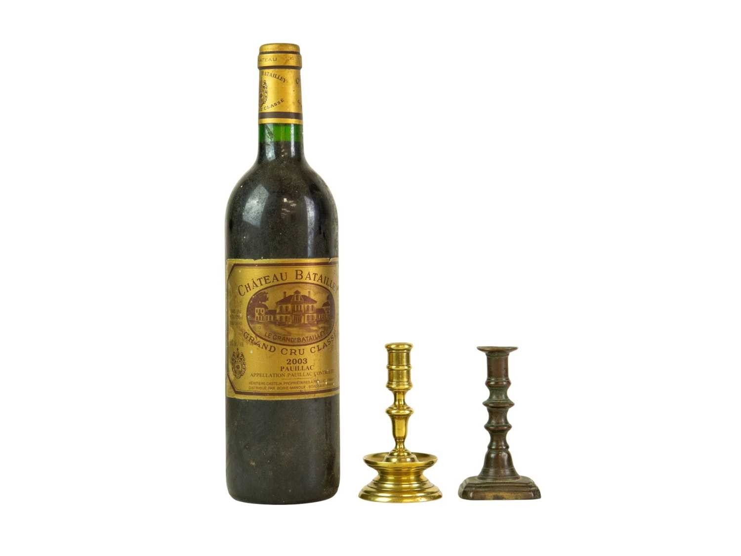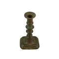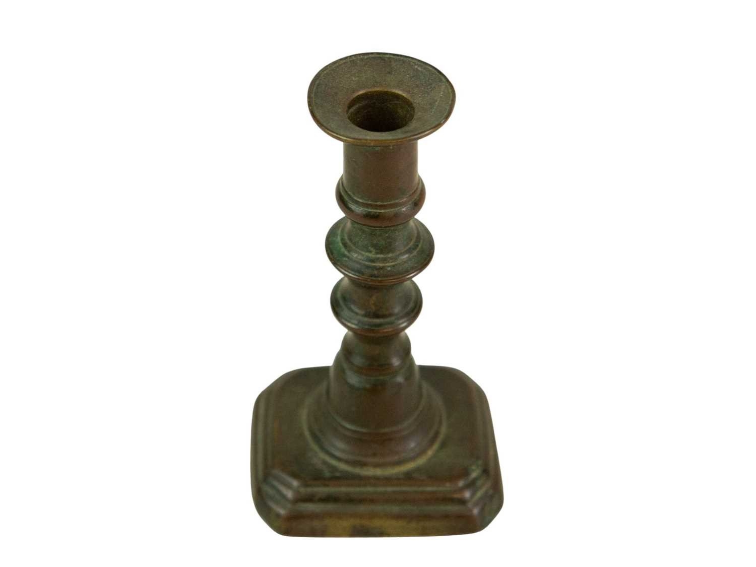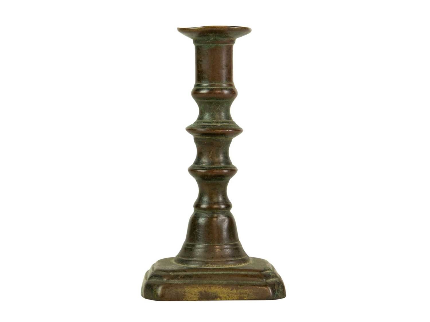 A 17th century style Dutch brass taper stick. With a baluster stem, lower drip pan and bell shape base, height 10cm, together with a Victorian brass ejector taper stick (2). Wine bottle pictured for scale only, not included in this lot.