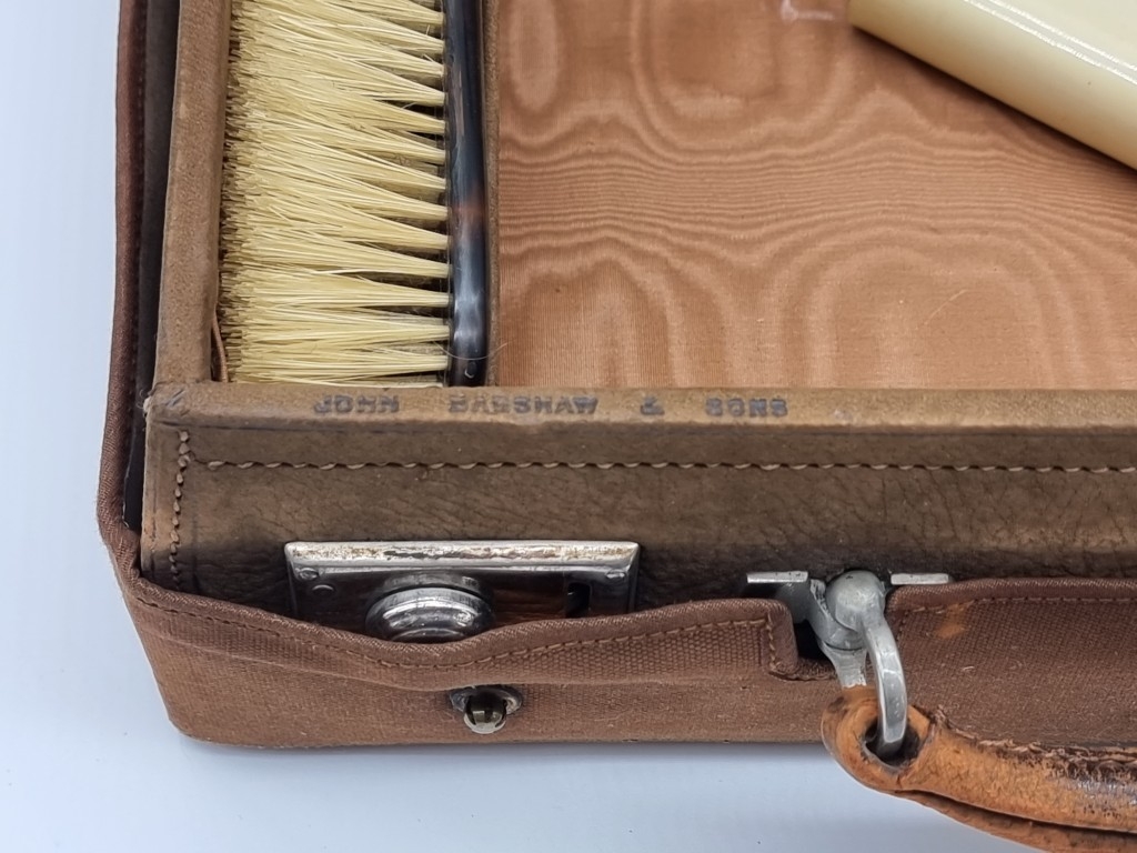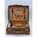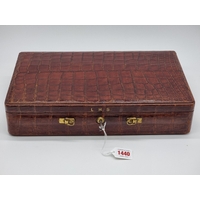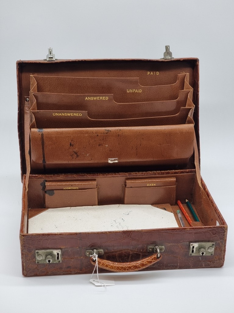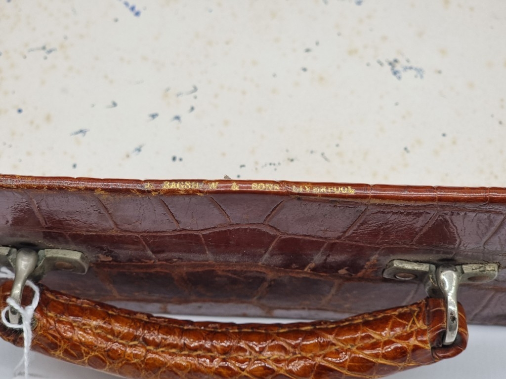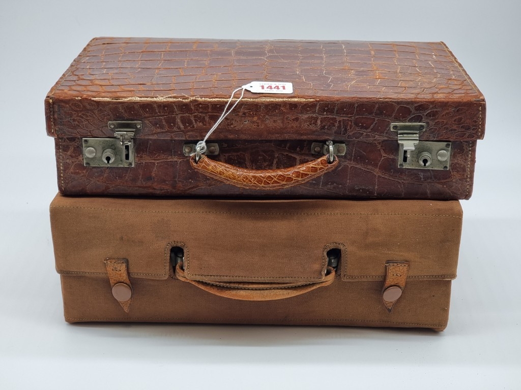 A leather vanity case, inscribed 'John Bagshaw & Sons, Liverpool', with partial tortoiseshell fittings, with outer canvas cover, 36.5cm wide; and another crocodile attache case, by the same maker, 38cm wide. (2)