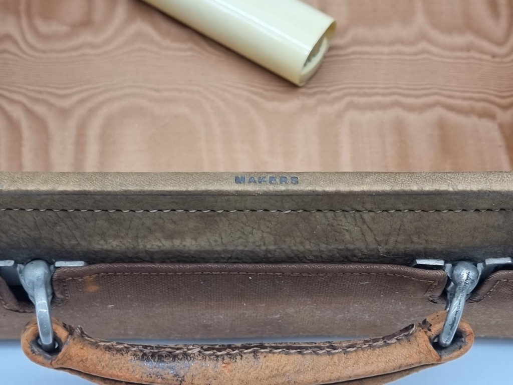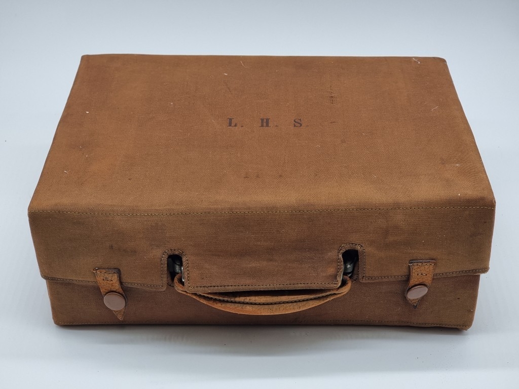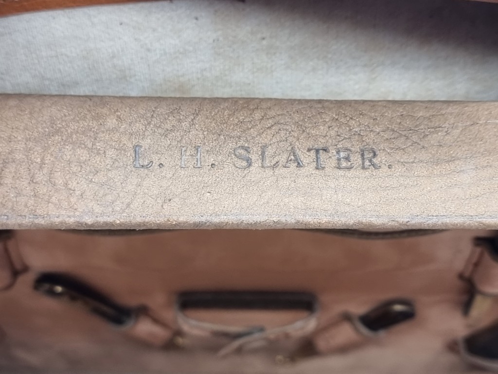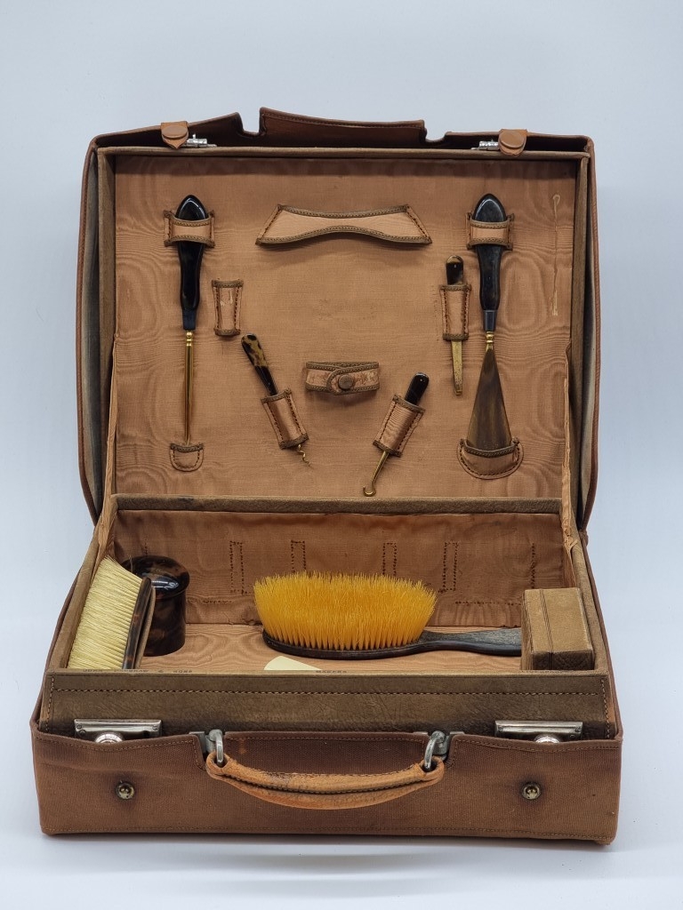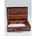 A leather vanity case, inscribed 'John Bagshaw & Sons, Liverpool', with partial tortoiseshell fittings, with outer canvas cover, 36.5cm wide; and another crocodile attache case, by the same maker, 38cm wide. (2)