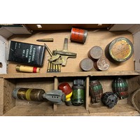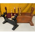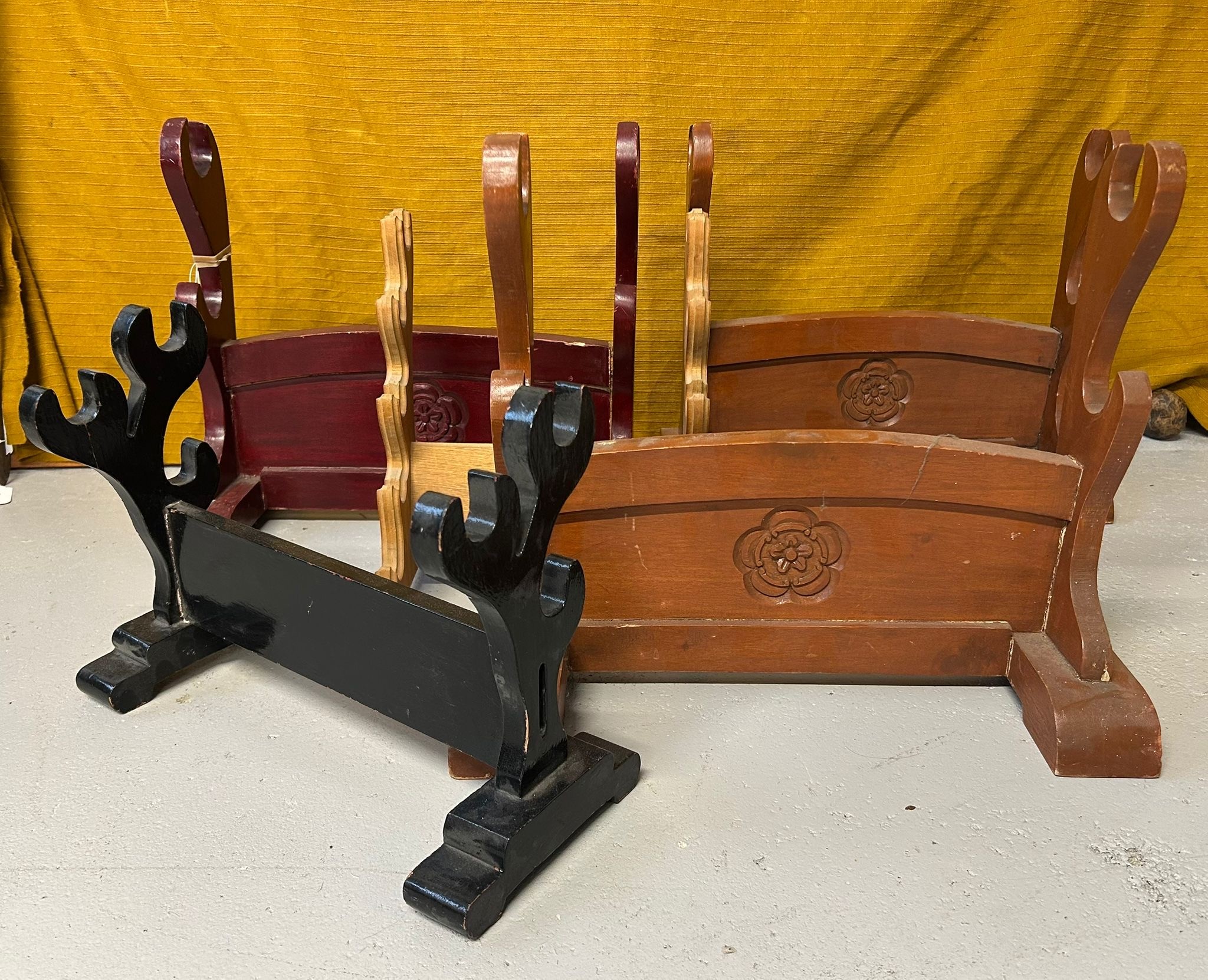 3 similar painted wooden stands each for 2 Japanese style swords, 41cms tall, 48cms wide, and each carved with a single blossom to the front; together with a third, black painted and for 3 swords, Average good condition, some wear.