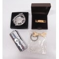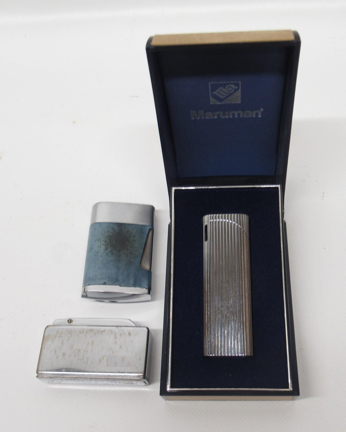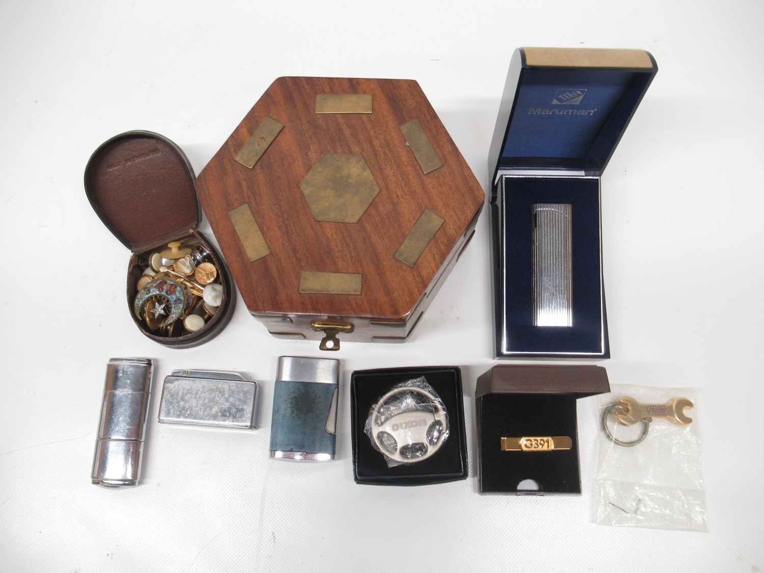 Maruman chrome butane cigarette lighter, with box and instructions; Colibri Executive chrome butane cigarette lighter; two other cigarette lighters; Eastern hardwood hexagonal jewellery box; stud box with collar studs etc.