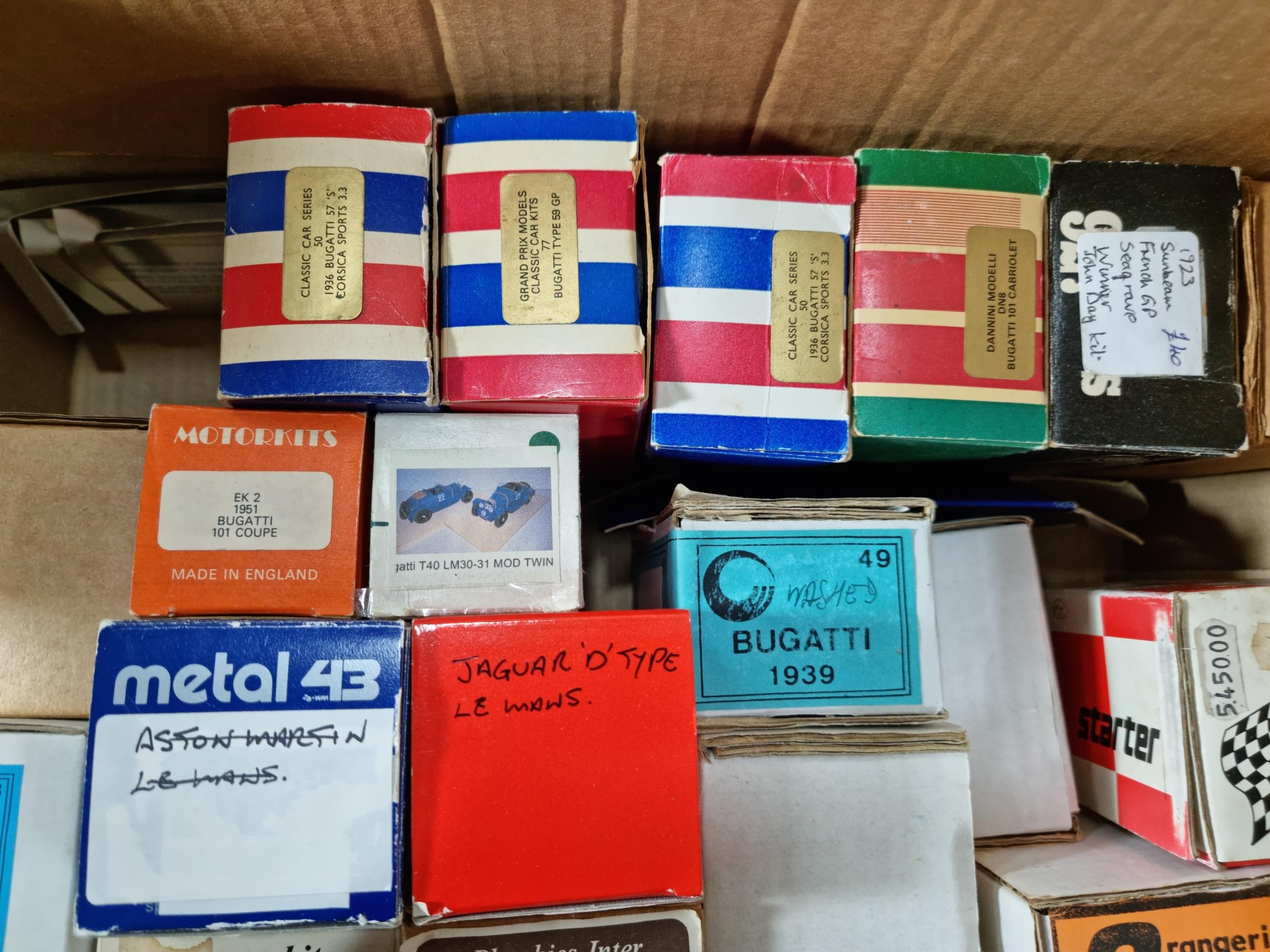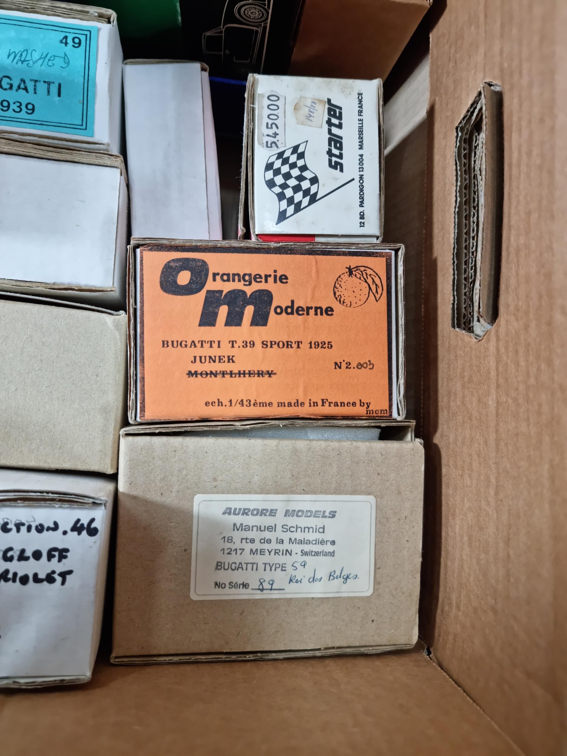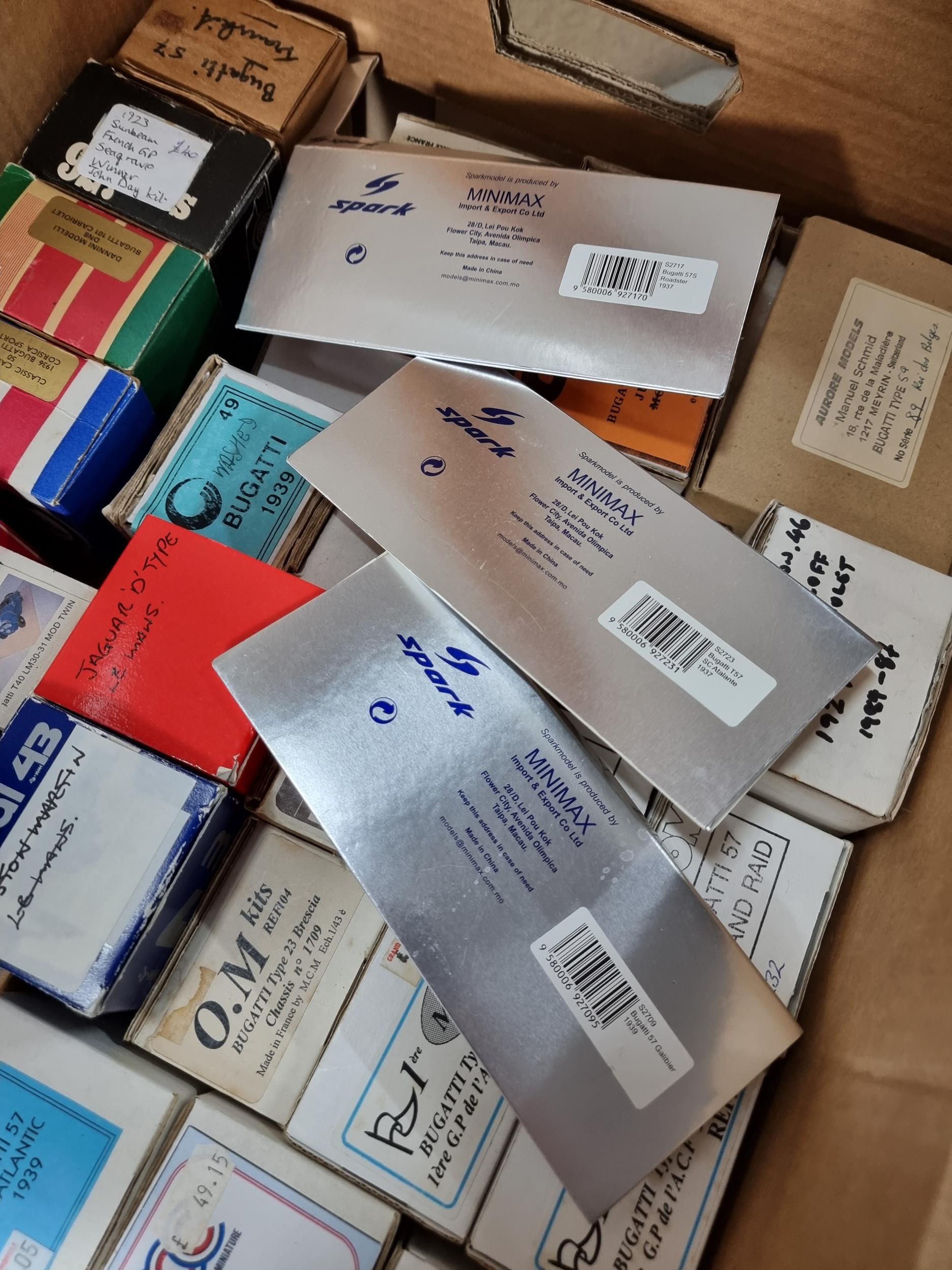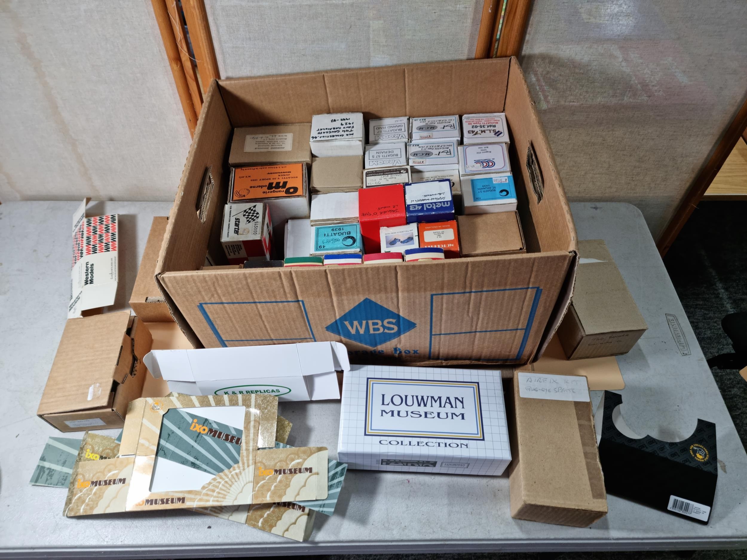 Box containing a large quantity of empty diecast car boxes mostly relating to Bugatti cars of various makes to include Louwman museum collection, Grand Prix Models, Motorkits, Western Models etc, please see pictures for what is included
