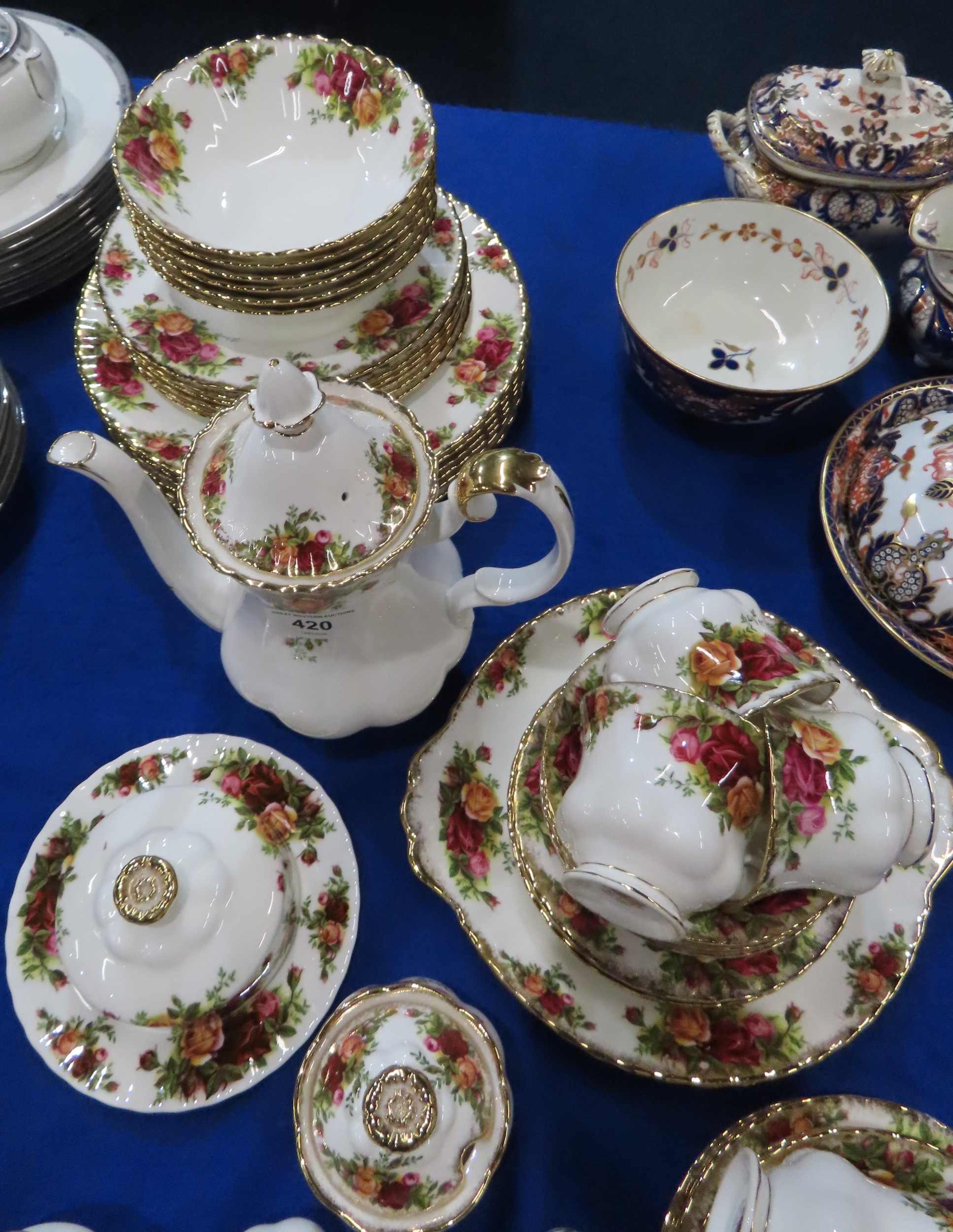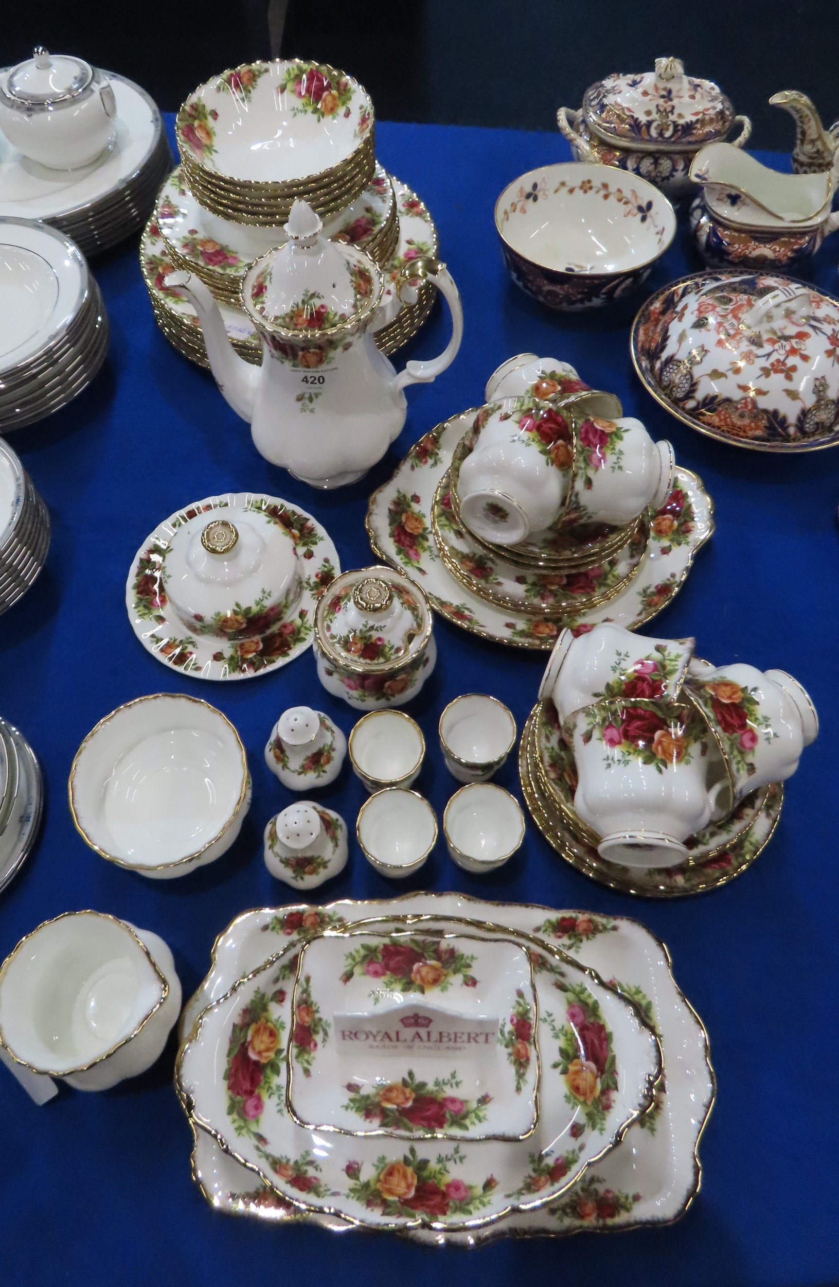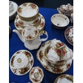 A Royal Albert Old Country Roses dinner service comprising six dinner, medium and side plates, bowls, cups and saucers, coffee pot, butter dish, milk jug and sugar bowl, egg cups, cruet, jam pot and dishes