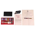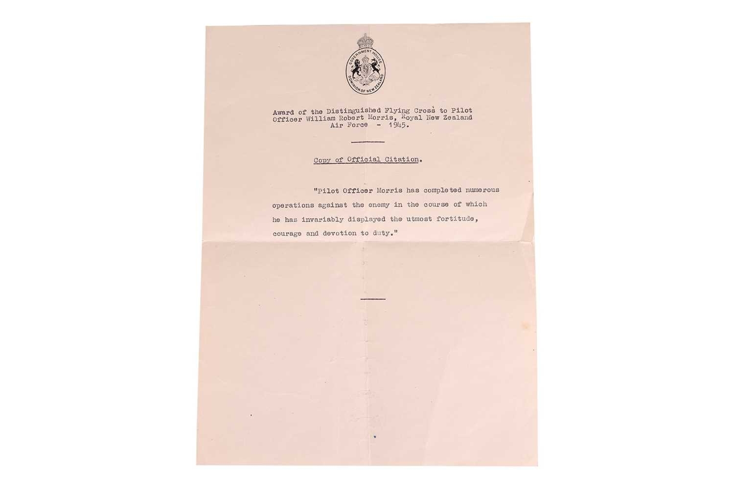 A WWII DFC Medal Group, awarded to New Zealand Pilot Officer William Robert Morris (NZ 429025), comprising Distinguished Flying Cross, 1939-1945 Star, France & Germany Star, Defence Medal, War Medal and New Zealand War Service Medal, together with ribbon bar, his RAF Corporal sleeve stripes and uniform Star, New Zealand MOD award sheet and similar citation note for the DFC, dated 1945, 'Pilot Officer Morris has completed numerous operations against the enemy in the course of which he has invariably displayed the utmost fortitude, courage and devotion to duty'. The original DFC Royal Mint box is also present. William Morris served as a navigator on Lancaster Bombers during WWII, completing more than one tour. Retained in the family by descent. William Morris returned to New Zealand following the war, before moving permanently back to England in the mid-1960s, with his family.
