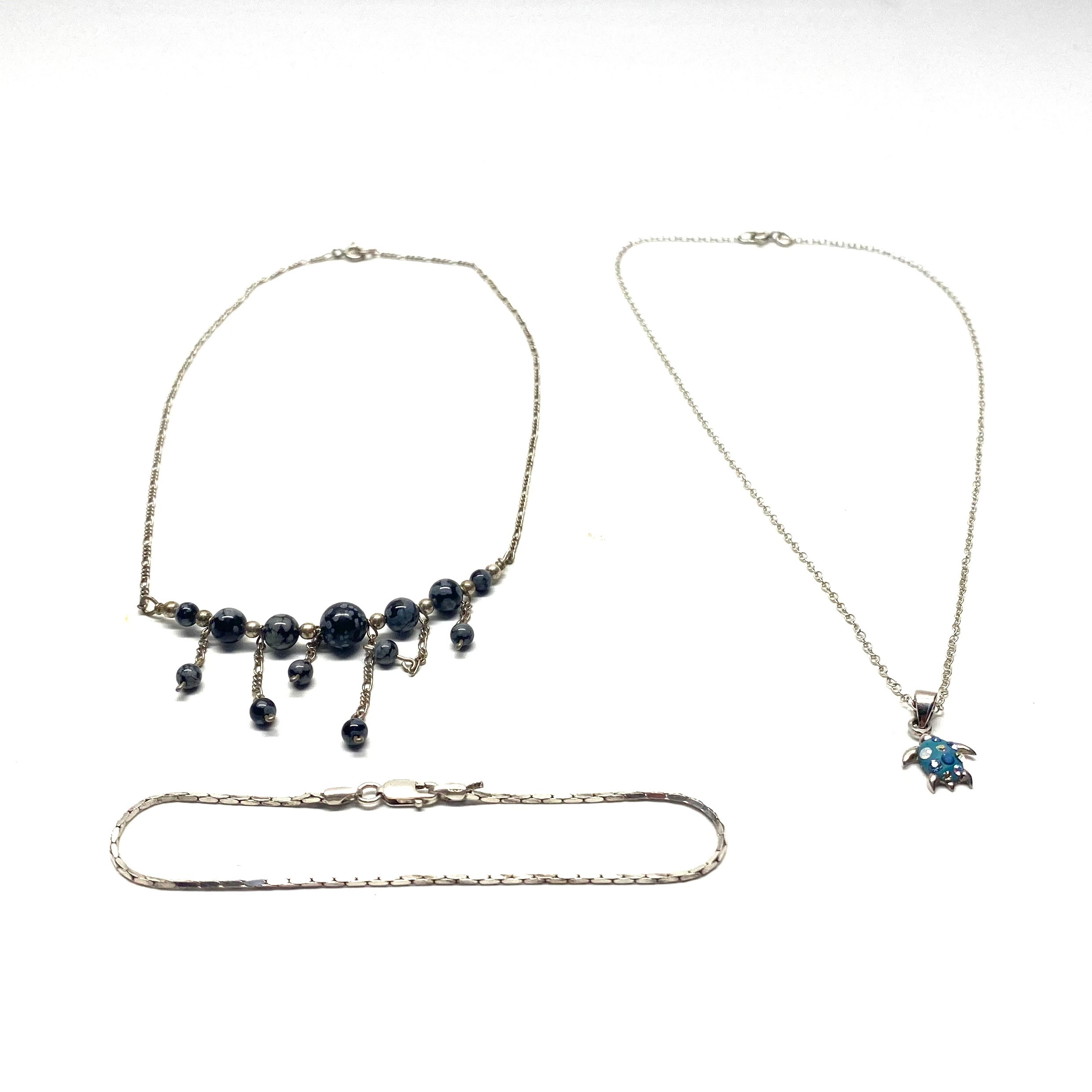 Two silver necklaces and a bracelet