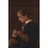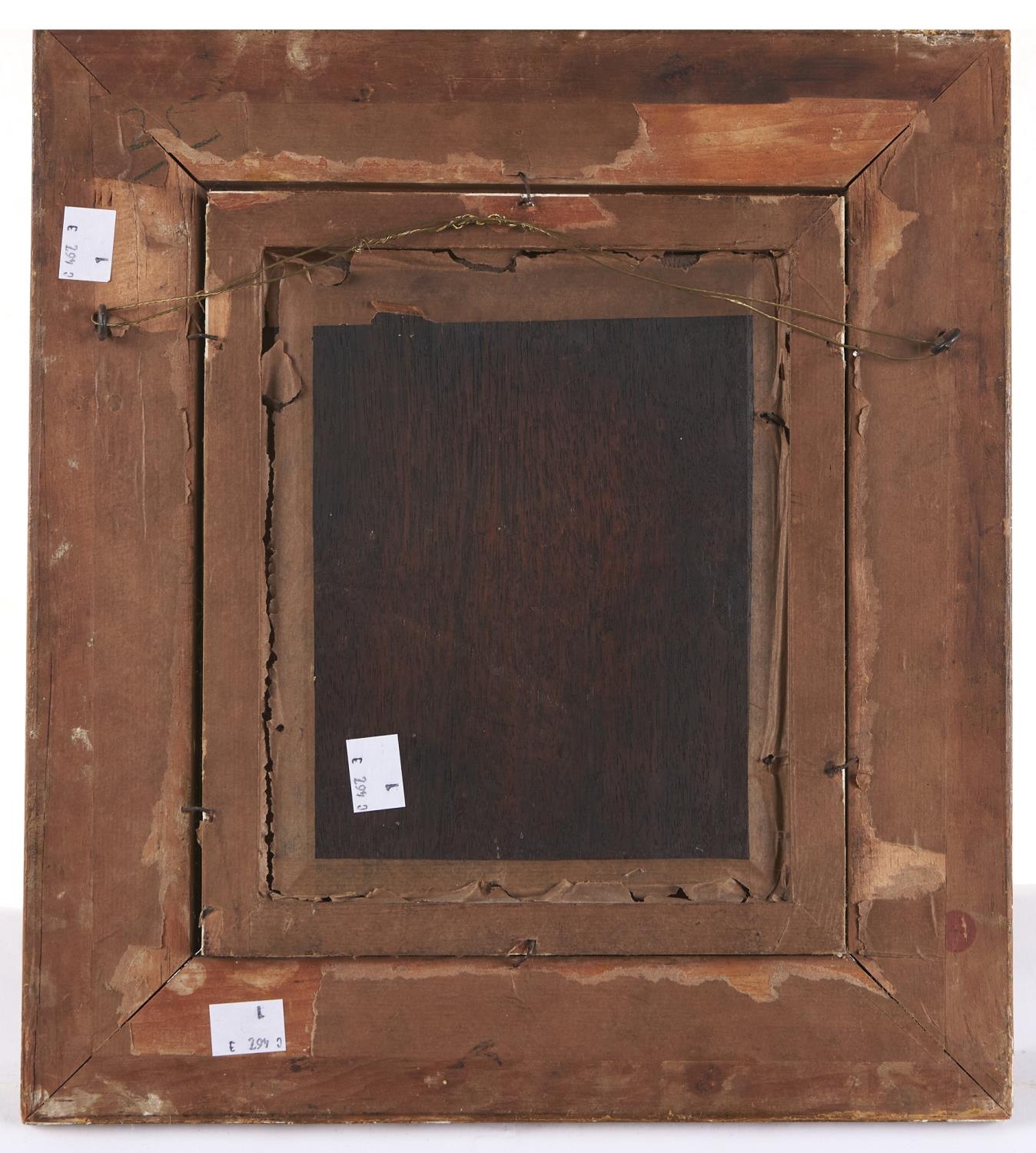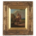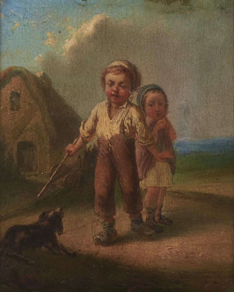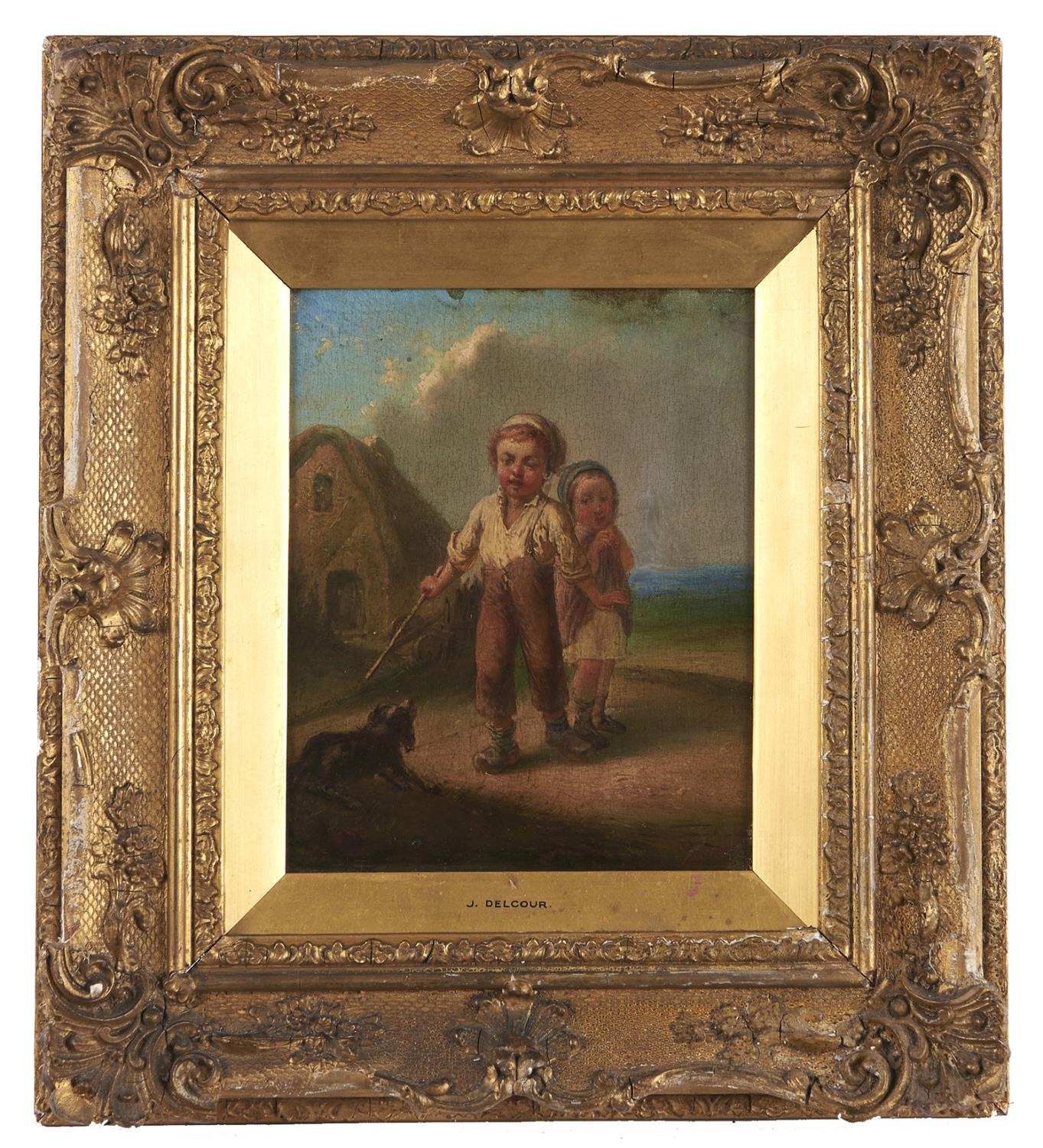 Attributed to J Delcour - Two Children with a Spaniel, oil on panel, 18.5 x 15.5cm