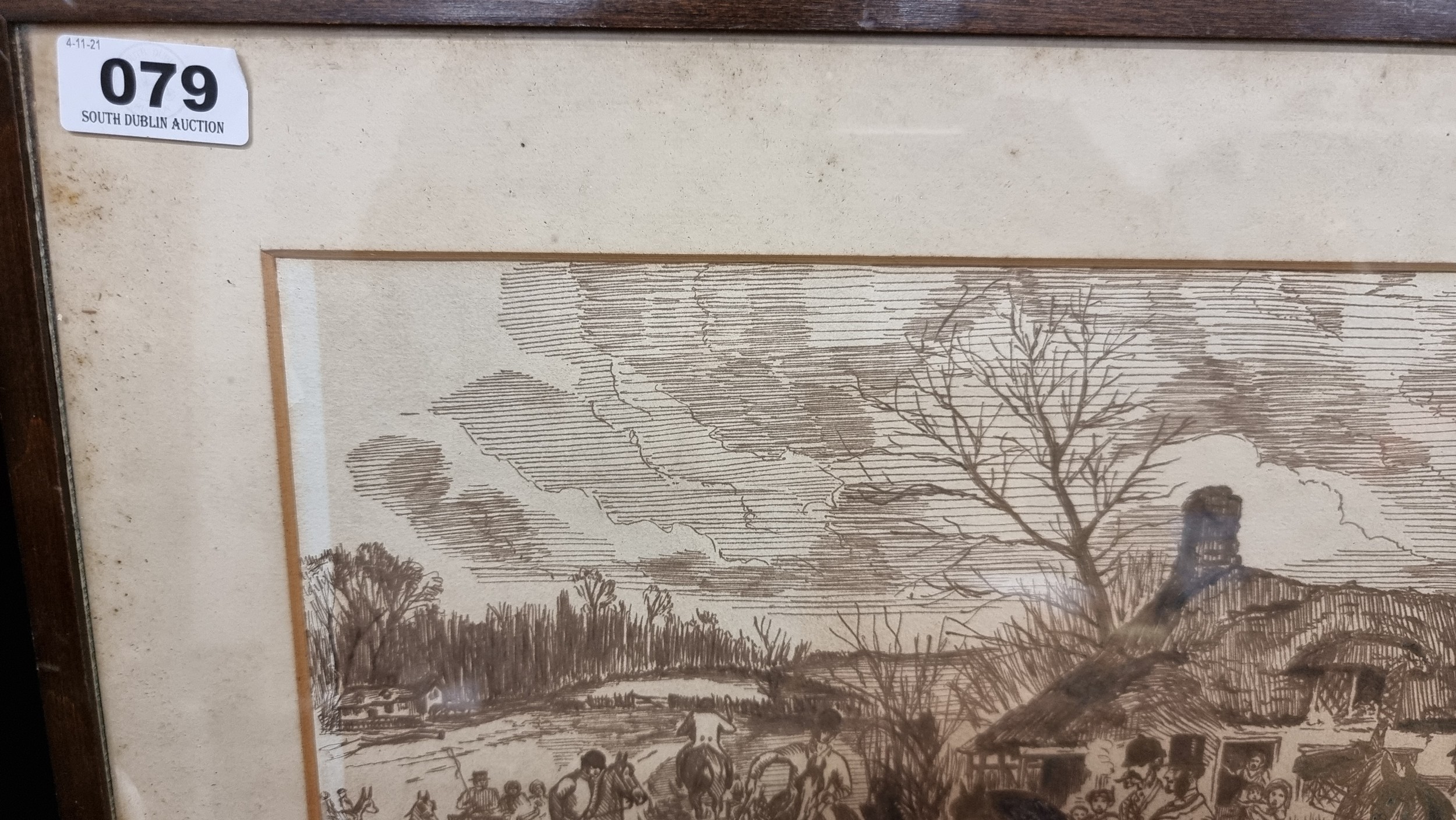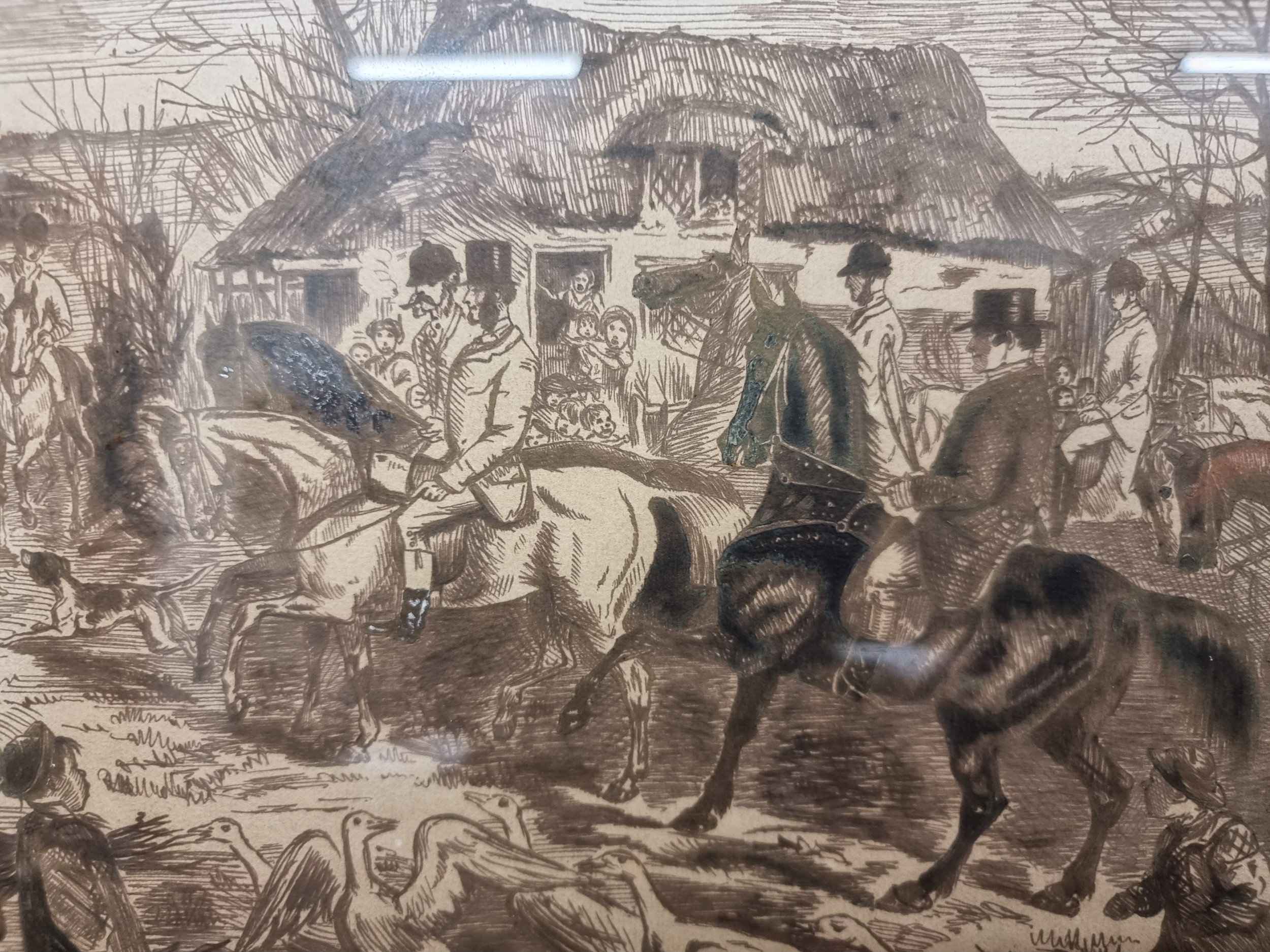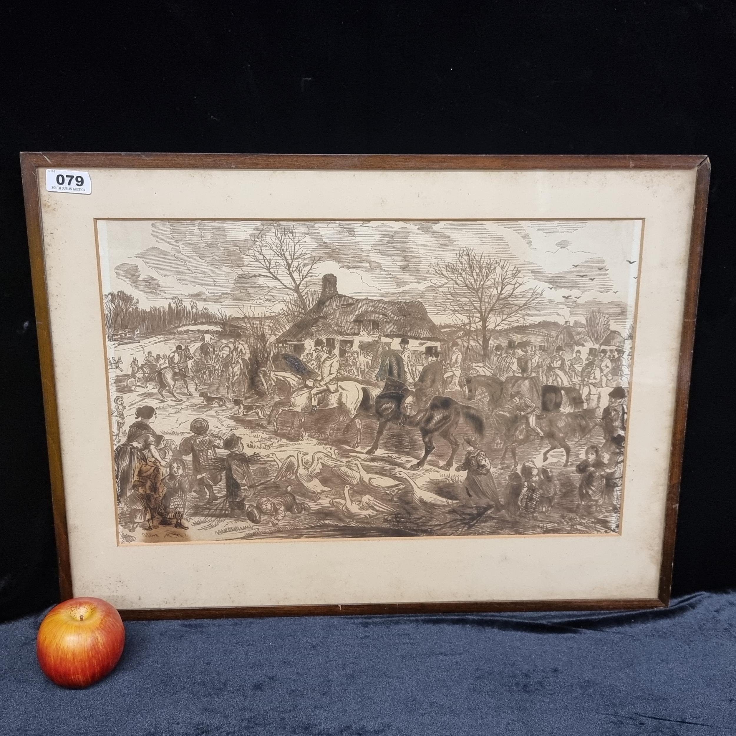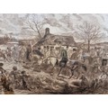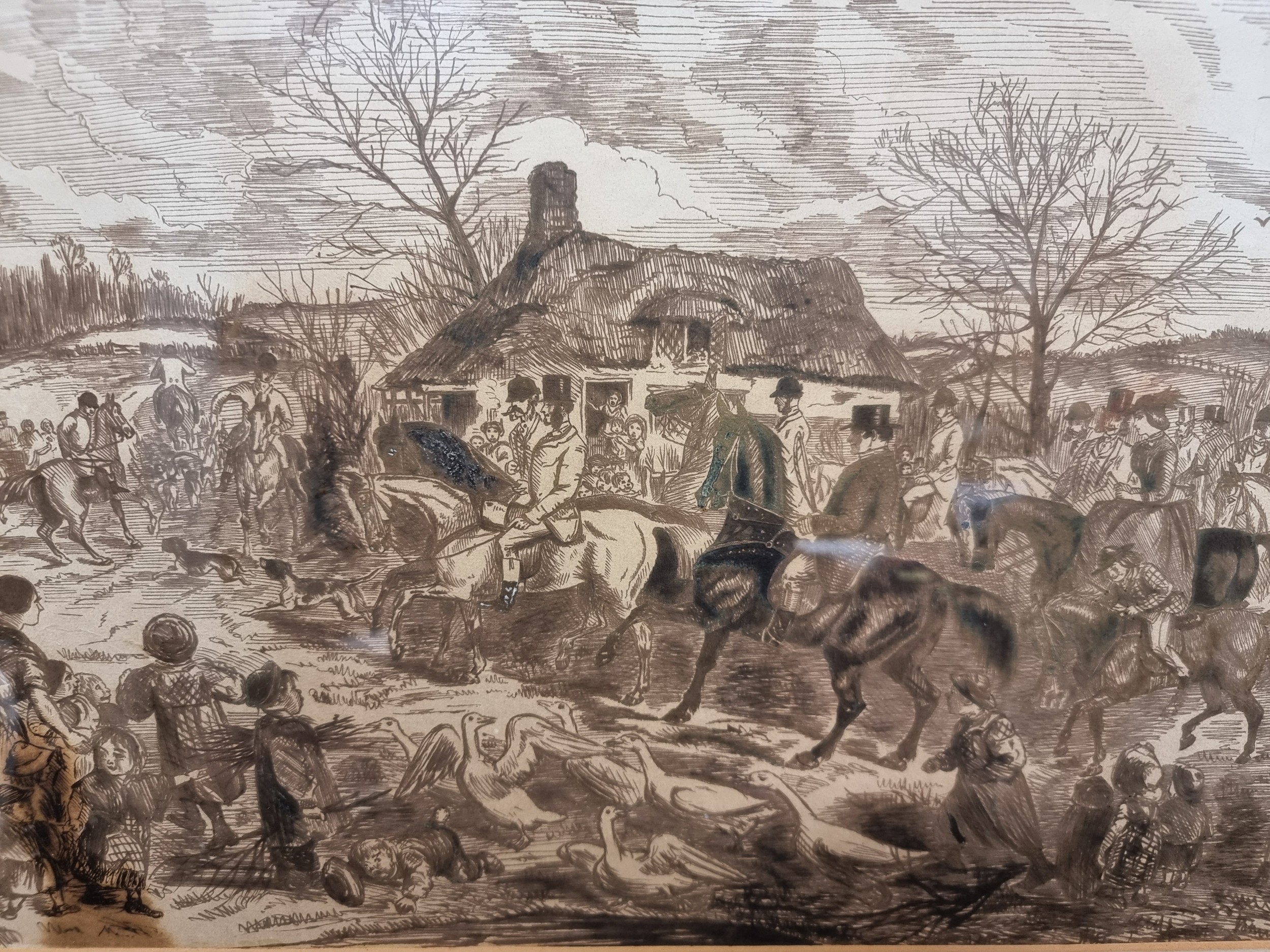 Large original Giclée print showing a hunting party passing through a rural village titled " A real Christmas holiday" by John Leech (1817-1864). Interesting piece with lots of age.