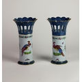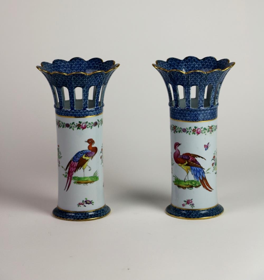 A very attractive pair of Copeland Spode porcelain Vases, in the Chelsea style, decorated with exotic birds, 18" (46cms), with floral sprays and garlands under a blue scale, pierced flaring neck, 9" (23cms). (2)