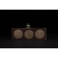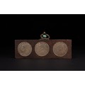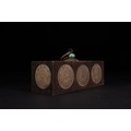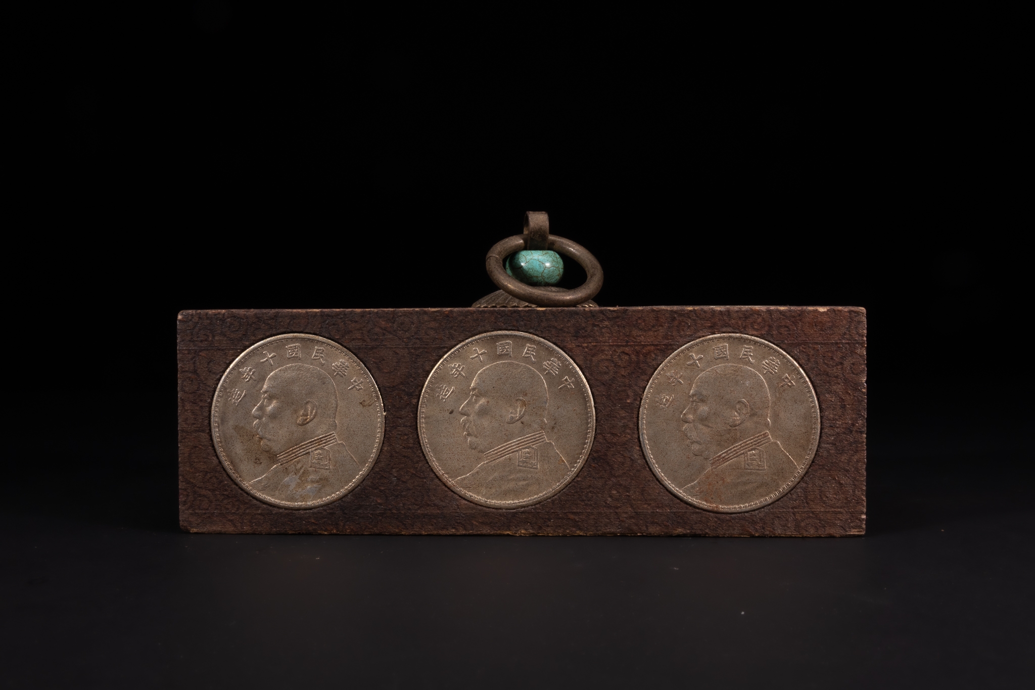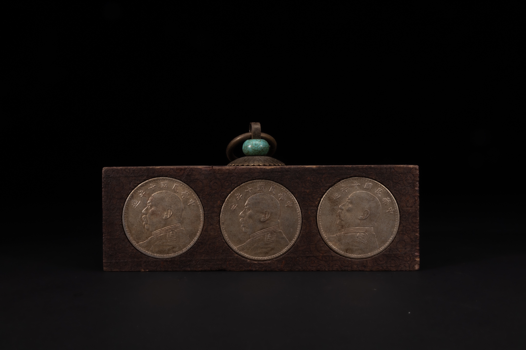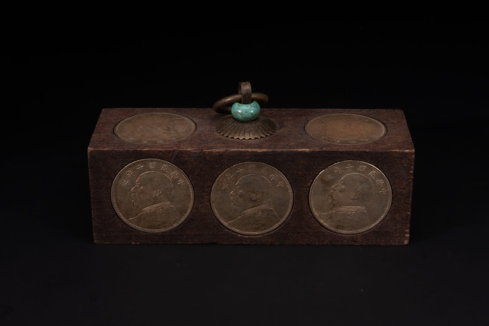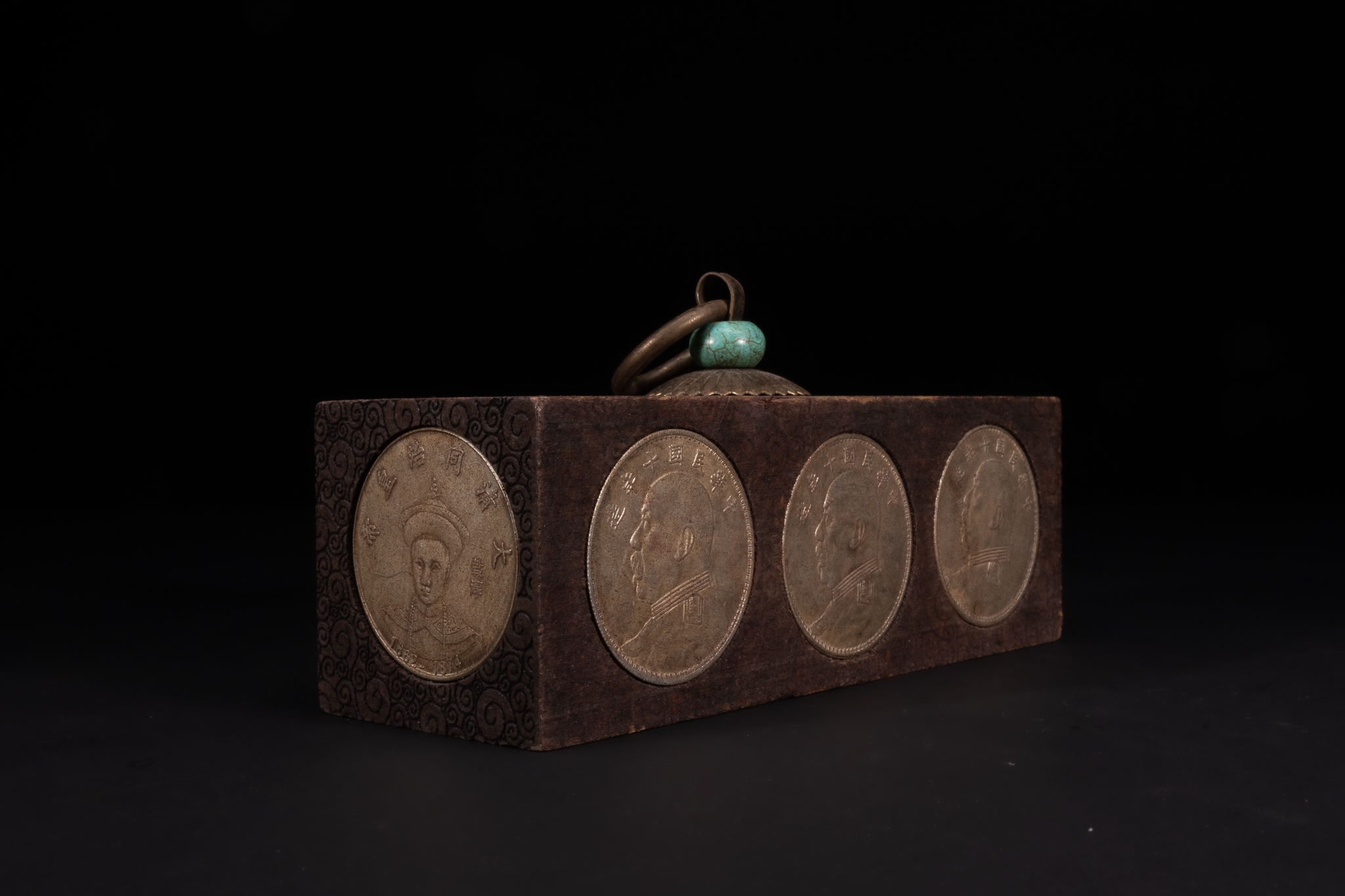 A Chinese Wooden Coin Box Inset with Republican-Era Coins and Turquoise Mount.