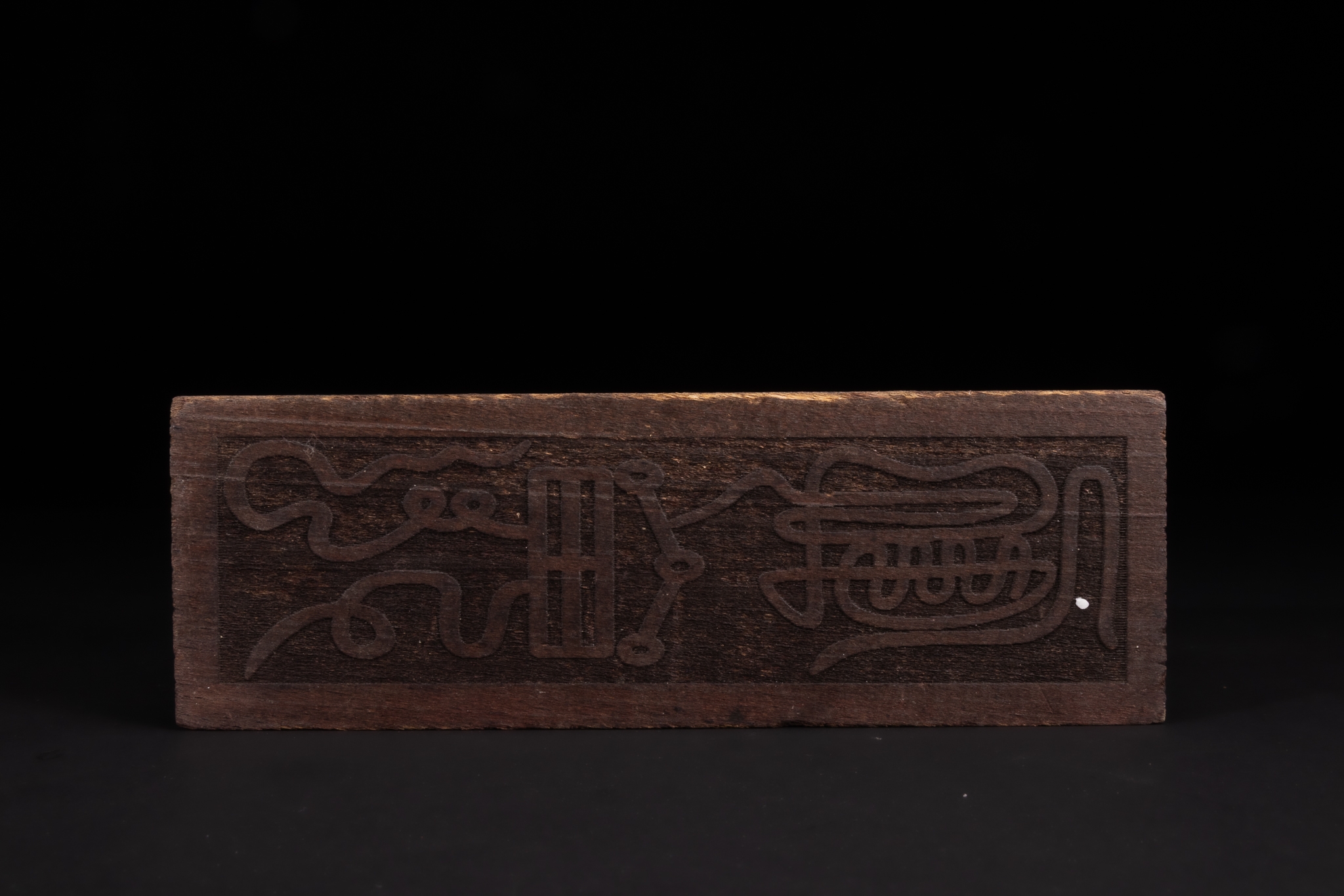 Rectangular wooden box of elongated form, the exterior inlaid on multiple sides with circular metal coins featuring profile portraits, set flush into the wood. The top fitted with a metal loop handle mounted through a scalloped metal plate, accented with a small turquoise bead. One end panel decorated with a single oval coin portrait, while the reverse face is carved with linear and abstract motifs within a recessed panel.