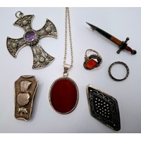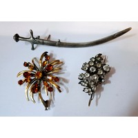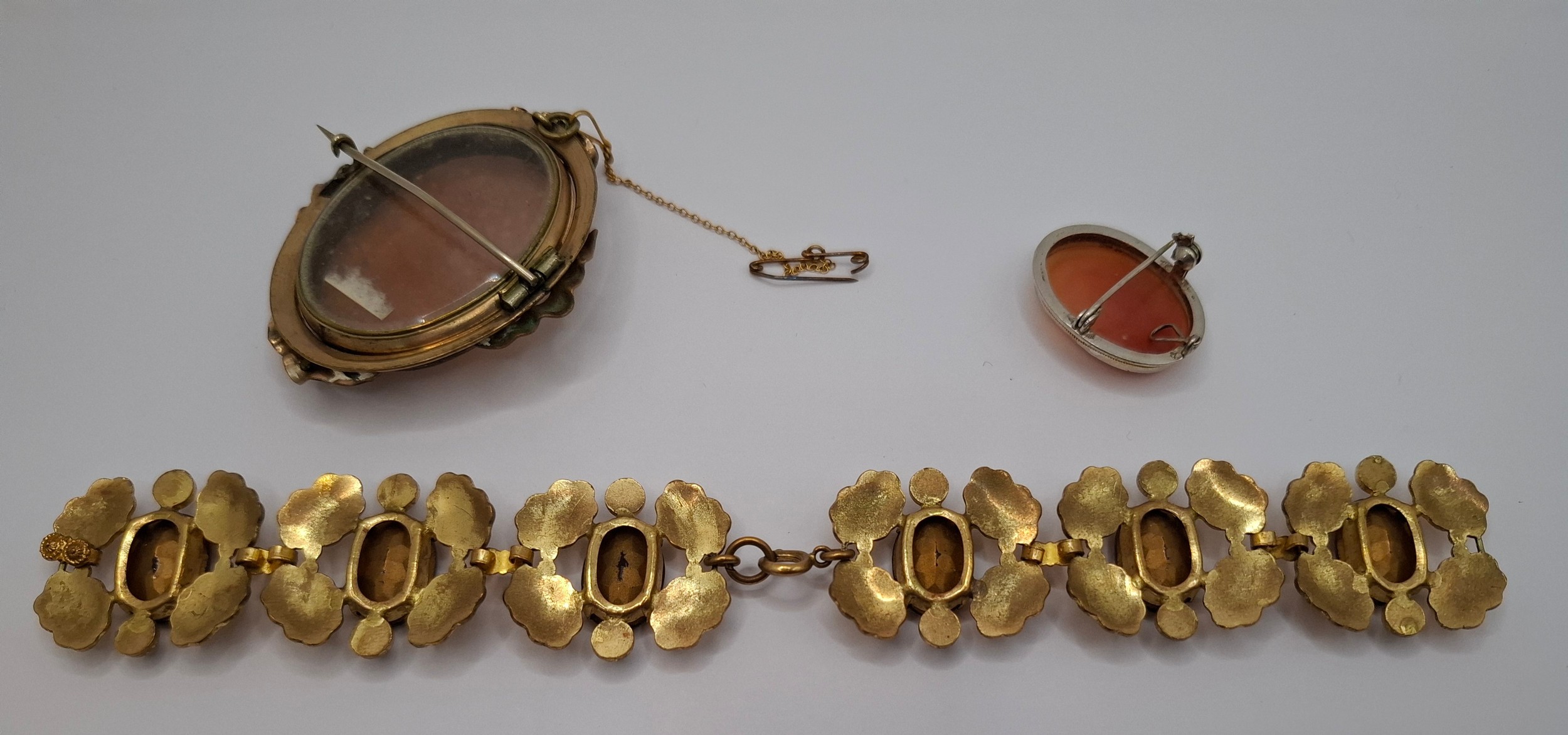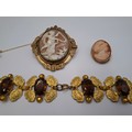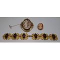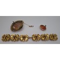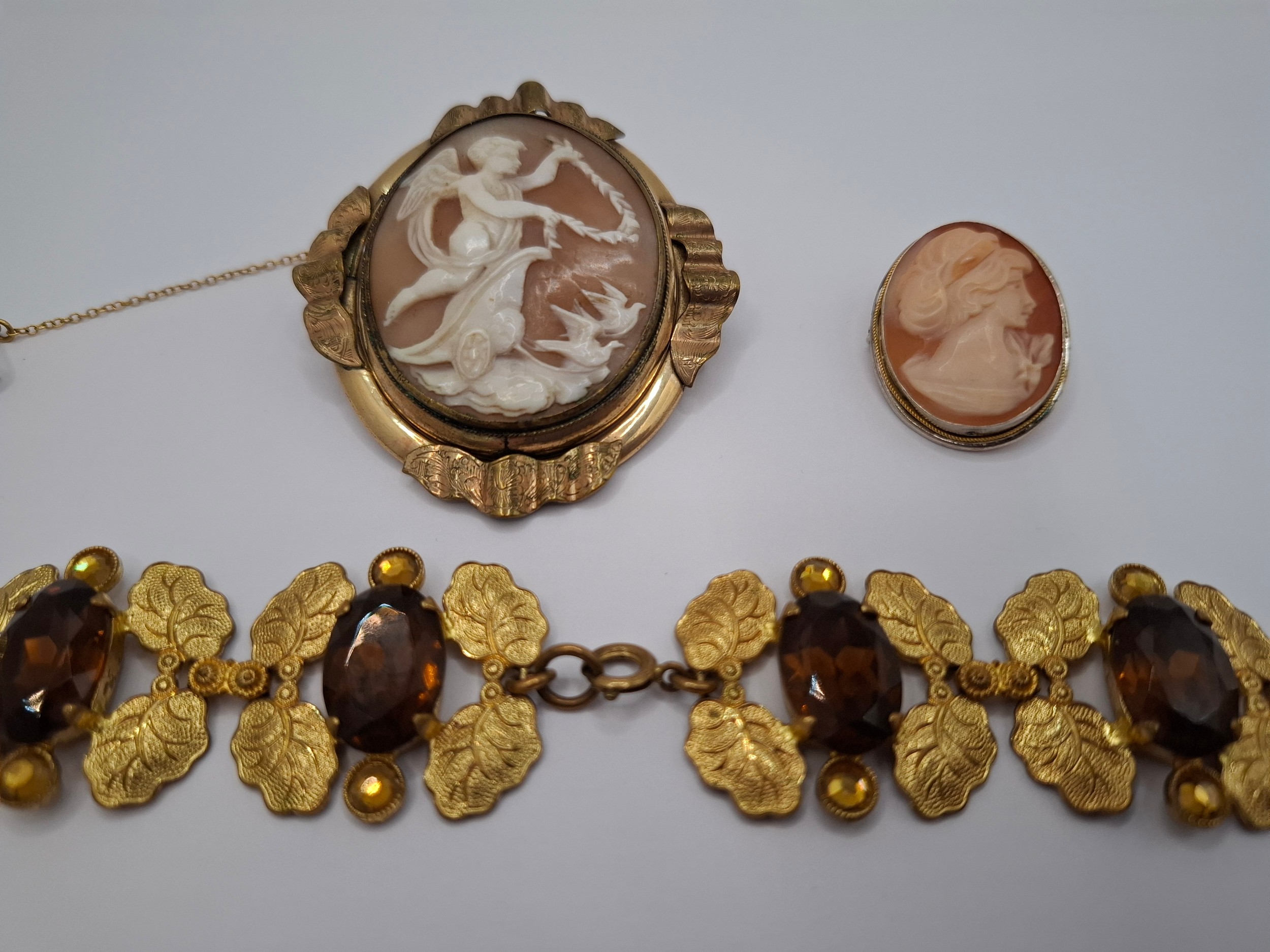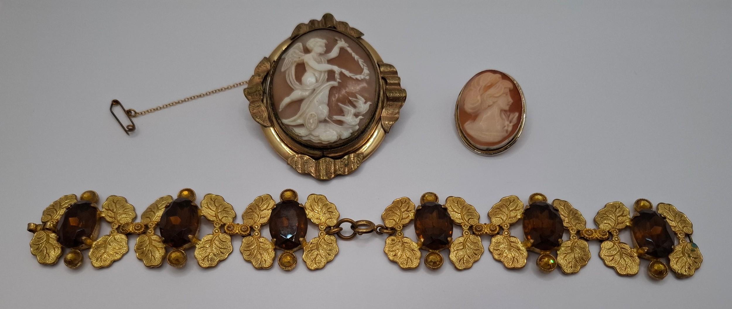 A Victorian swivel cameo brooch in a gold plated mount, a 20th Century silver set cameo brooch and a gilt metal leaf bracelet set with brown paste stones