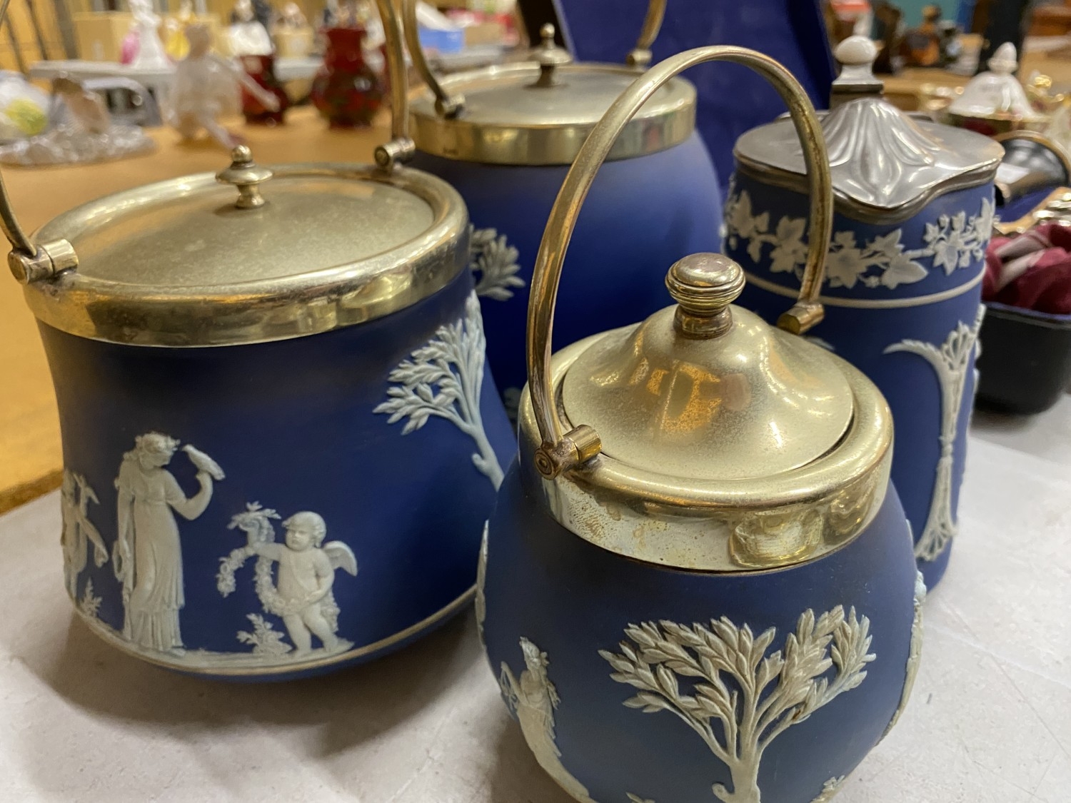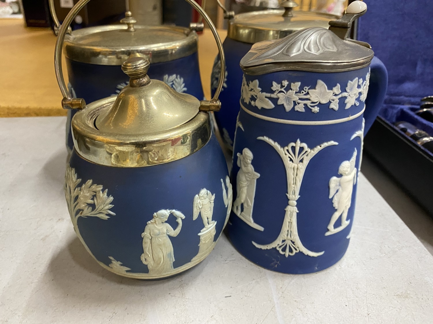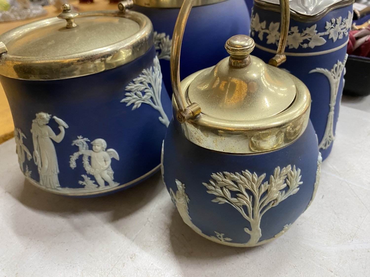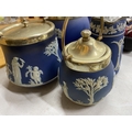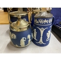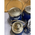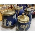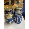 FOUR PIECES OF DARK BLUE WEDGWOOD JASPERWARE TO INCLUDE BISCUIT BARRELS, AJUG, ETC ALL WITH METAL LIDS