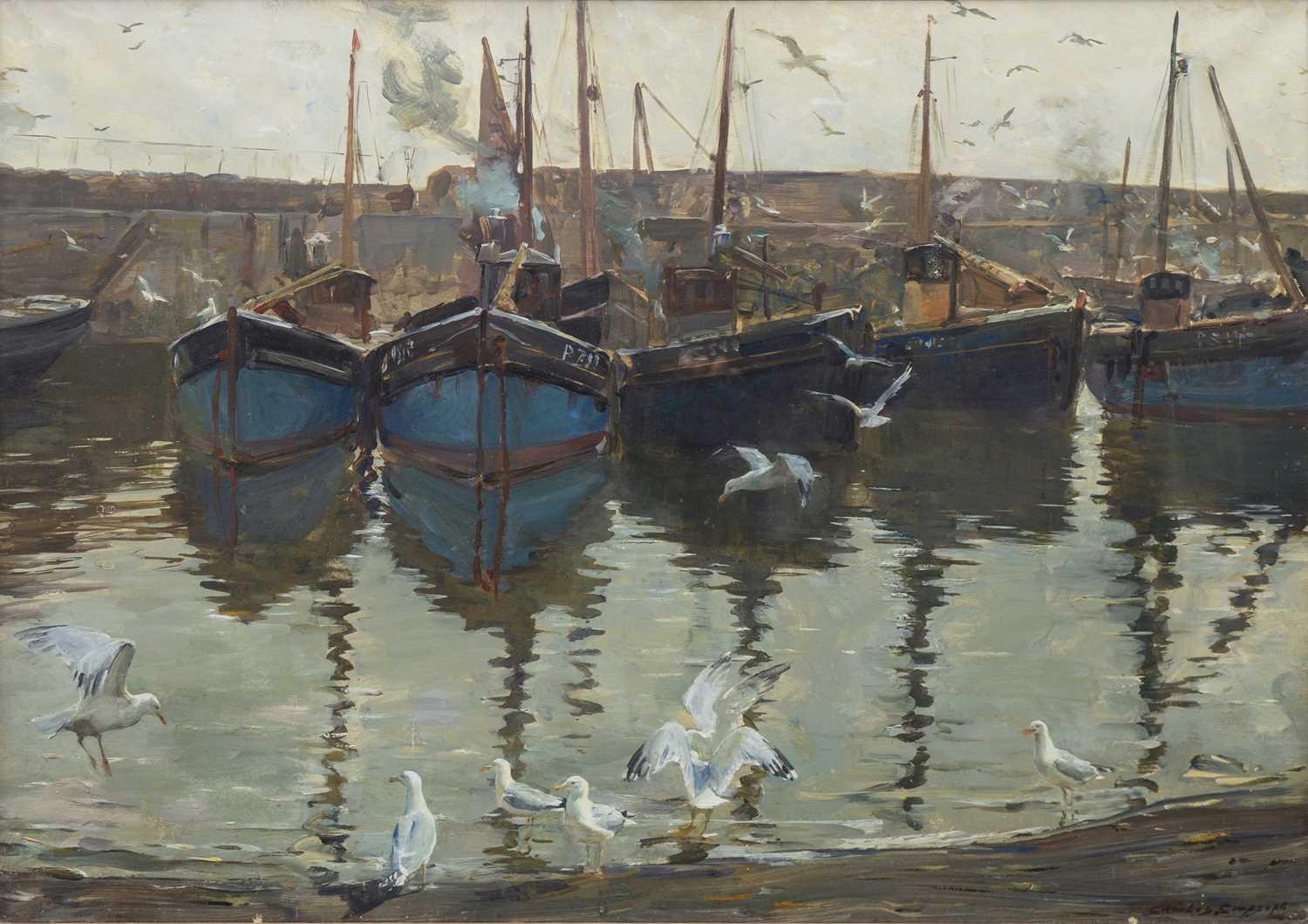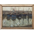 Charles Walter SIMPSON (1885-1971) Mousehole Harbour Gouache and body colour on paper, signed, 61.5 x 87cm, 76 x 101cm framed.