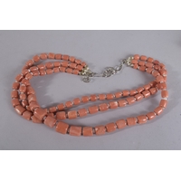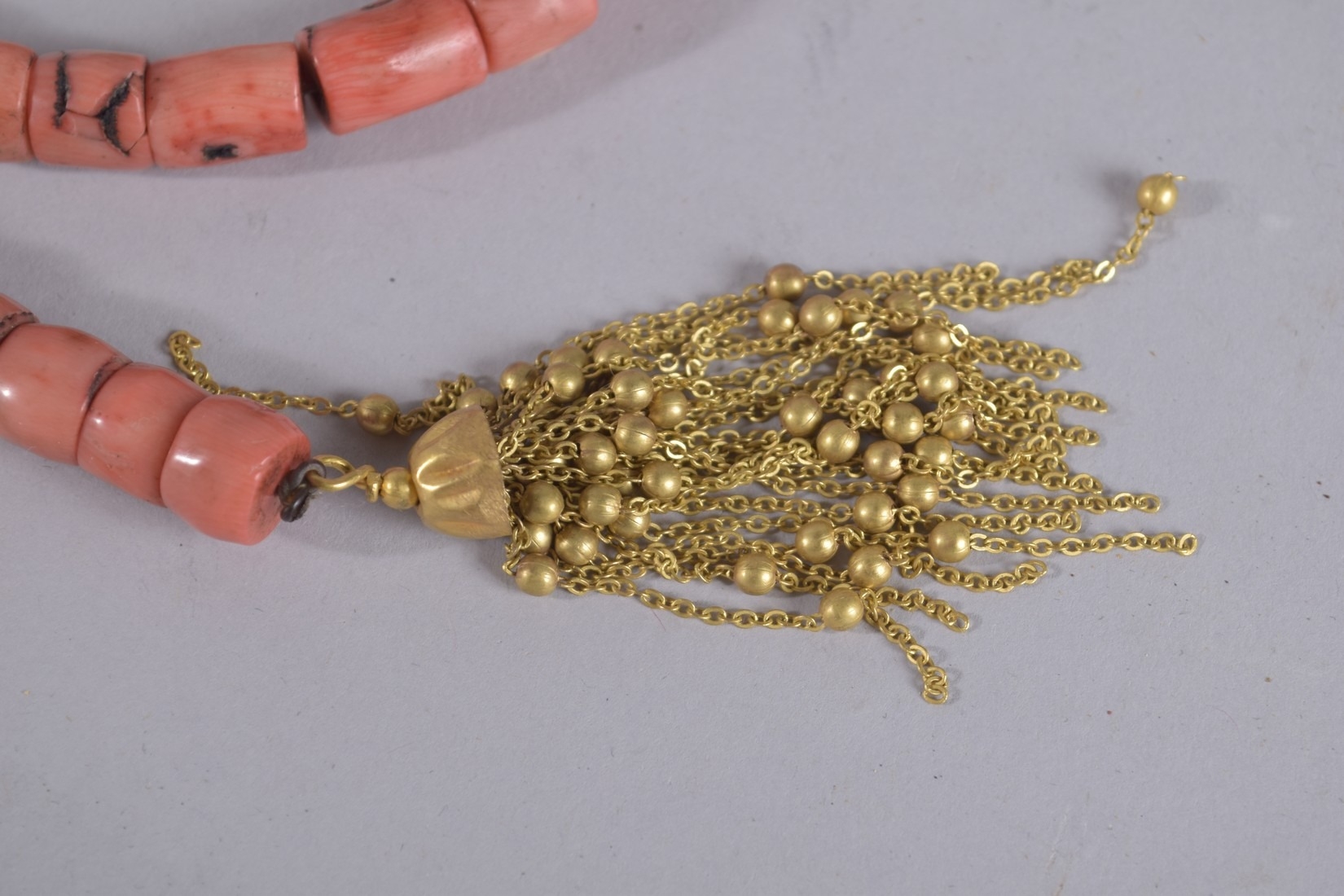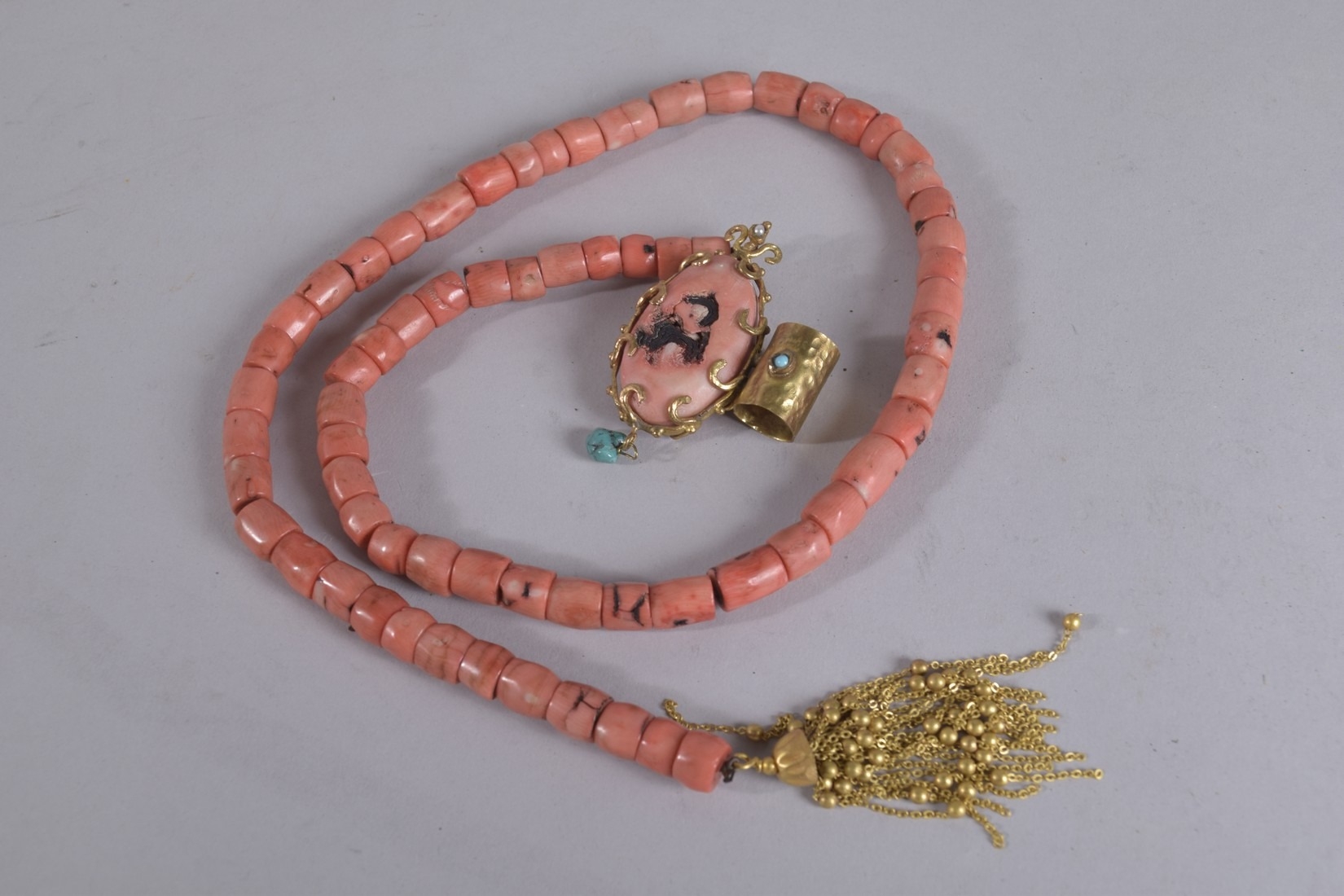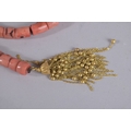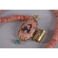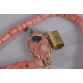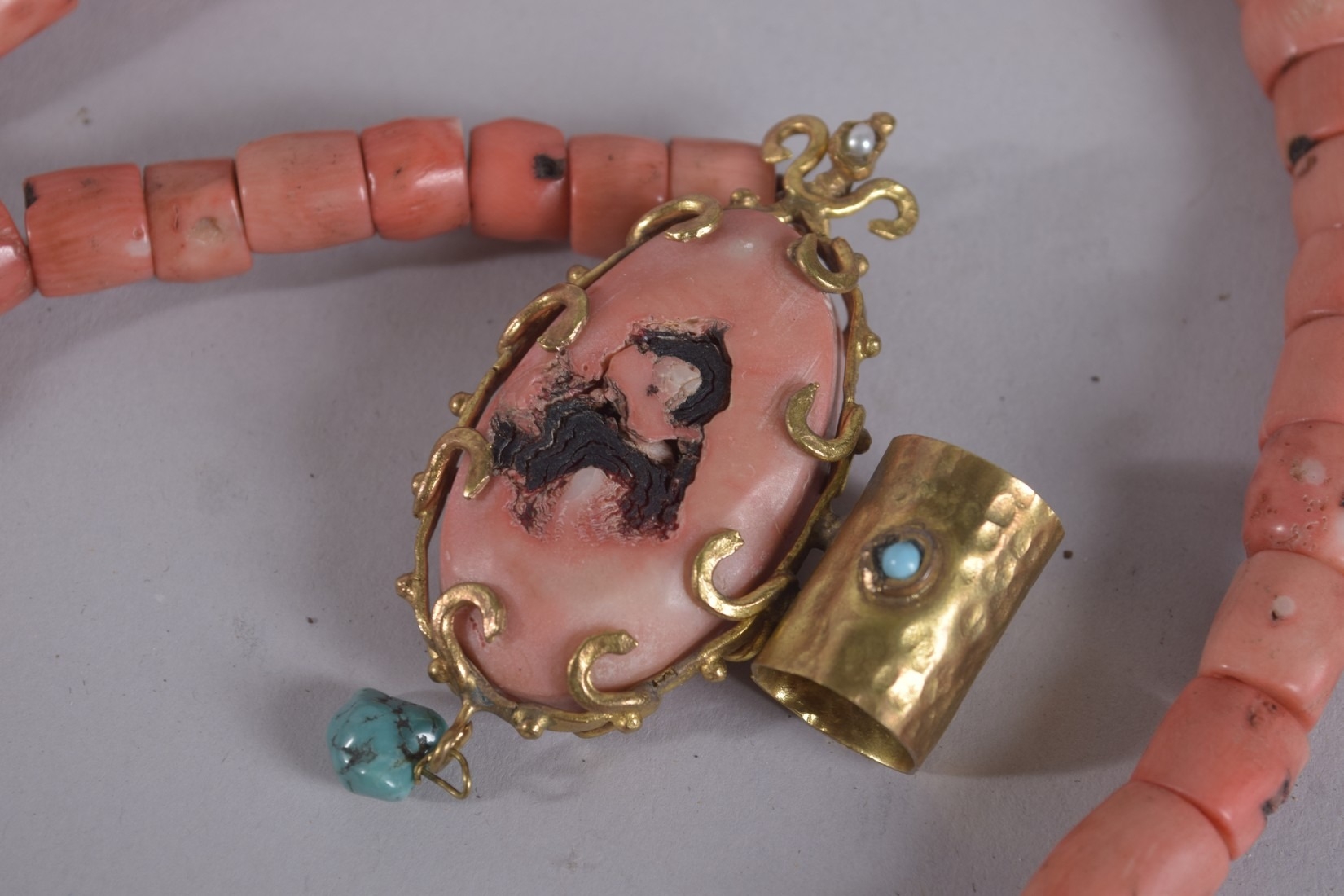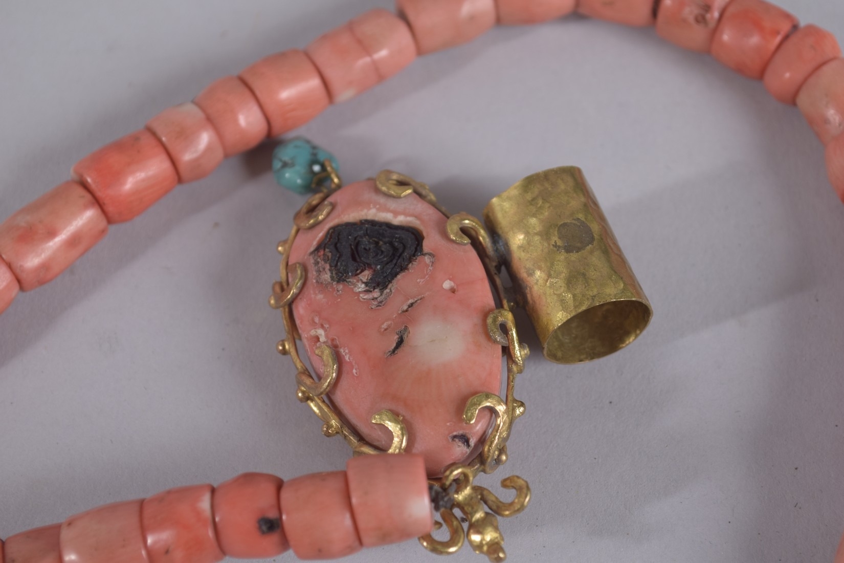 A SINGLE ROW OF CORAL BEADS AND TURQUOISE PENDANT