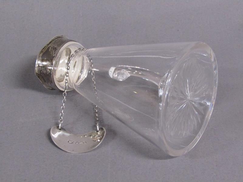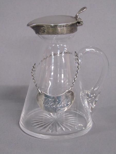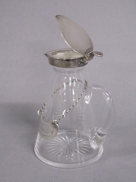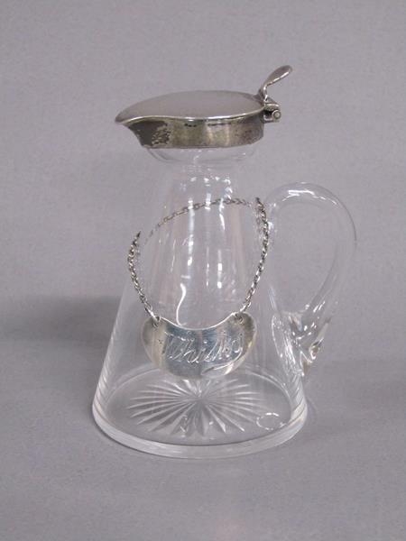 An Edwardian clear glass whisky water jug with silver mount and whisky bottle ticket, makers mark for Asprey, London 1903, 9cm h.