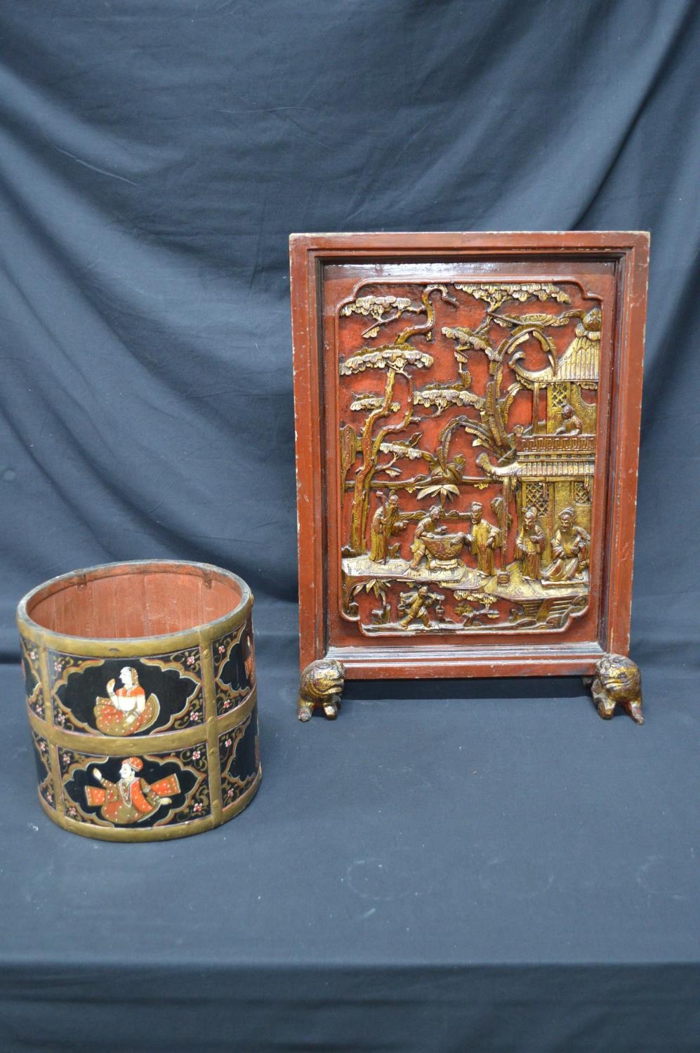 Oriental lacquered carved fire screen on Dogs of Foe formed feet - 17.75" x 25.25" tall together with a circular metal bound painted jardiniere - 9.75" x 9" tall