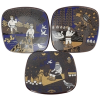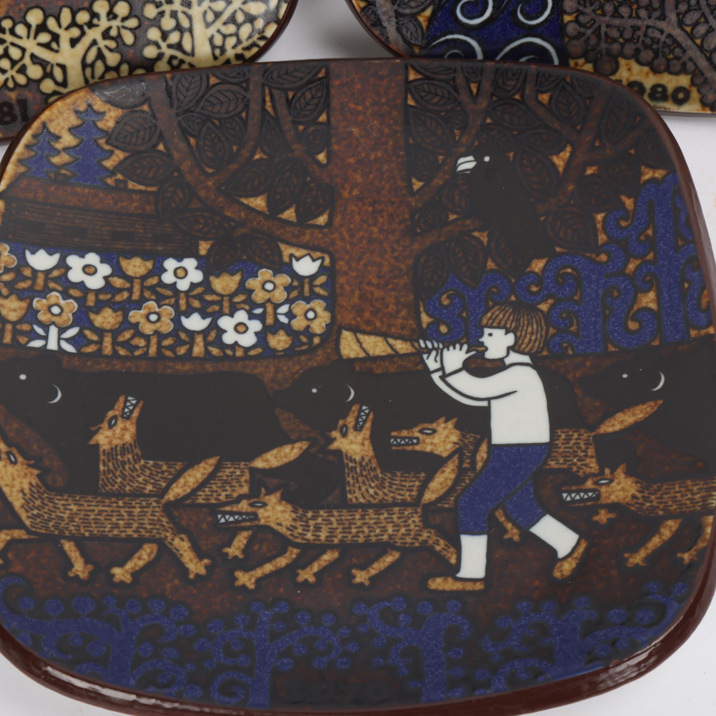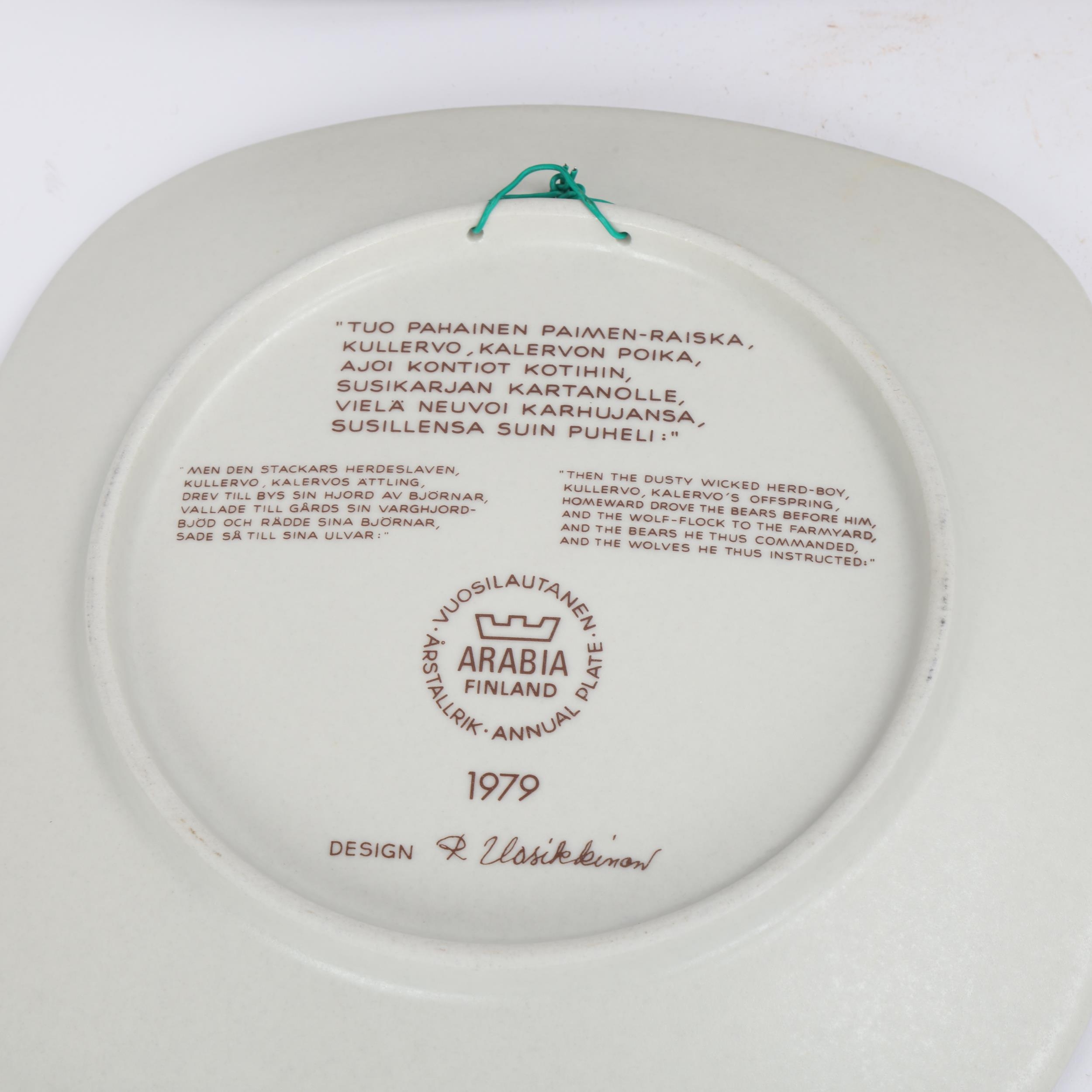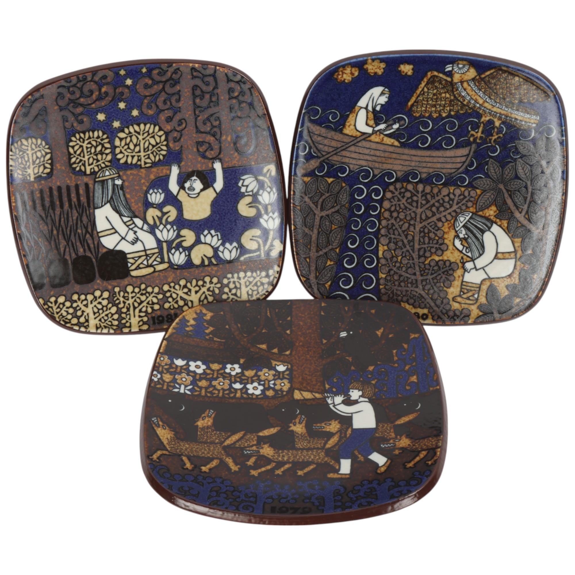 Raija Uosikkinen for Arabia, Finland, Three annual plates (1979- 1981) illustrating verses from the epic Finnish poem Kalevala about bygone times in Karelia. Translation of the verses to English and Swedish on the reverse, 20.5 x 20.5cms