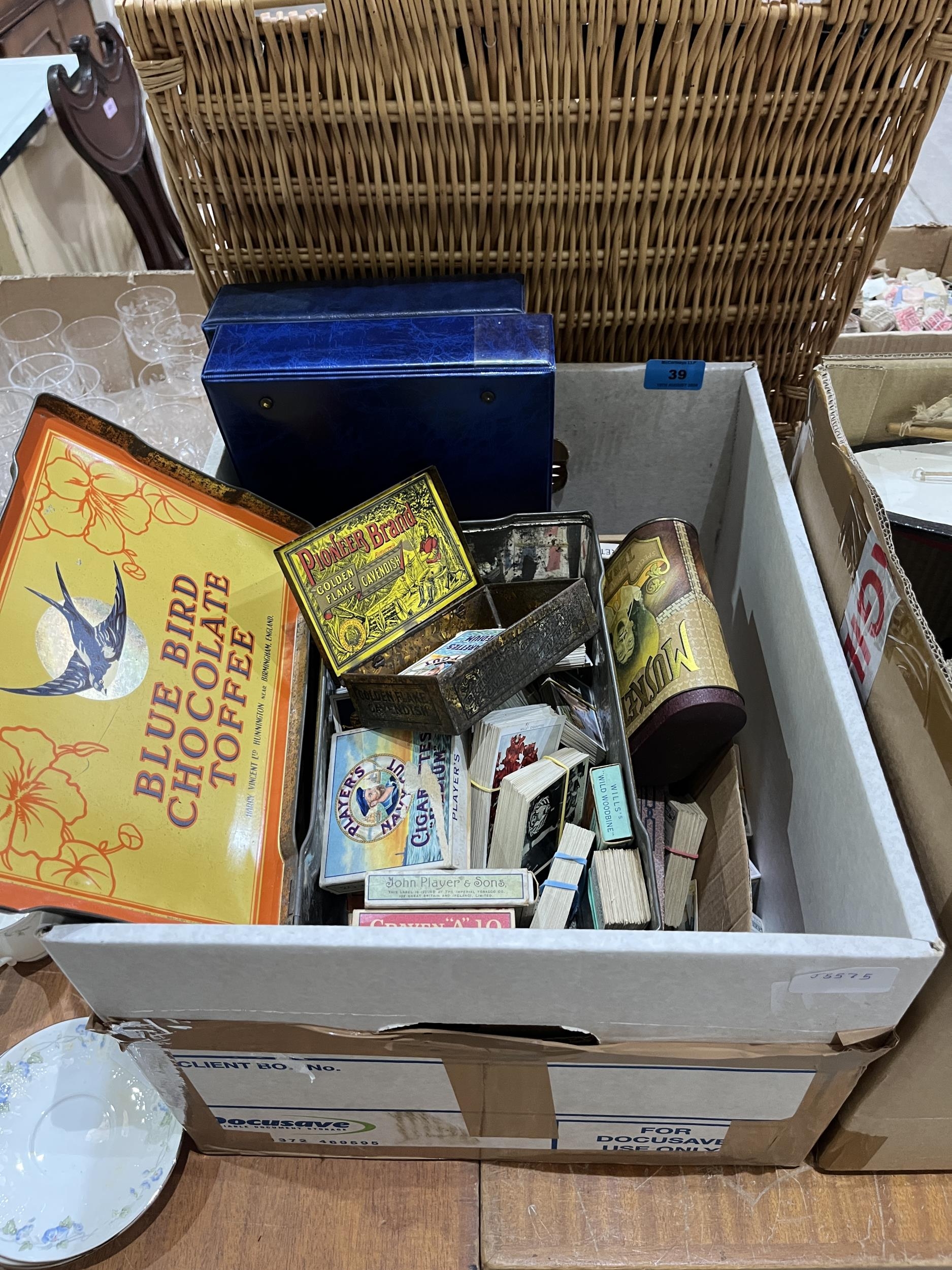 A box of cigarette cards in sets and part sets.