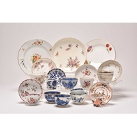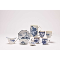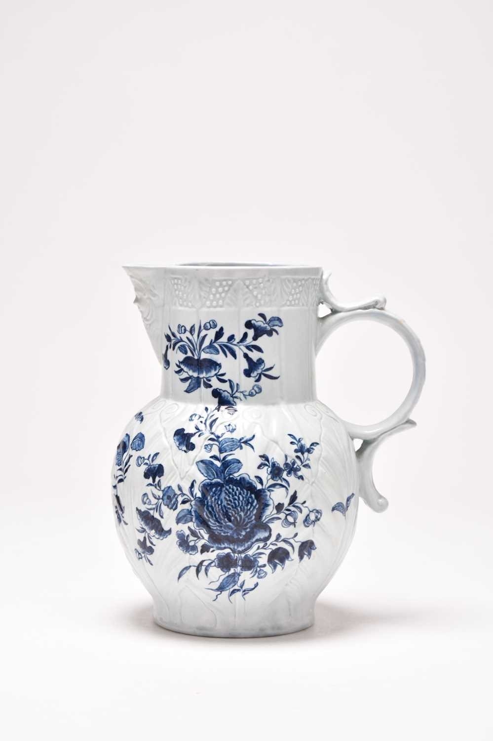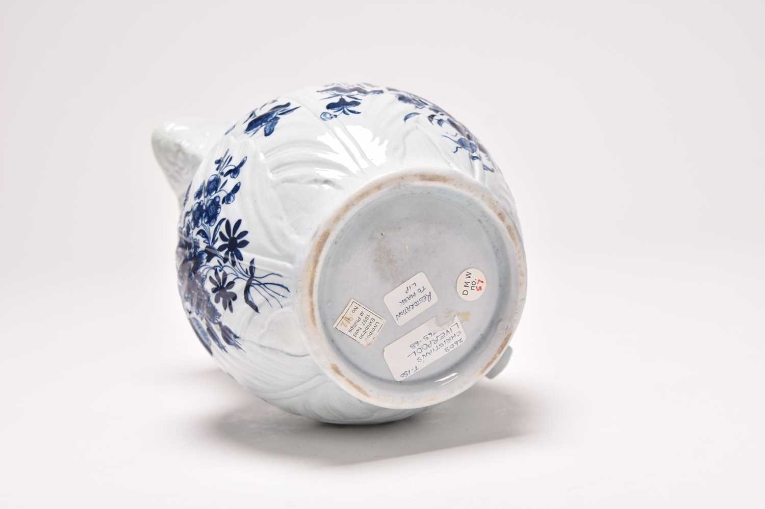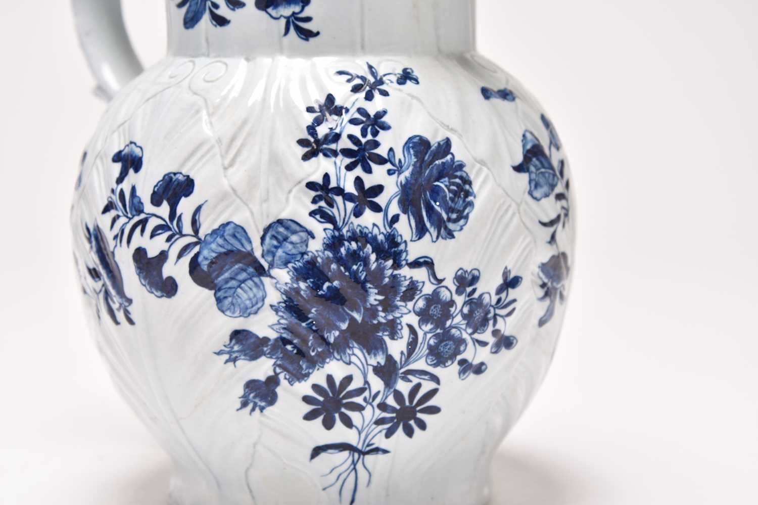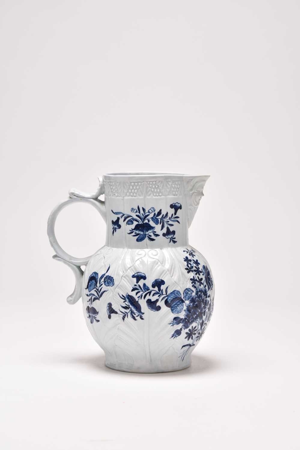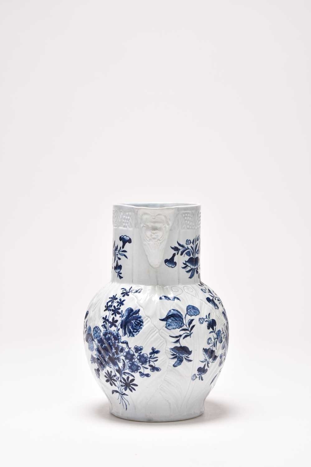 A Philip Christian (Liverpool) mask head cabbage-leaf moulded 'Dutch' jug, circa 1765-70, painted in underglaze blue with flowers, unmarked, 23.5cm high (restored) Provenance: David Waterhouse Collection. DMW no. 57. Exhibited at the 1997 Phillips Liverpool Exhibition, no. 9/2. Condition:Spout restored
