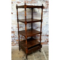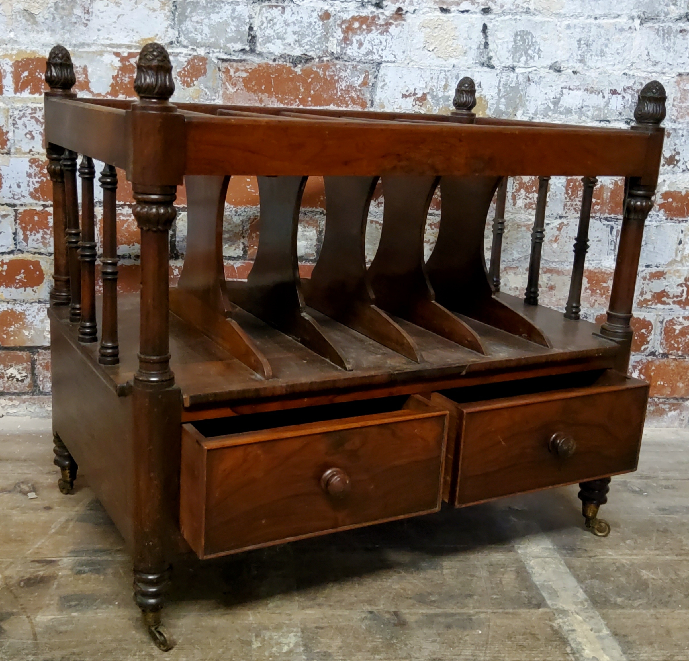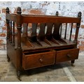 An early 19th century Regency rosewood Canterbury, two short drawers to base with six section rack raised on bobbin turned legs terminating in brass castors.
