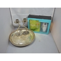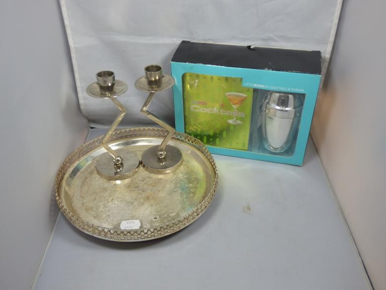 Silver plated tray with cocktail shaker and pair of candle sticks