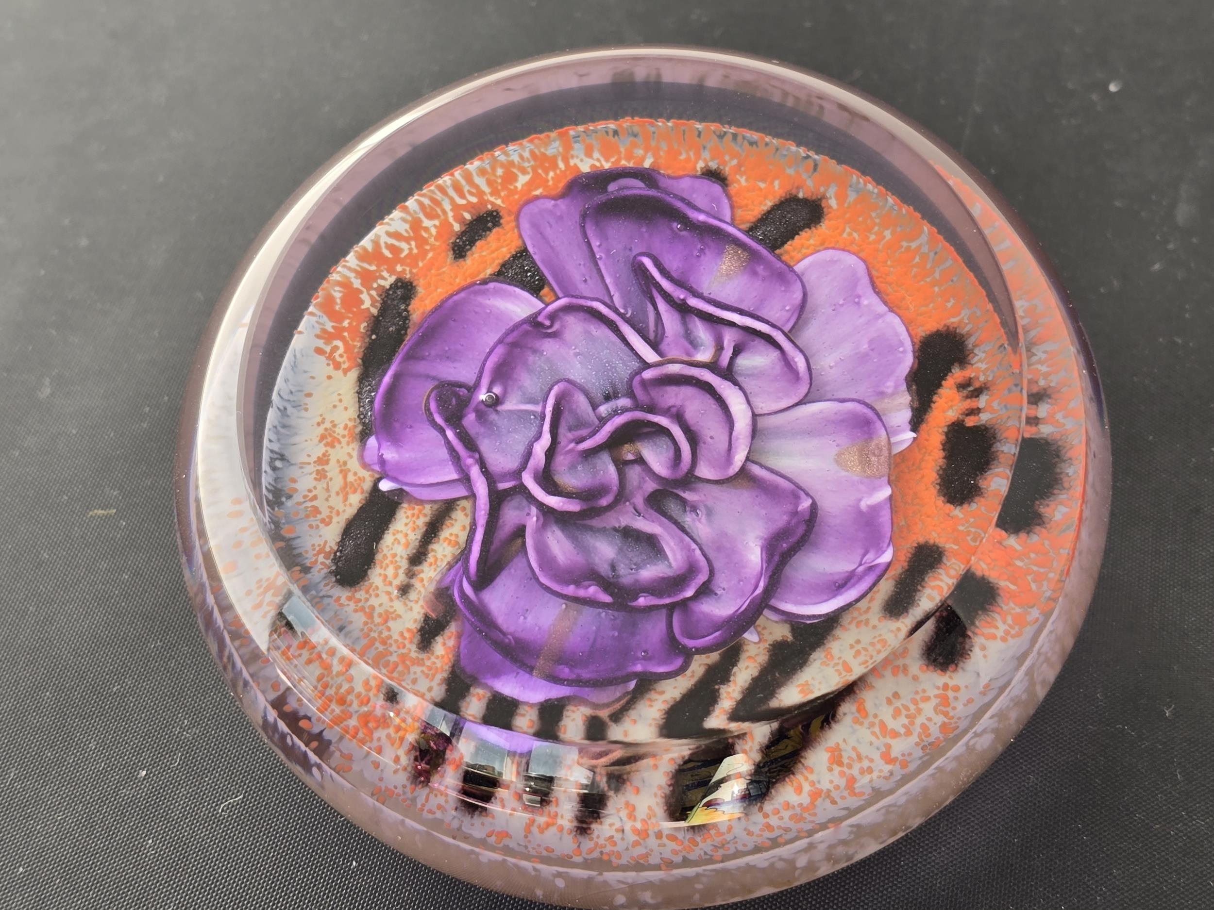 Caithness Glass "sexy beast" purple flower. Limited edition of 250. Low dome with angled top window, very good condition. Diam: 97mm or 3 3/4 ins. Height 34 to 42mm