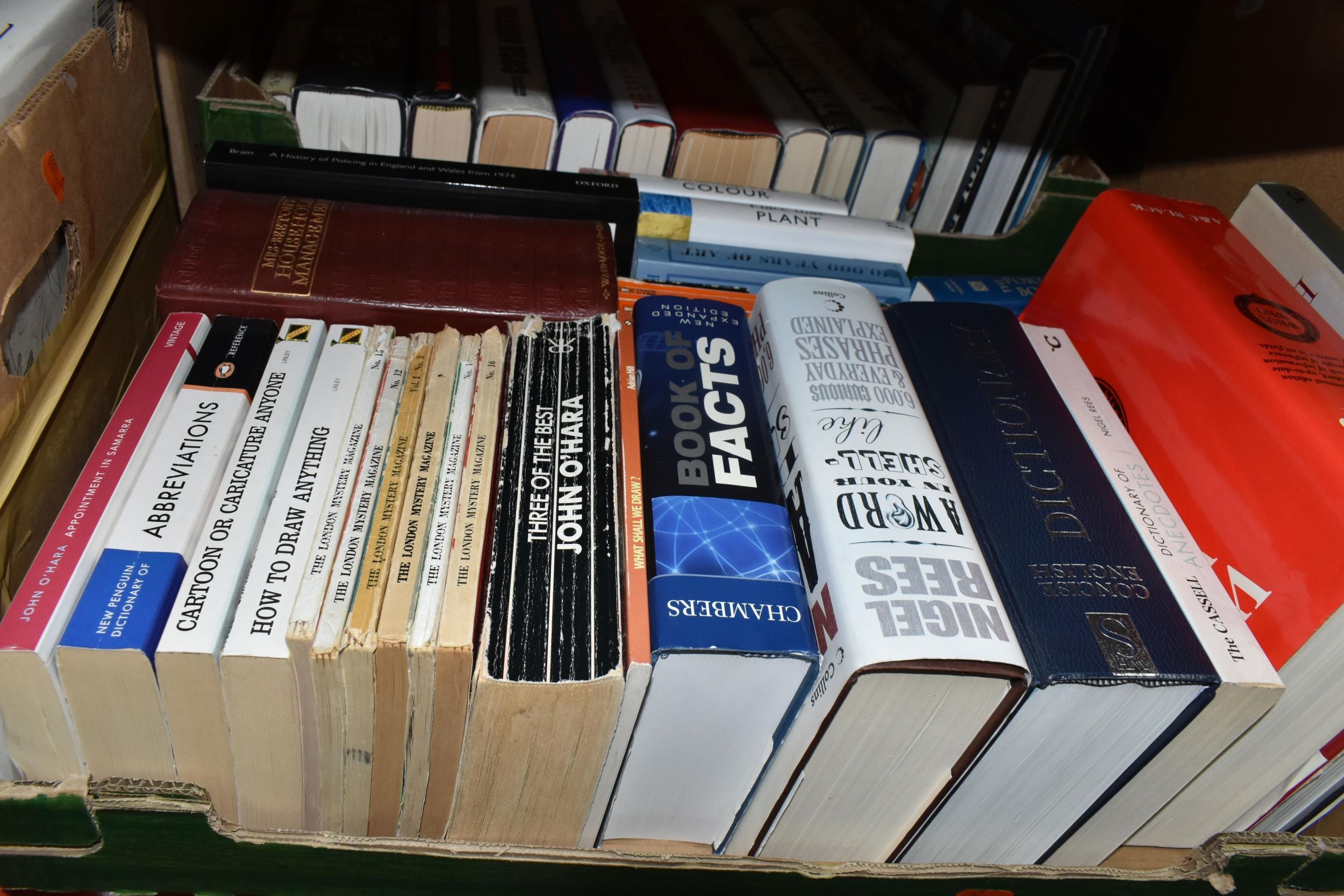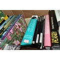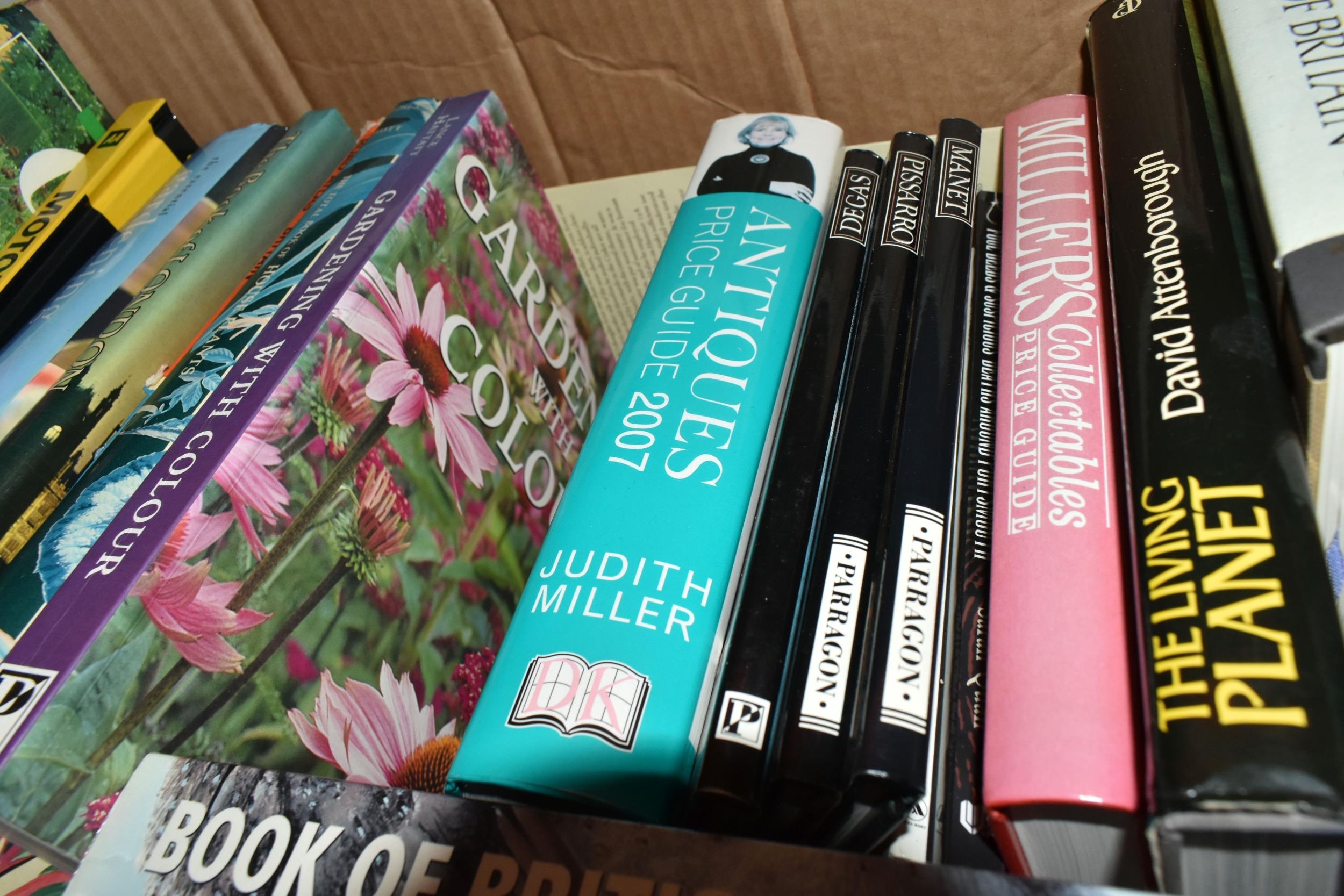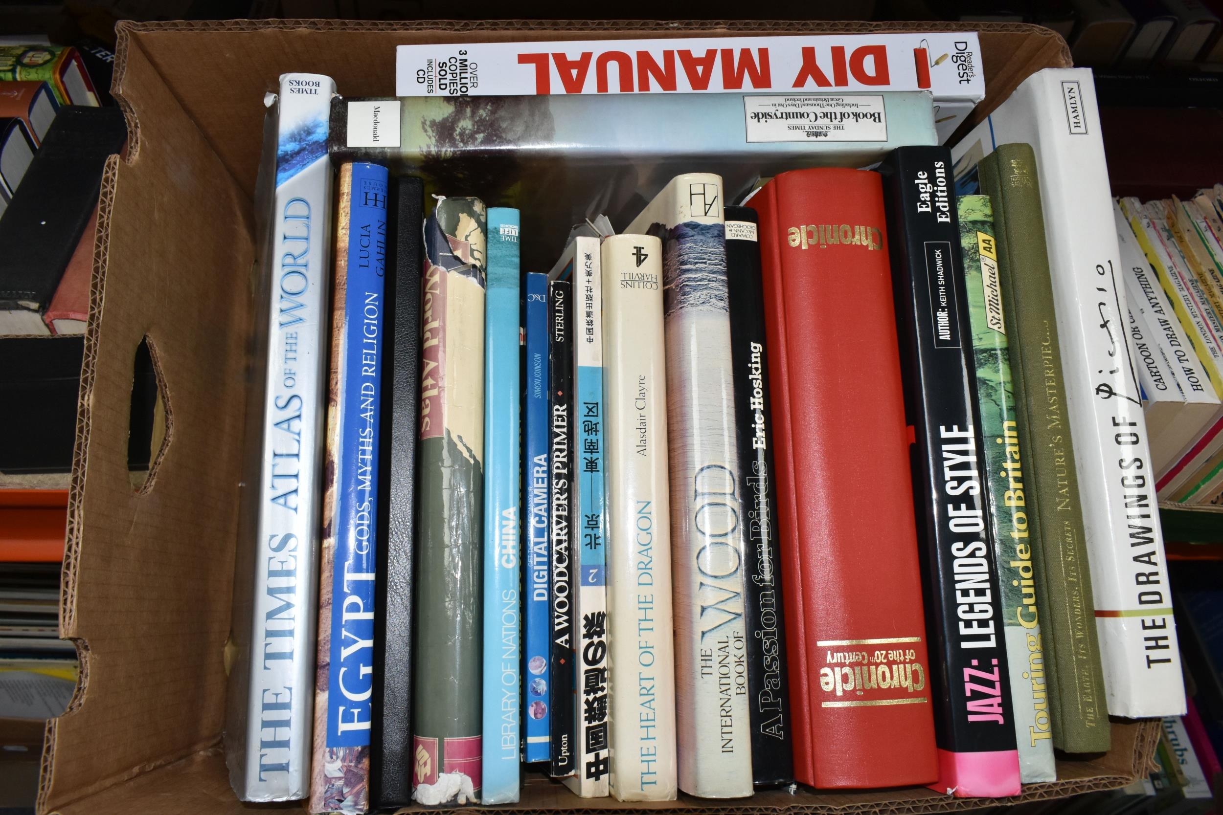 FIVE BOXES OF BOOKS containing over 90 miscellaneous titles in hardback and paperback formats, subjects include DIY, Atlas, Who's Who, Dictionary, Art, Countries, History, Biography, Nature, Birds, etc