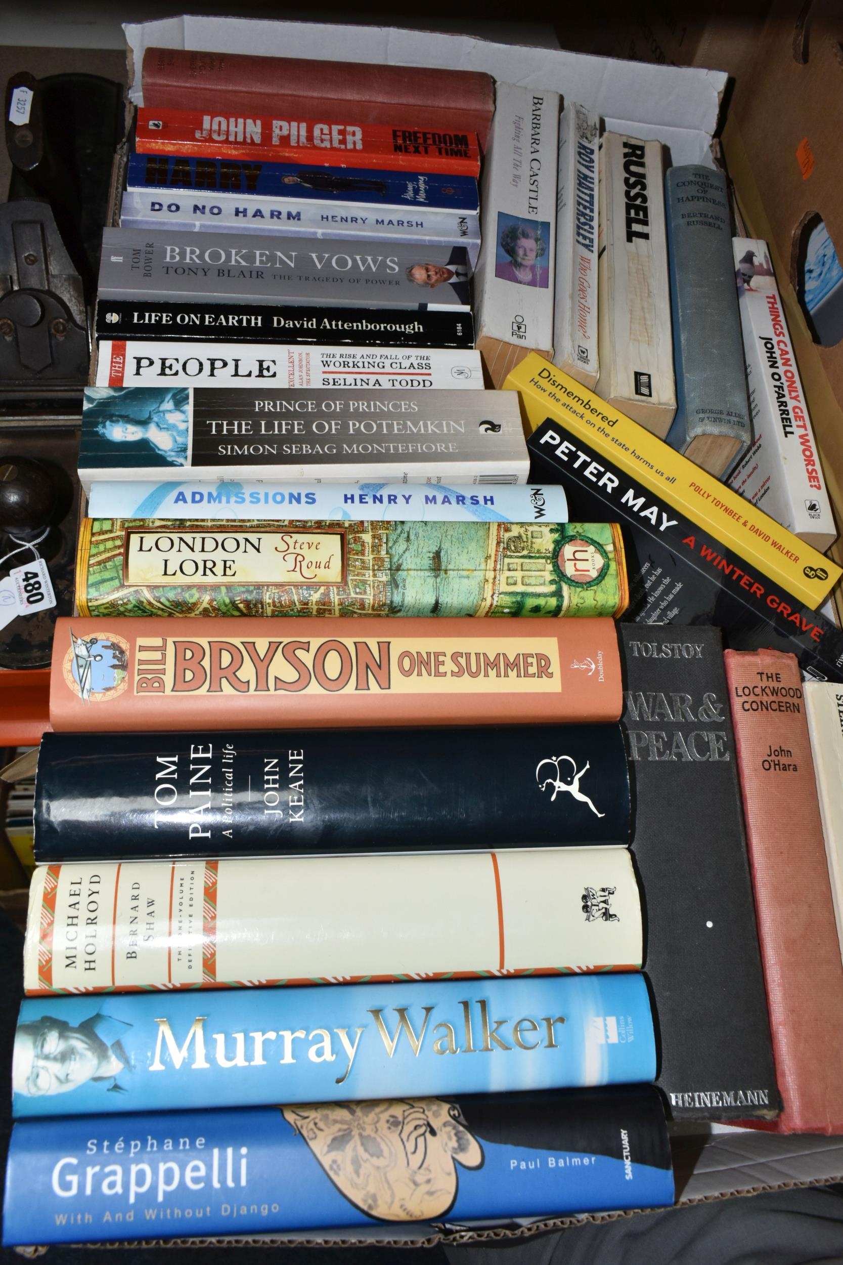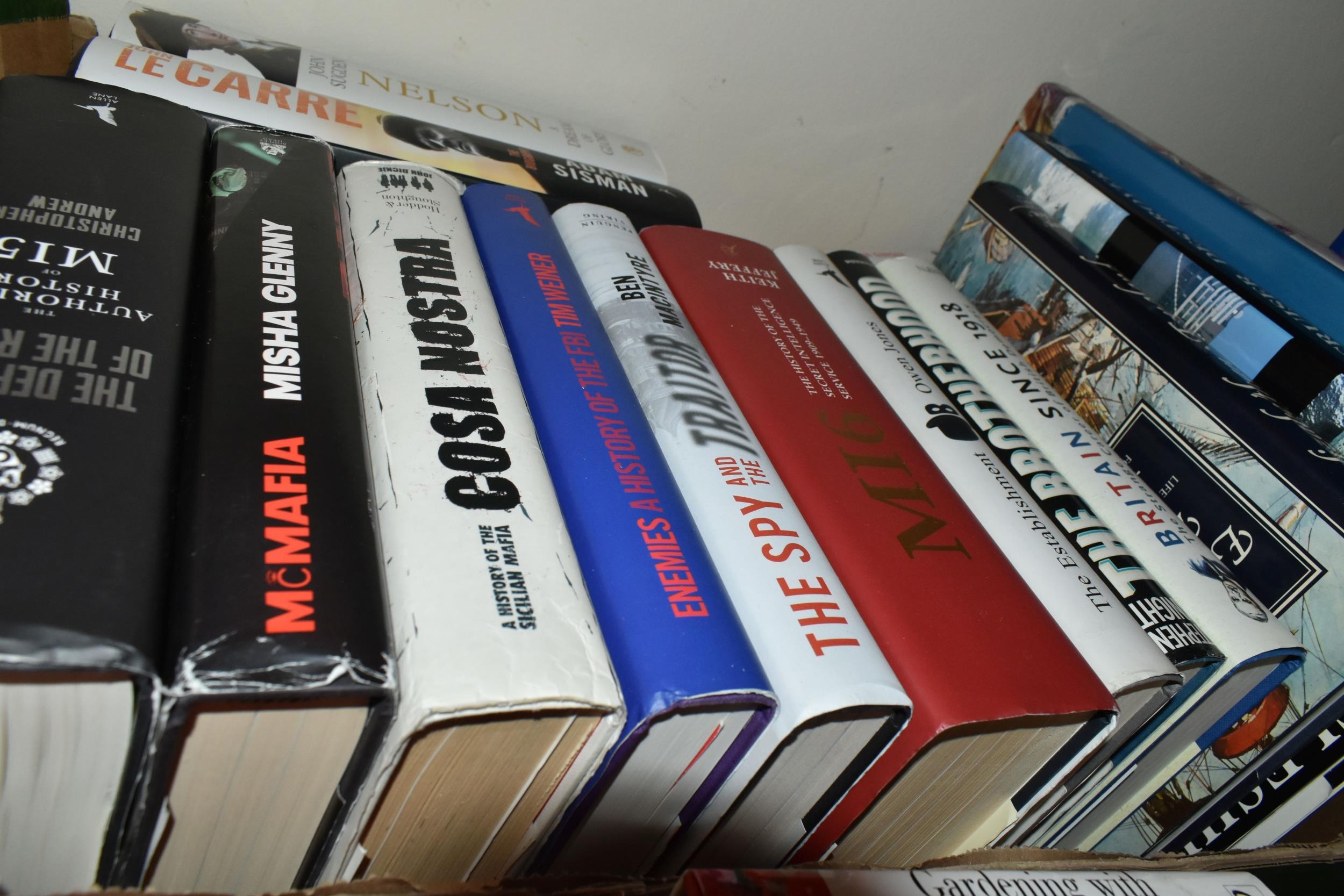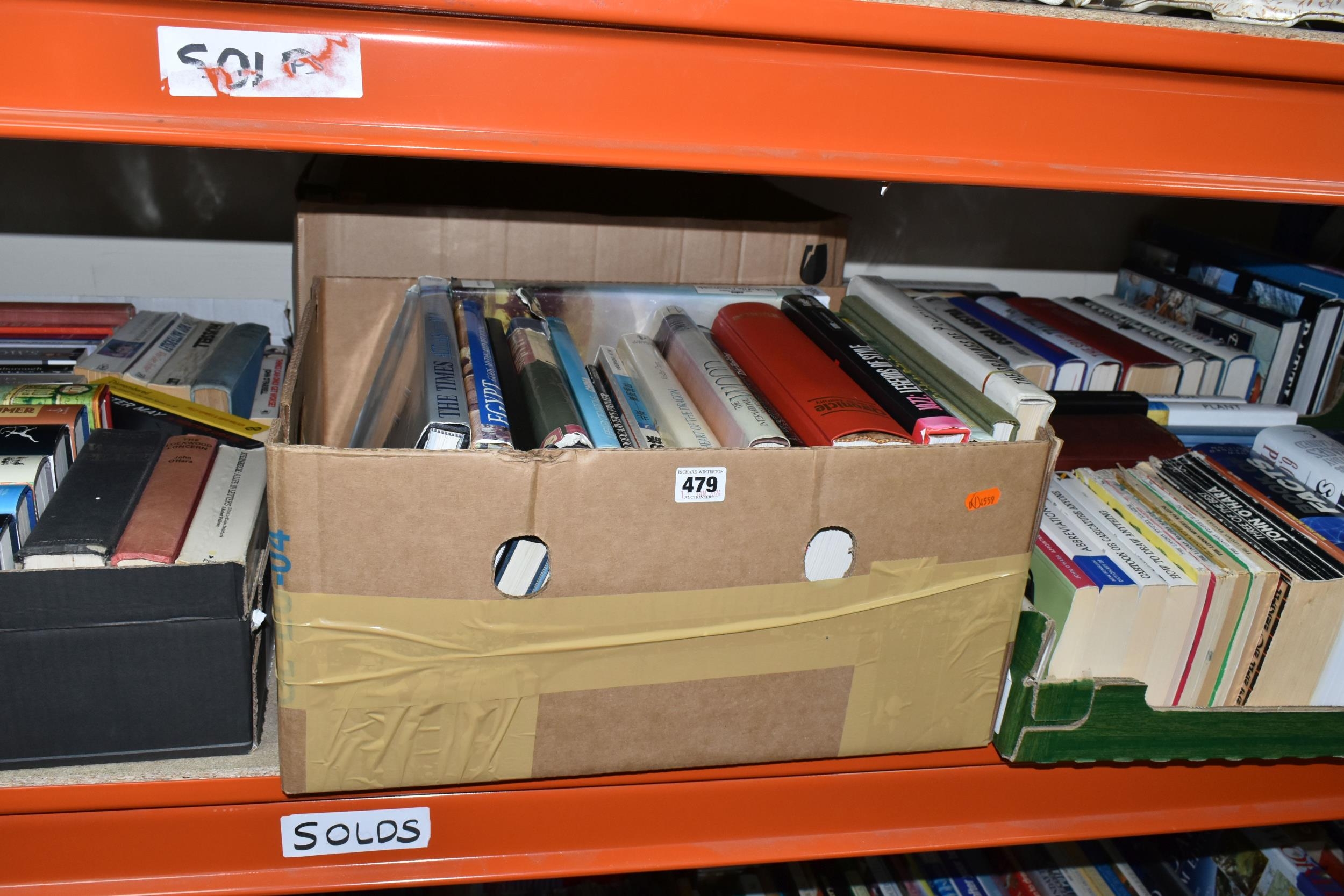 FIVE BOXES OF BOOKS containing over 90 miscellaneous titles in hardback and paperback formats, subjects include DIY, Atlas, Who's Who, Dictionary, Art, Countries, History, Biography, Nature, Birds, etc