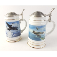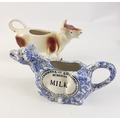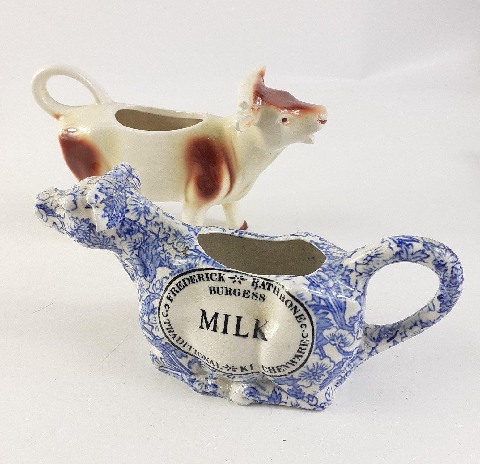 A delightful pair of MILK-POURING CERAMIC COWS! A floral blue and white Frederick Rathbone Burgess traditional kitchenware cow creamer milk jug (approx. 18cm in length), and a cream and brown cow creamer milk jug produced in West Germany (approx. 17cm in length).