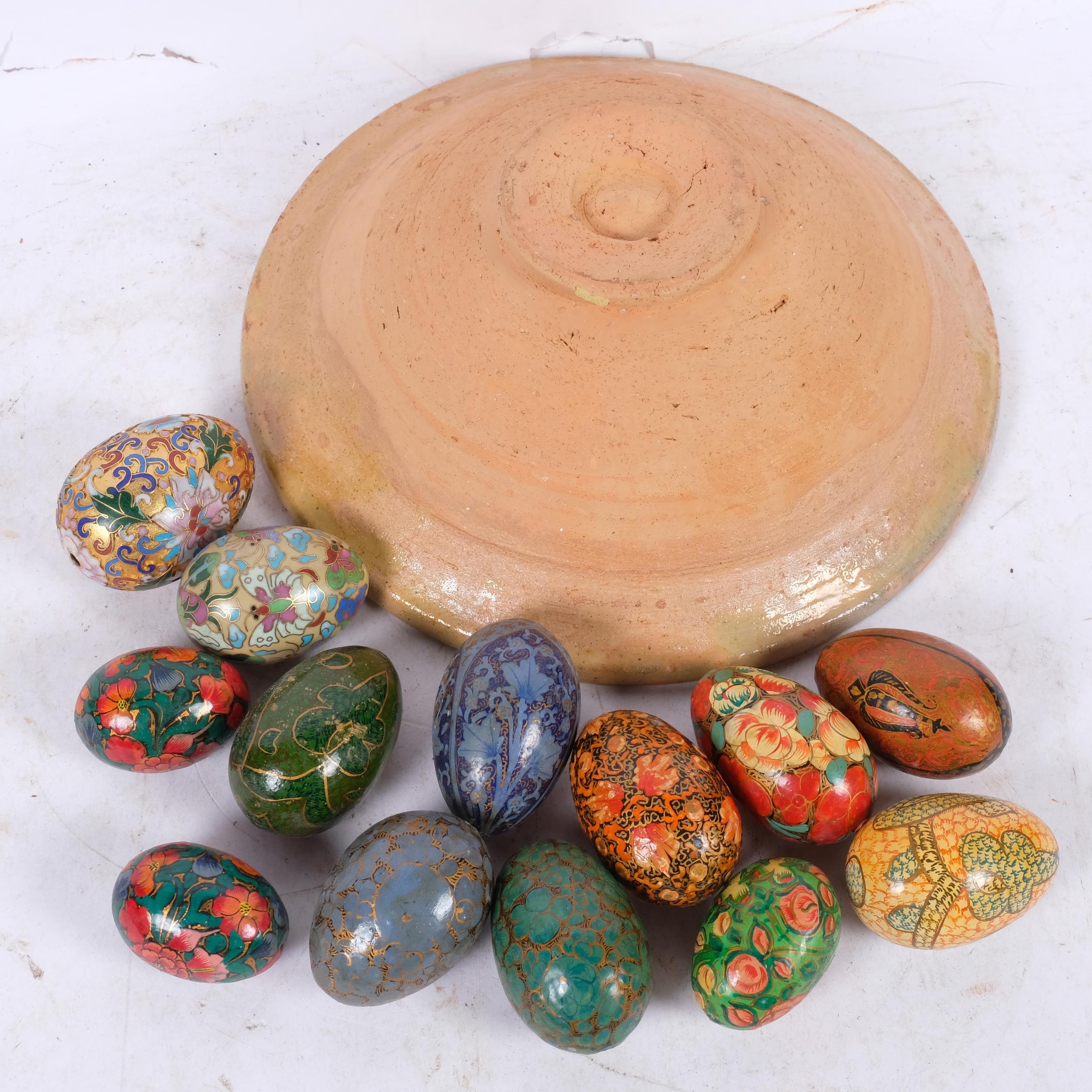 Slipware studio terracotta fruit bowl, diameter 27cm, and a collection of decorated papier mache and cloisonne eggs