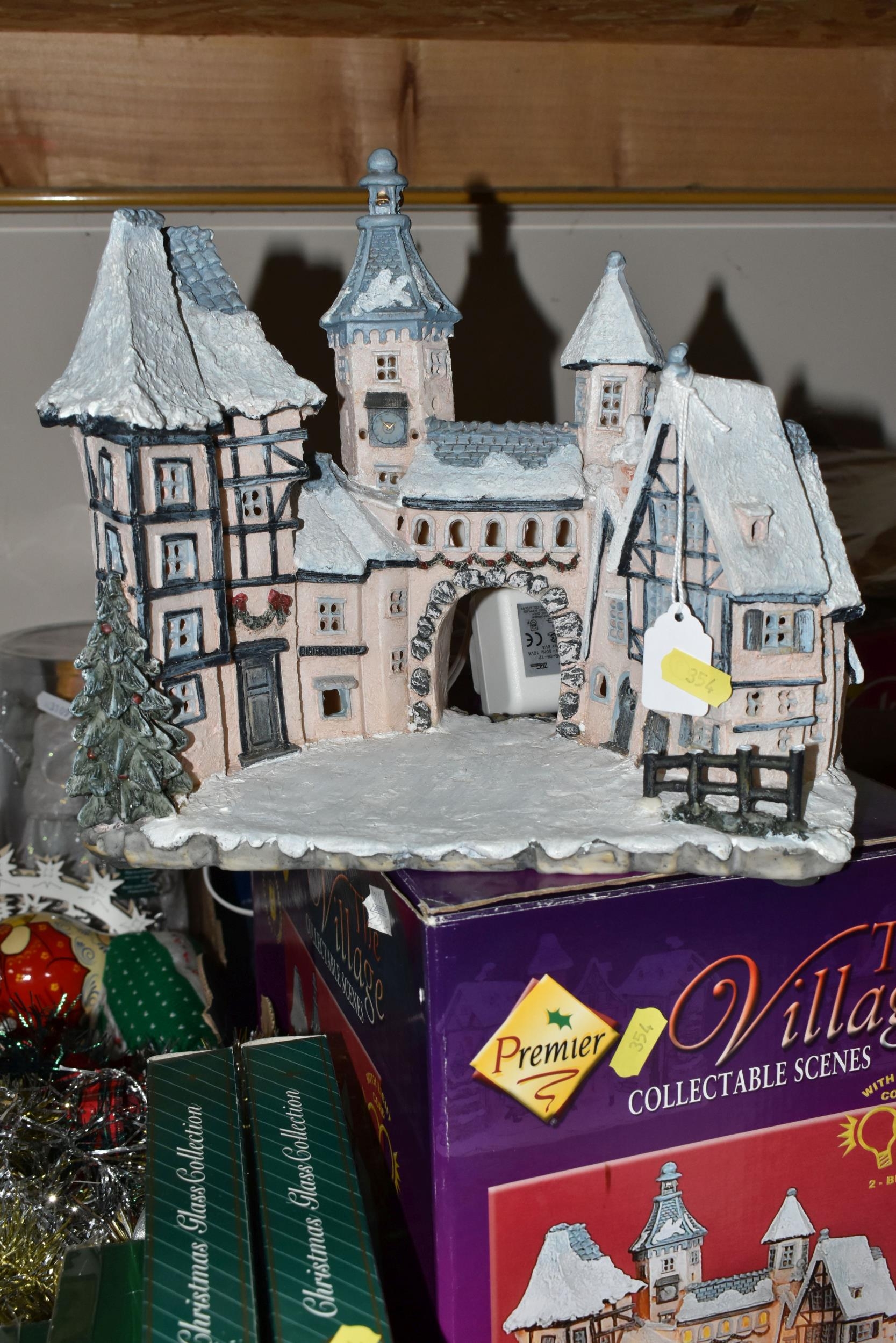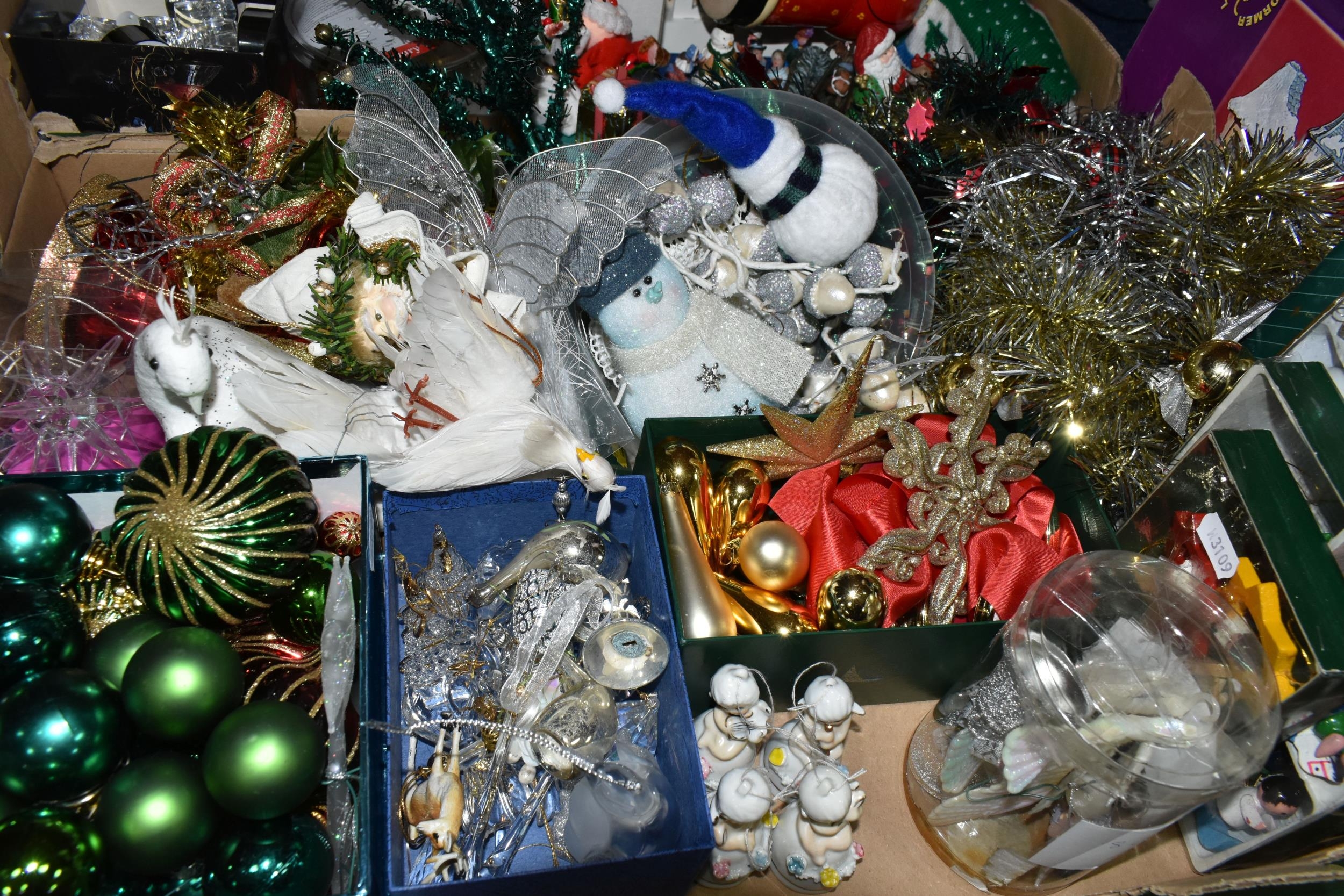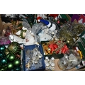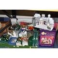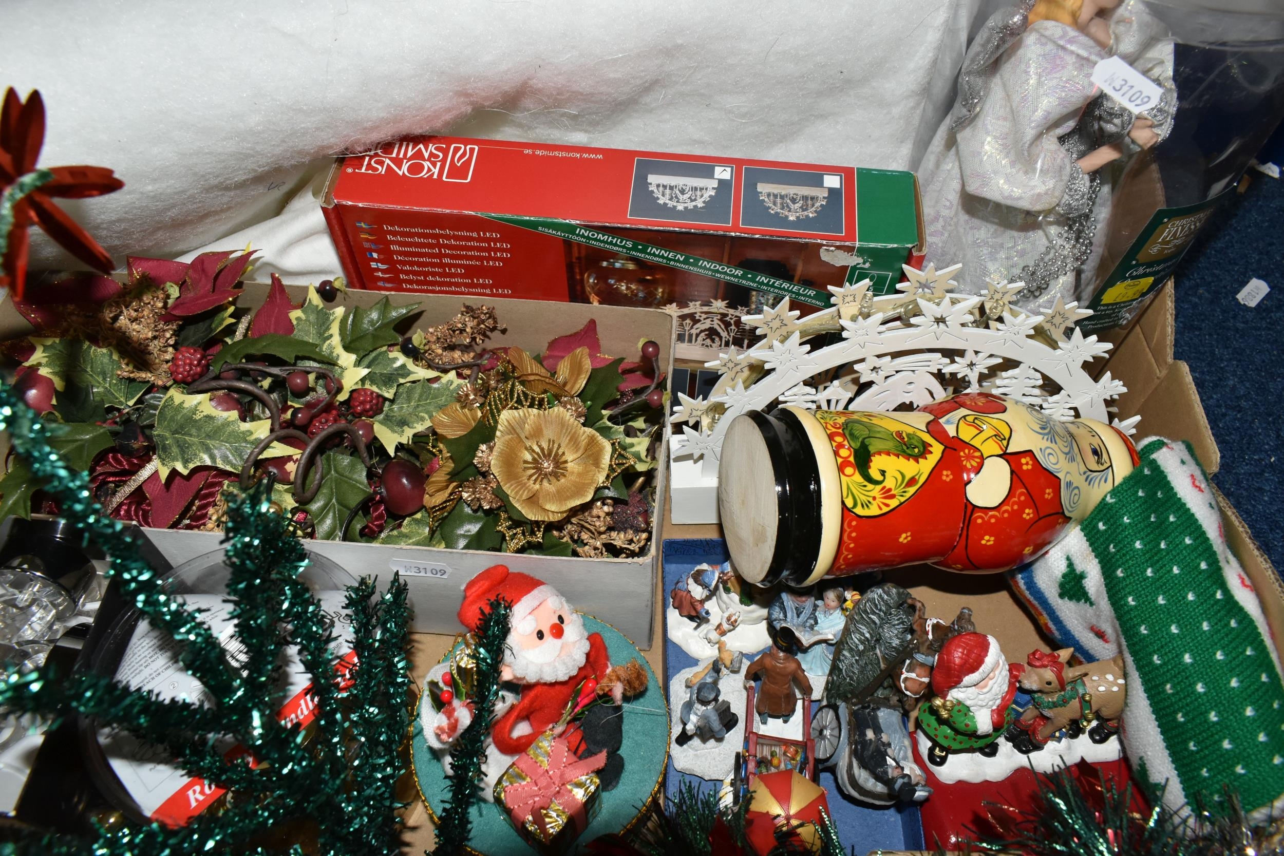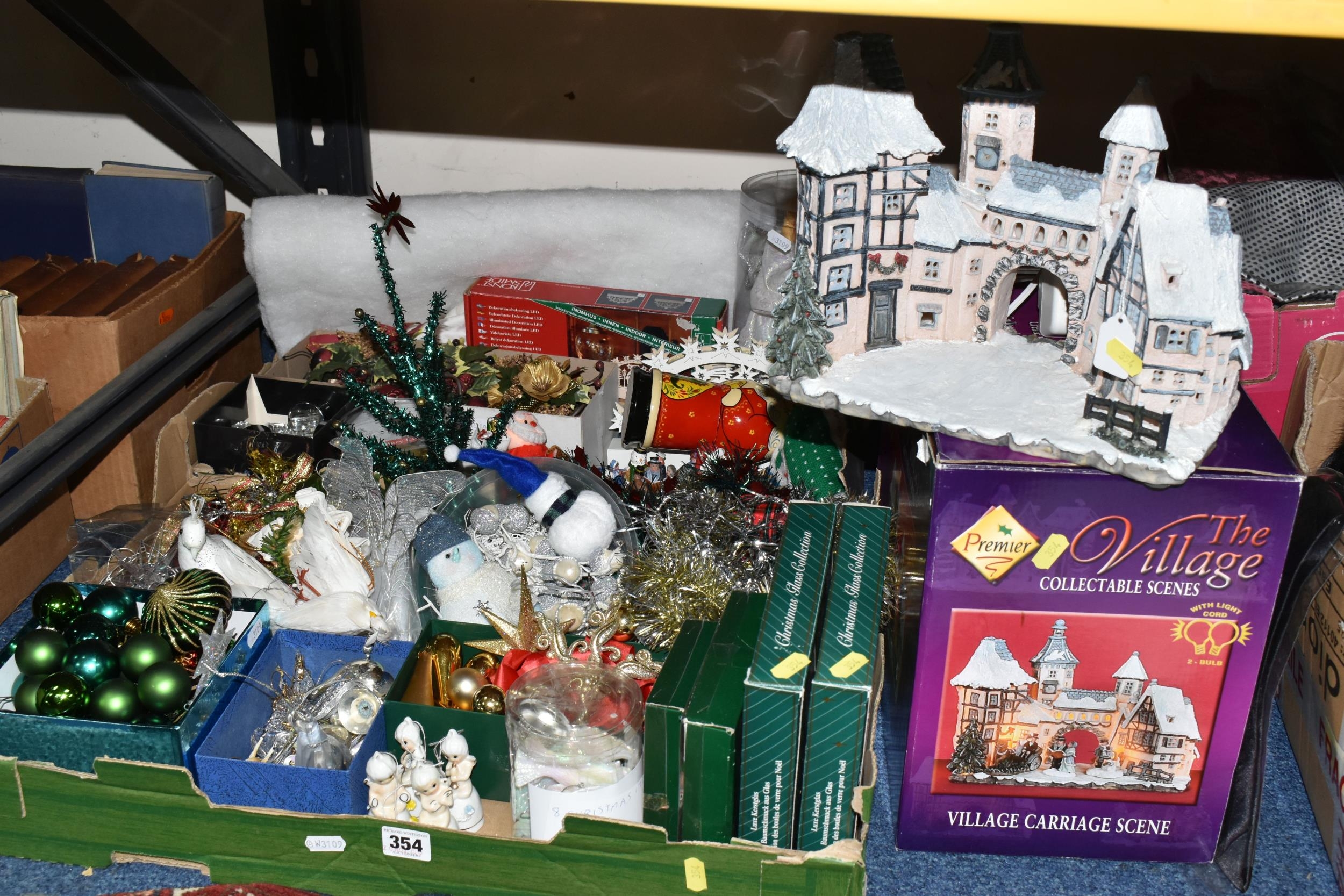 TWO BOXES OF CHRISTMAS DECORATIONS, to include a boxed illuminated 'Village Carriage' scene, boxed baubles, a Santa Claus Russian doll, tinsel, fairies, etc. (s.d) (2 boxes)