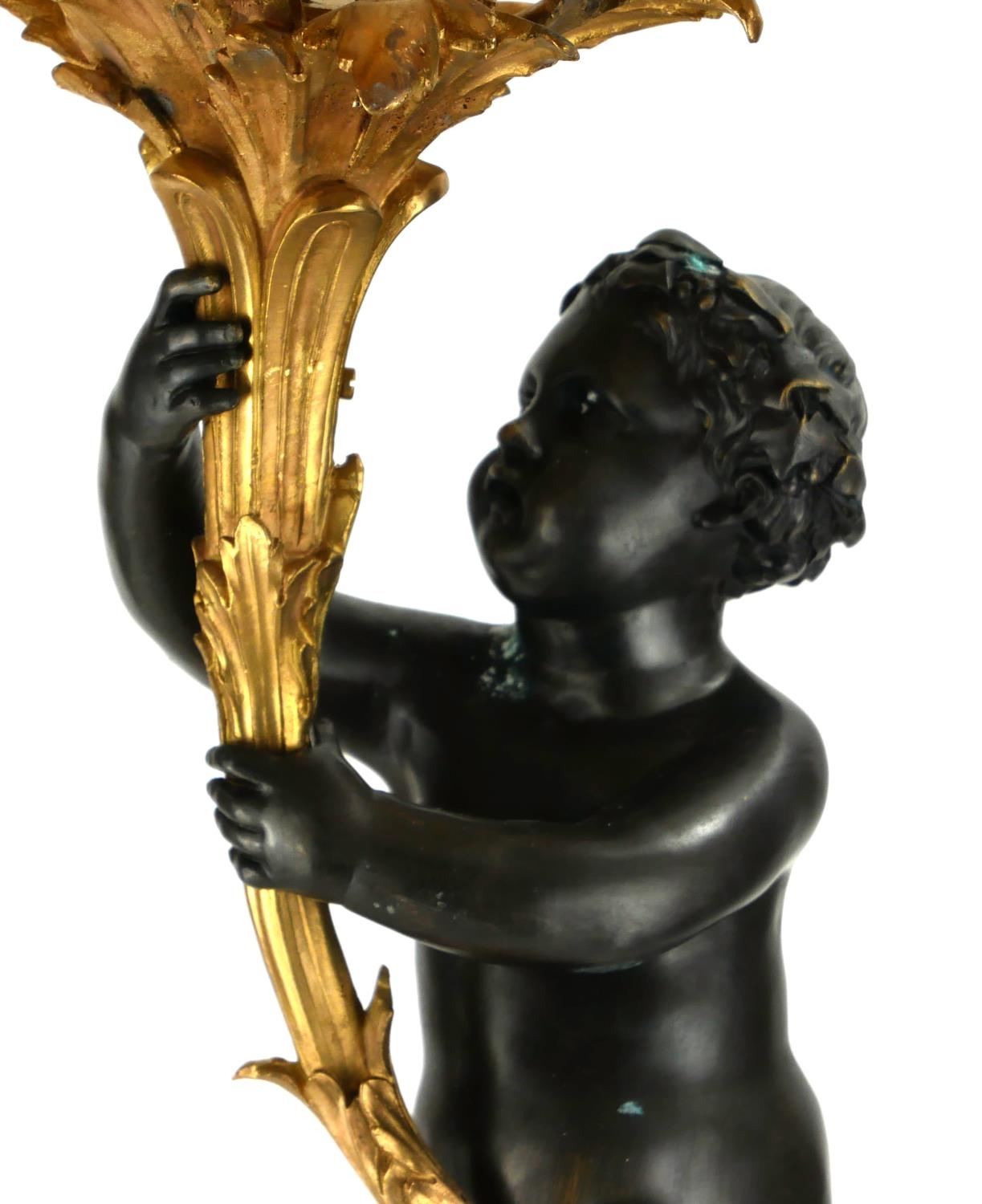 A LARGE PAIR OF GILT AND PATINATED BRONZE SIX SCONCE CANDELABRA IN THE FORM OF PUTTI
