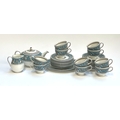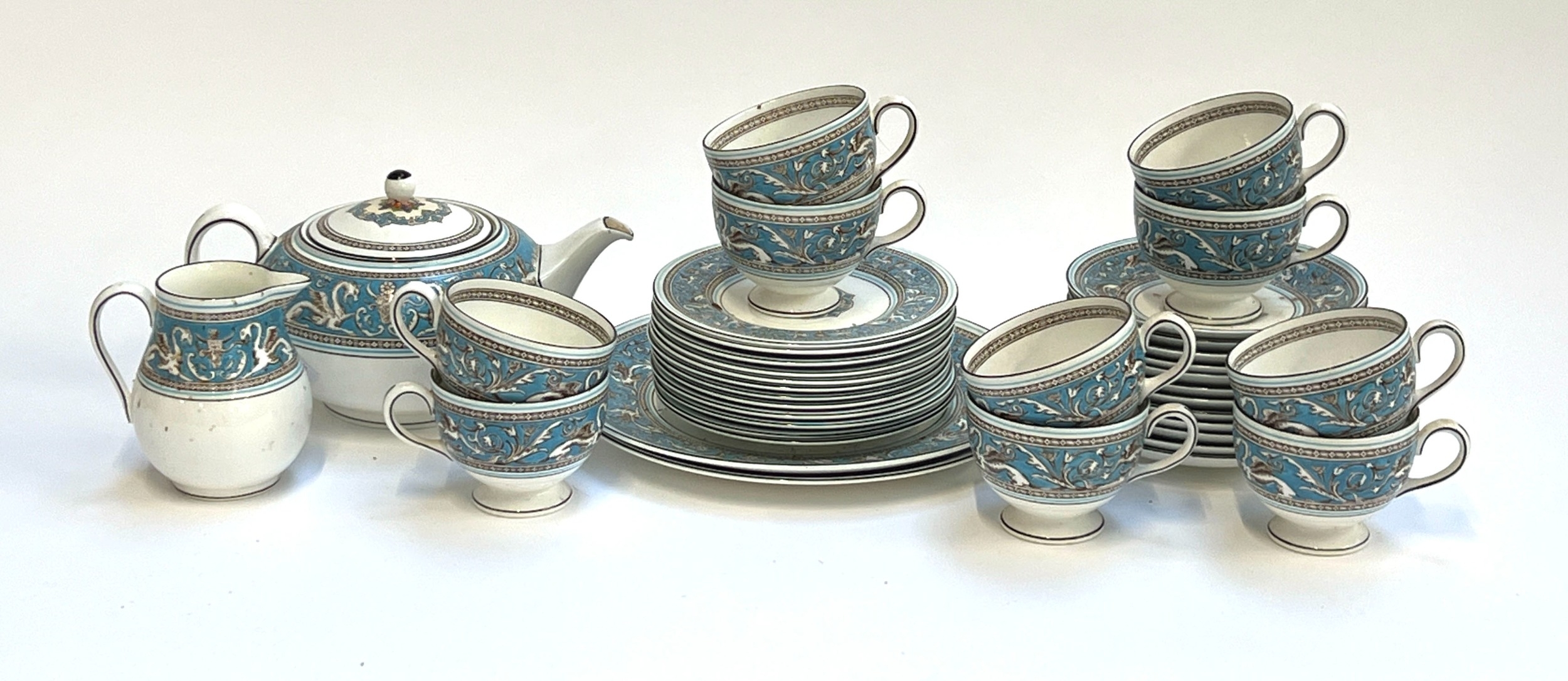 A Wedgwood Florentine part tea service in turquoise, approx. 39 pieces, comprising teapot, teacups, saucers, side plates, cake plates and milk jug
