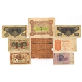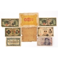 A small quantity of vintage Japanese and Chinese banknotes to include The Republic of China Military banknote one dollar local currency printed in red Shanghai, Nippon Dinko one yen, three Japanese ten yen banknotes, a Chinese Nanking Exchange Office of the Financial Department Kiansu five dollars 1912 and a used block of thirty Chinese Imperial Post one cent stamps overprinted with Chinese Republic in Chinese characters.