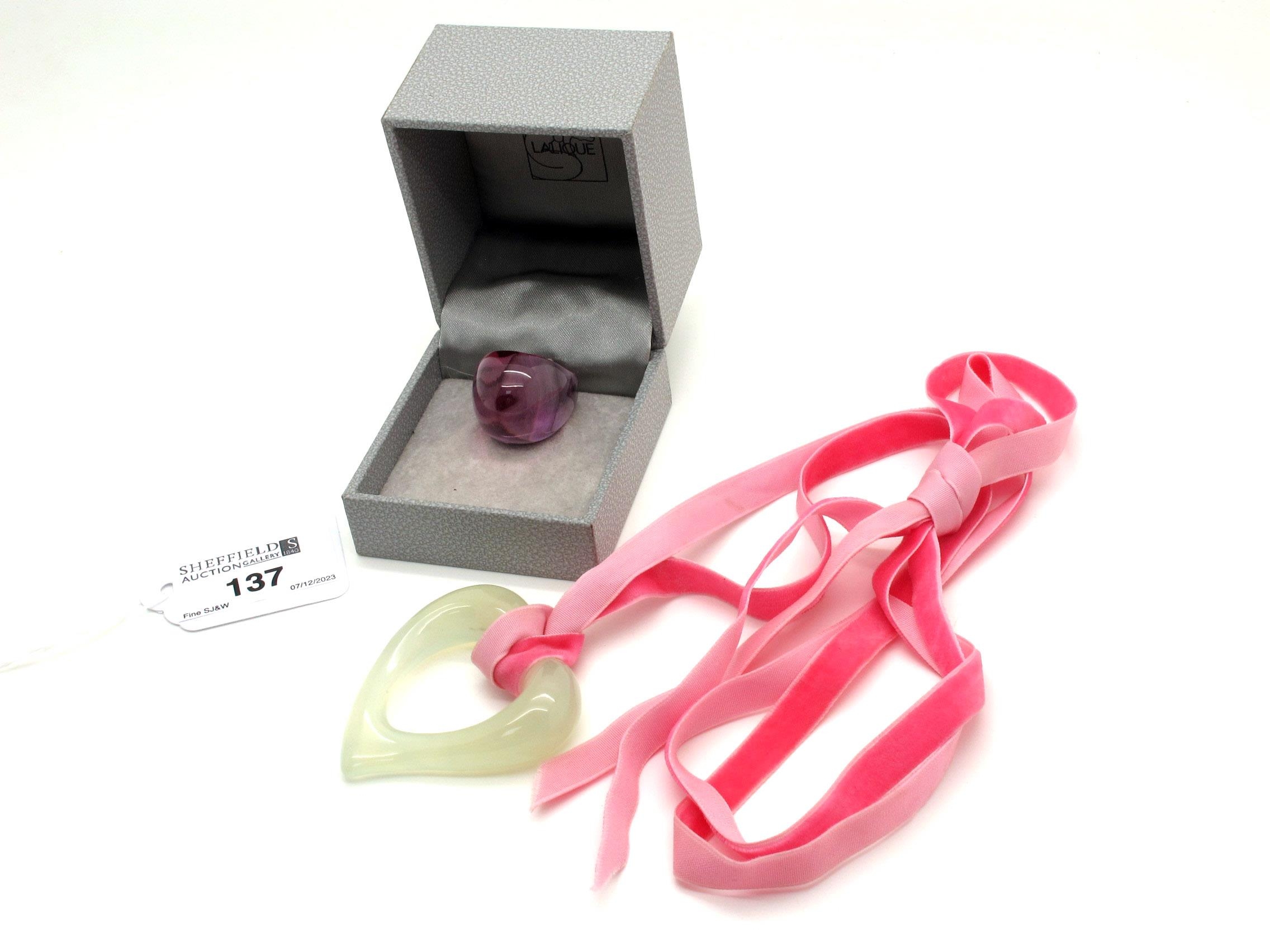 Lalique; A Modern Ring, purple, signed "Lalique France" (finger size N), in original box; Together with A Modern Green Heart Pendant, on pink ribbon. (2)
