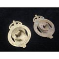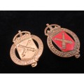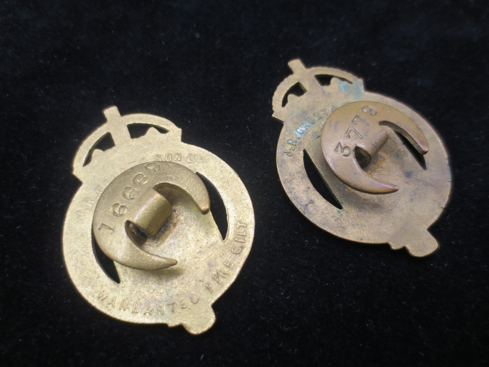 A War Munitions Volunteer badge with enamelled front, marked to the reverse JR Gaunt & Son Ltd and numbered 3779, and another without the enamel arms, same maker, numbered 16689 and 'Warranted Fire Gilt' beneath, both in very good order, King's Crown.
