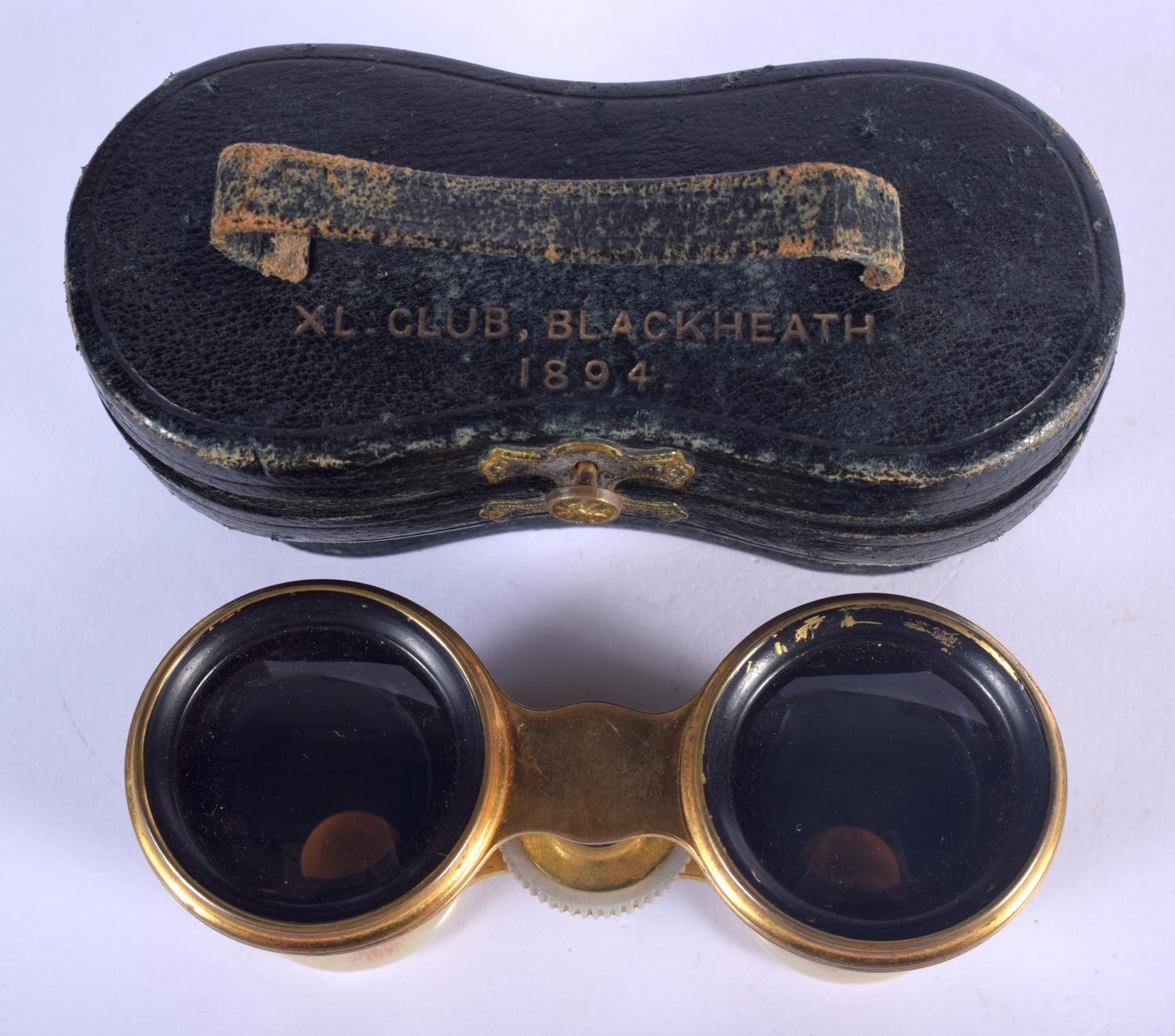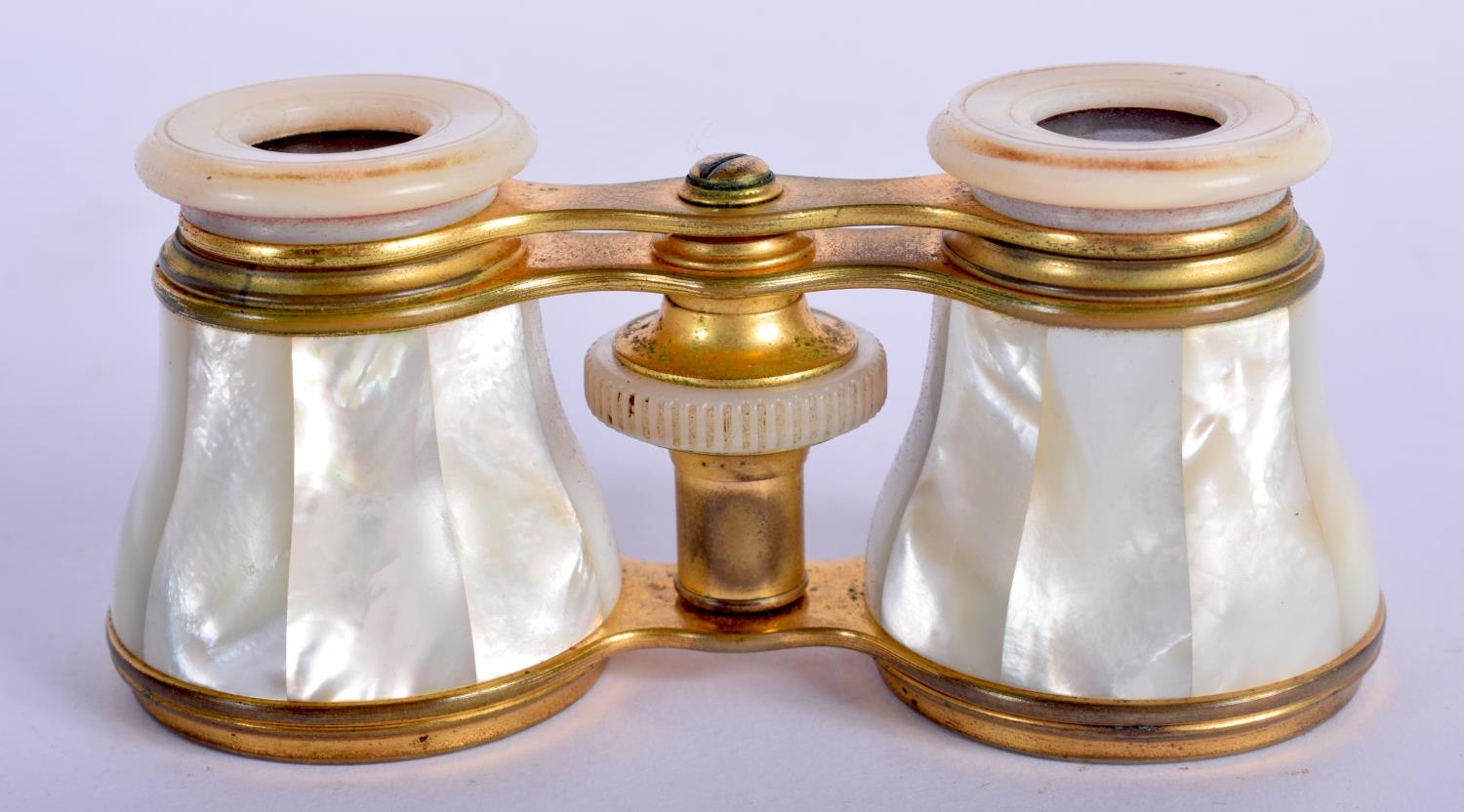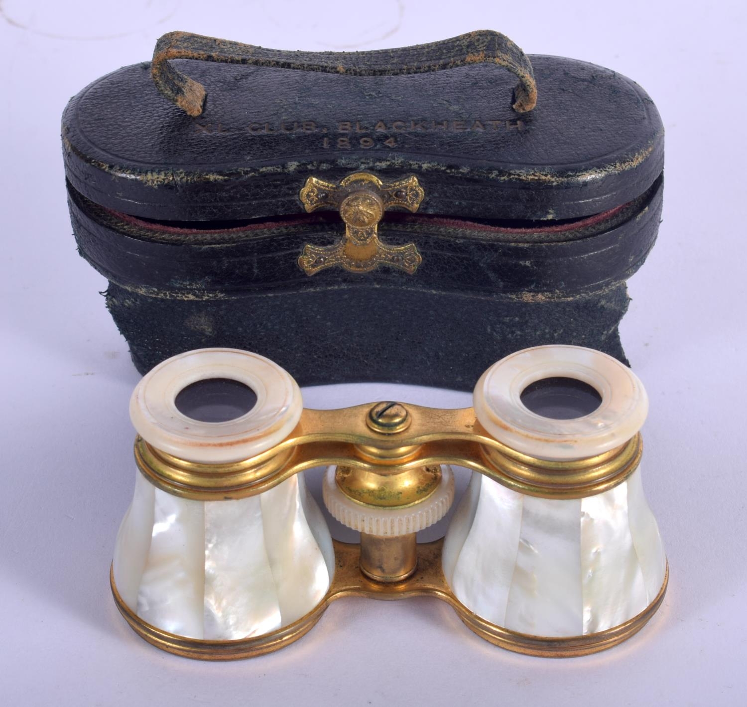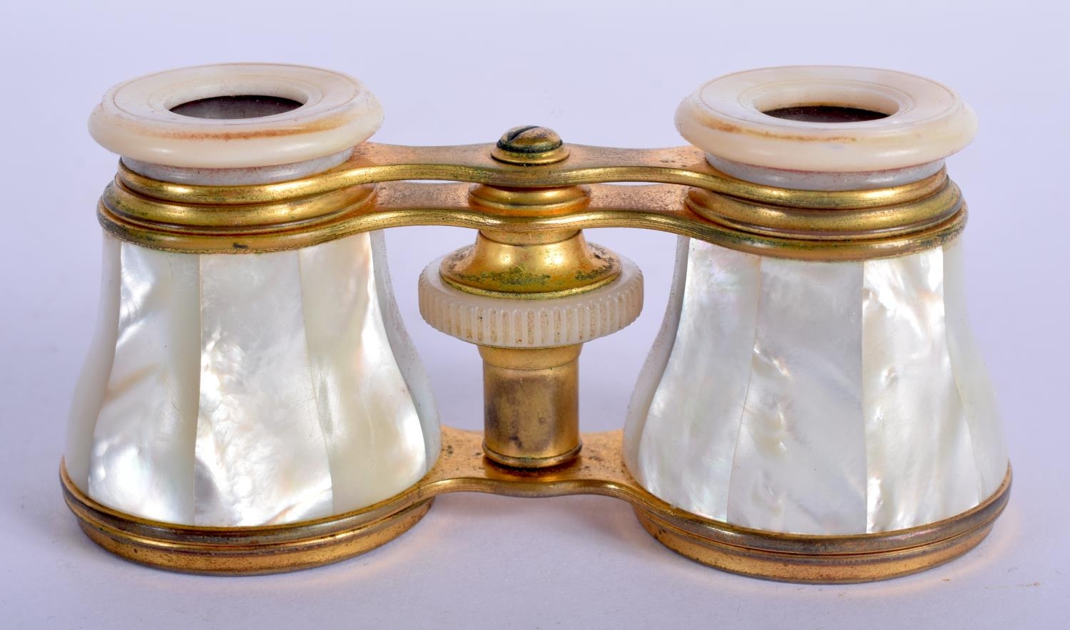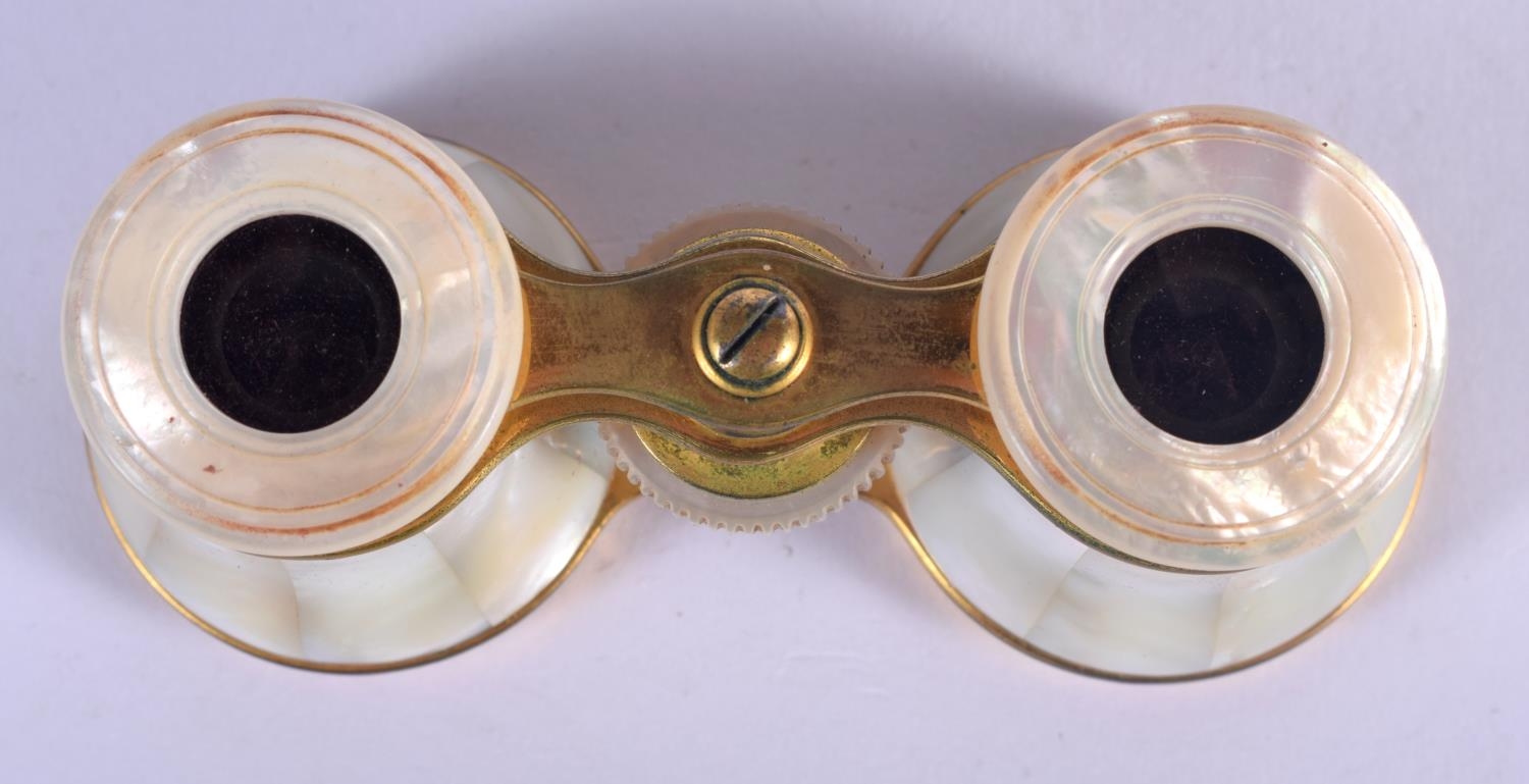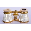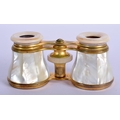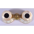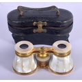 A PAIR OF ANTIQUE MOTHER OF PEARL BINOCULARS with leather case. 9 cm x 6.5 cm extended.