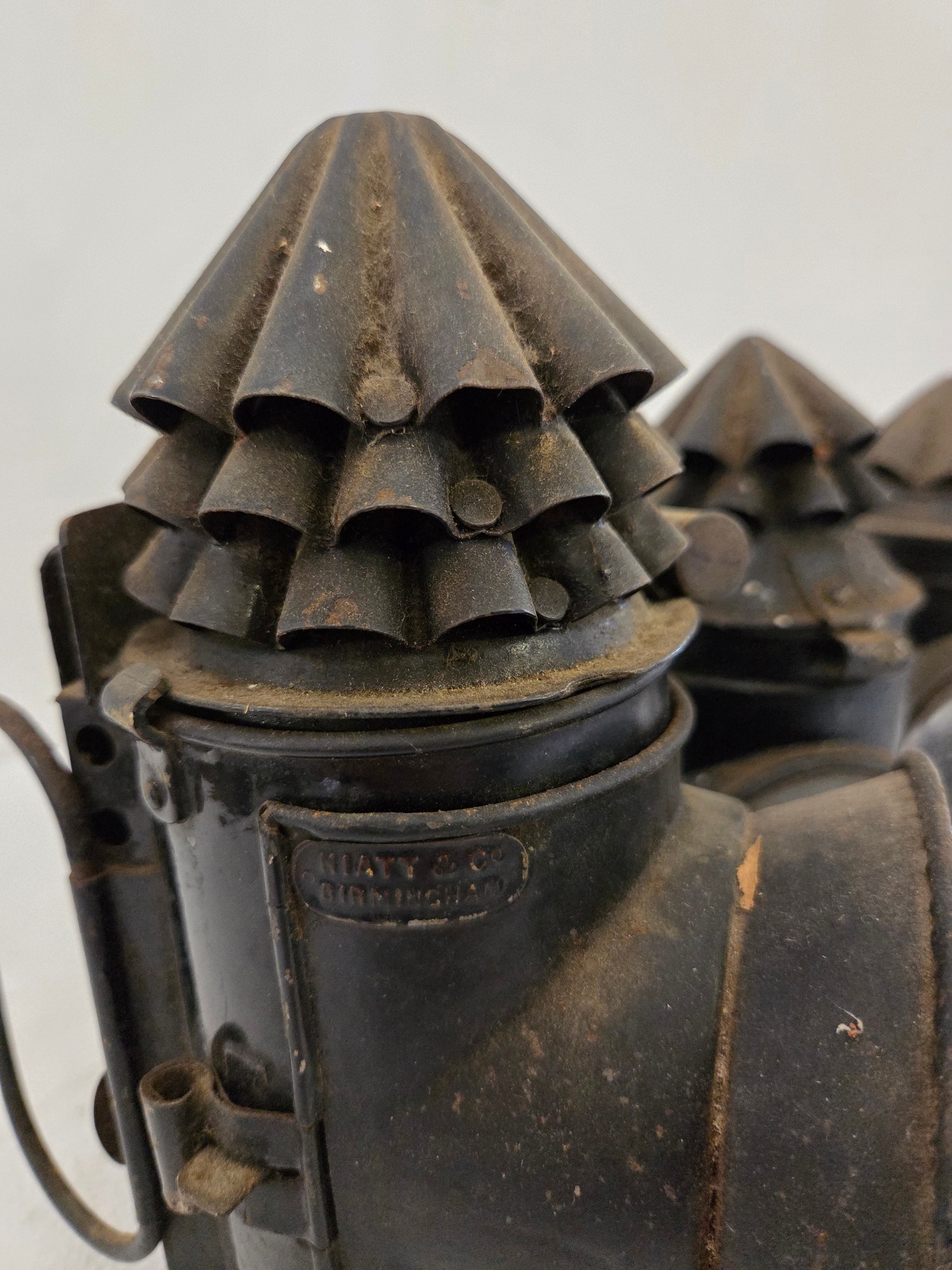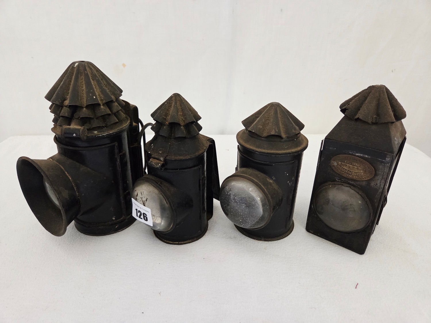 Four vintage police handheld carbide lamps incl. Hetherington & Co