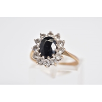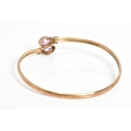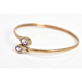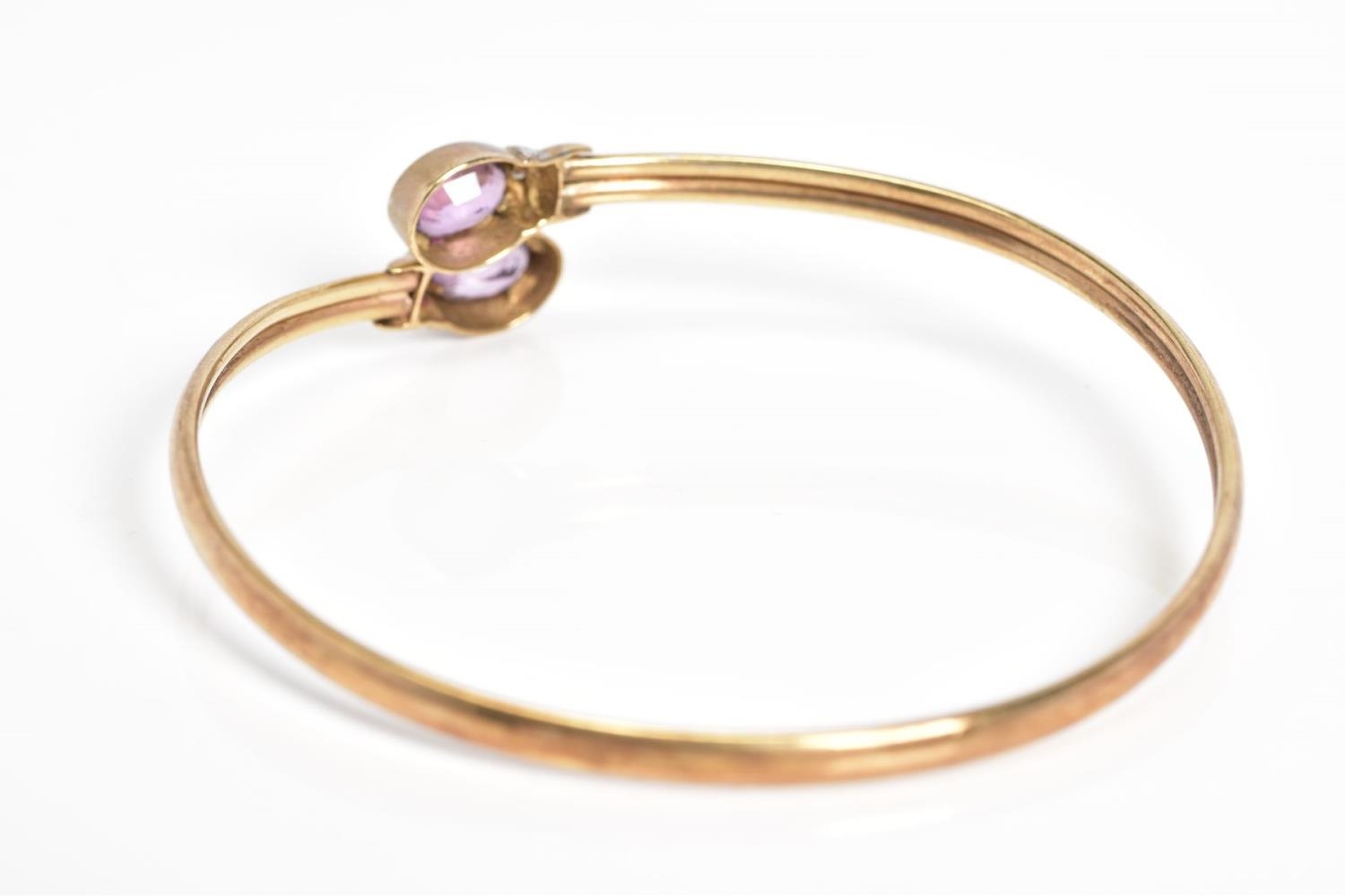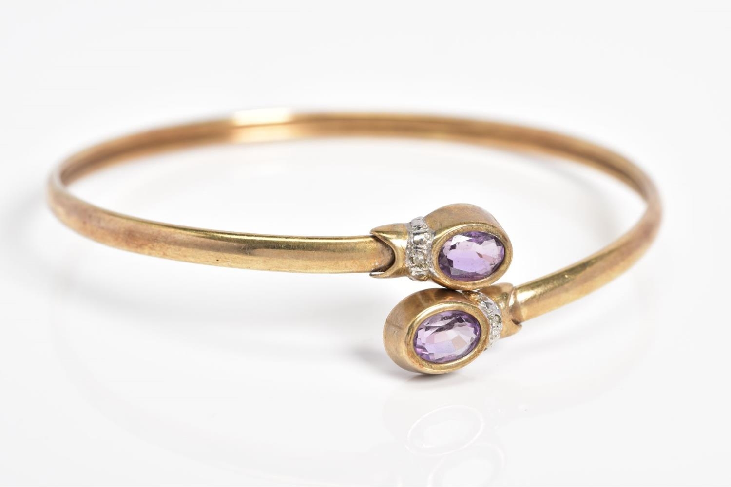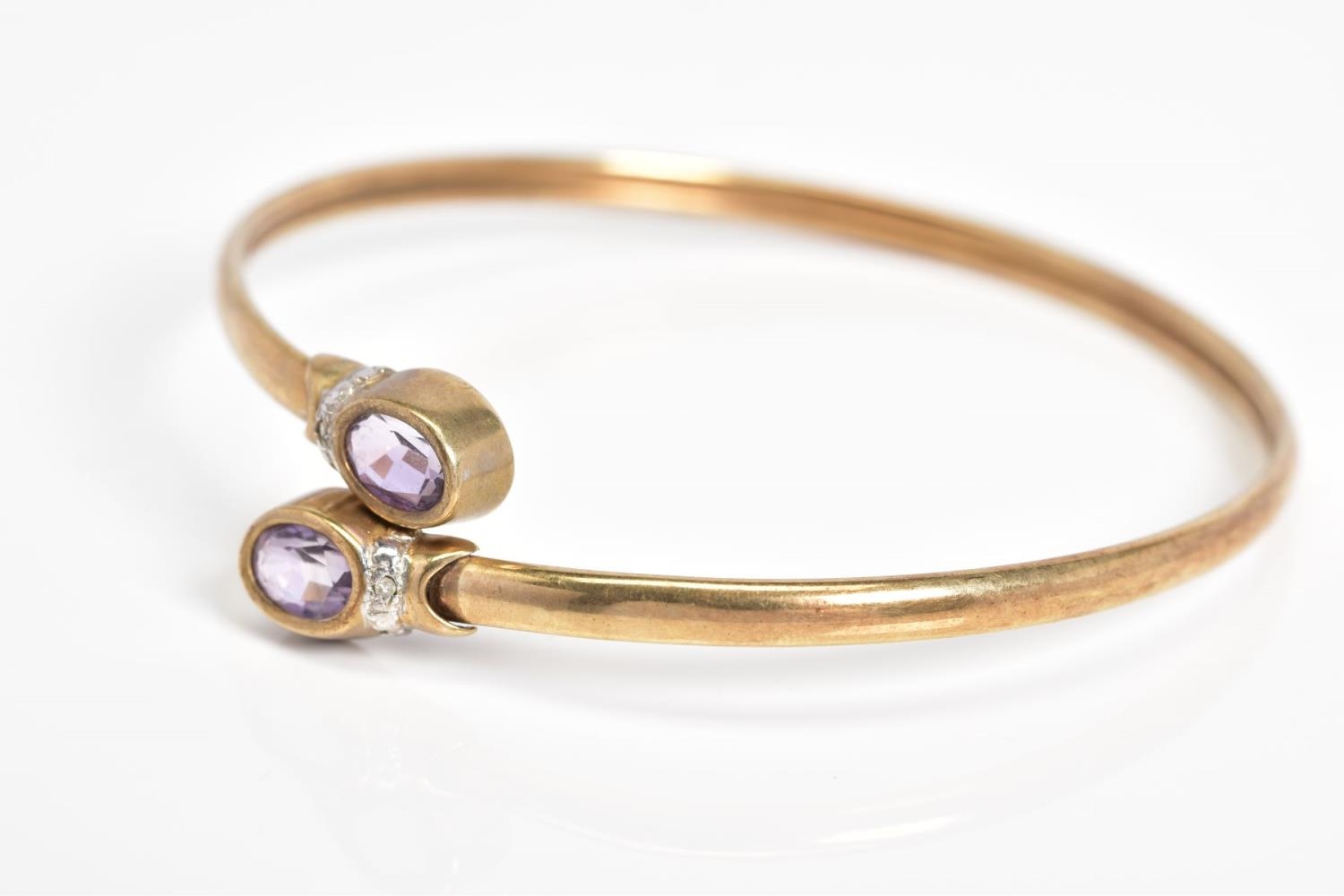 A 9CT GOLD CROSSOVER BANGLE, the open bangle set with two oval cut amethyst and single cut diamond detail, to the plain polished bangle, with a 9ct hallmark for Birmingham, approximate diameter 62mm, approximate weight 7.2 grams